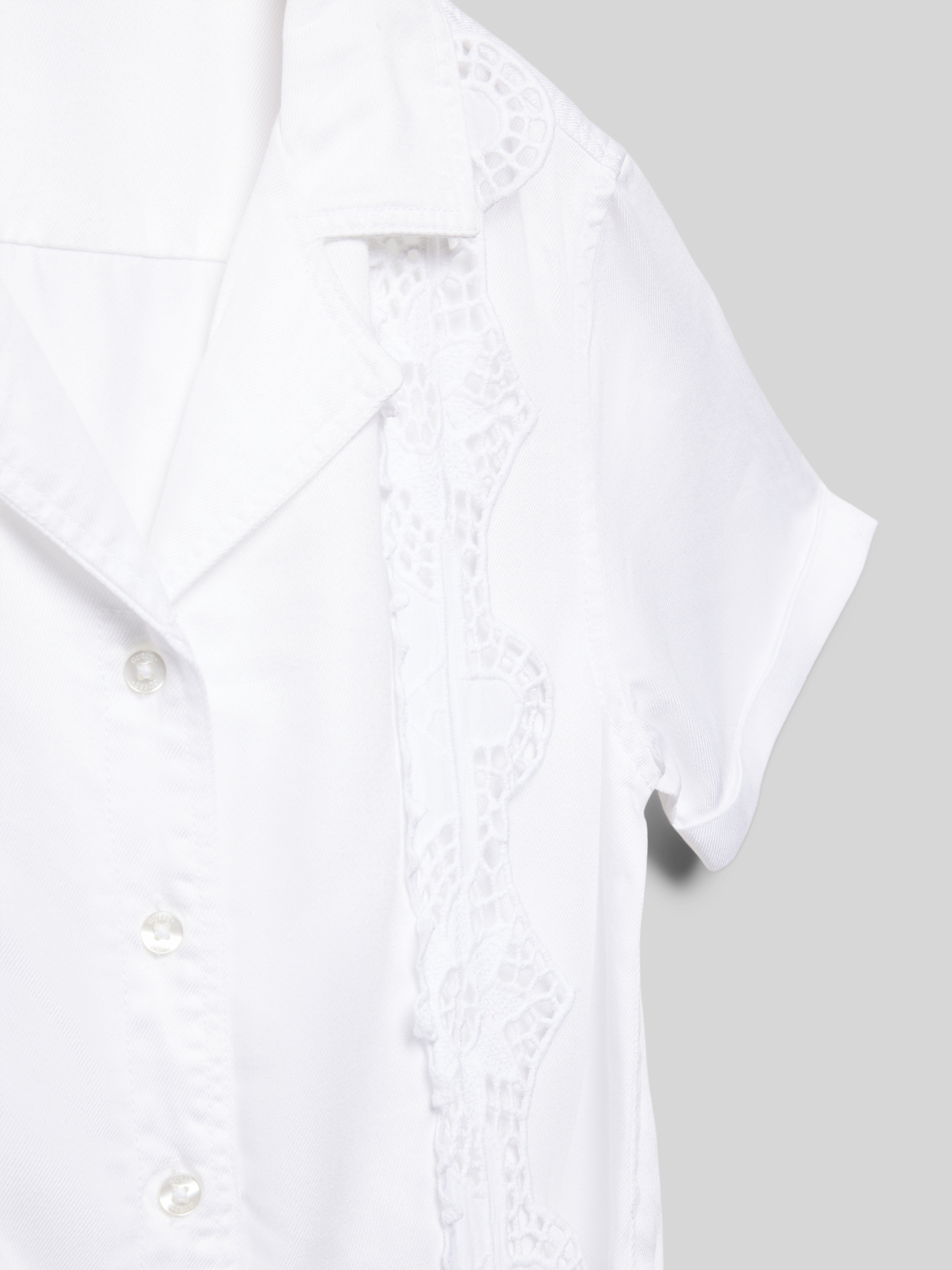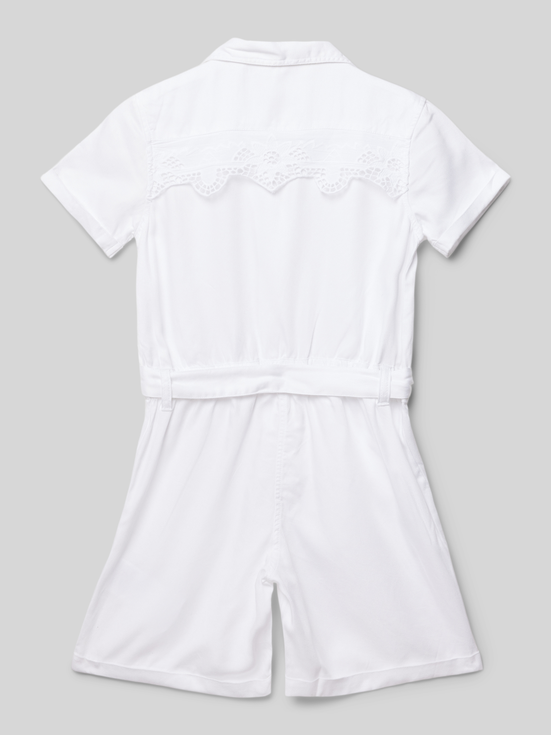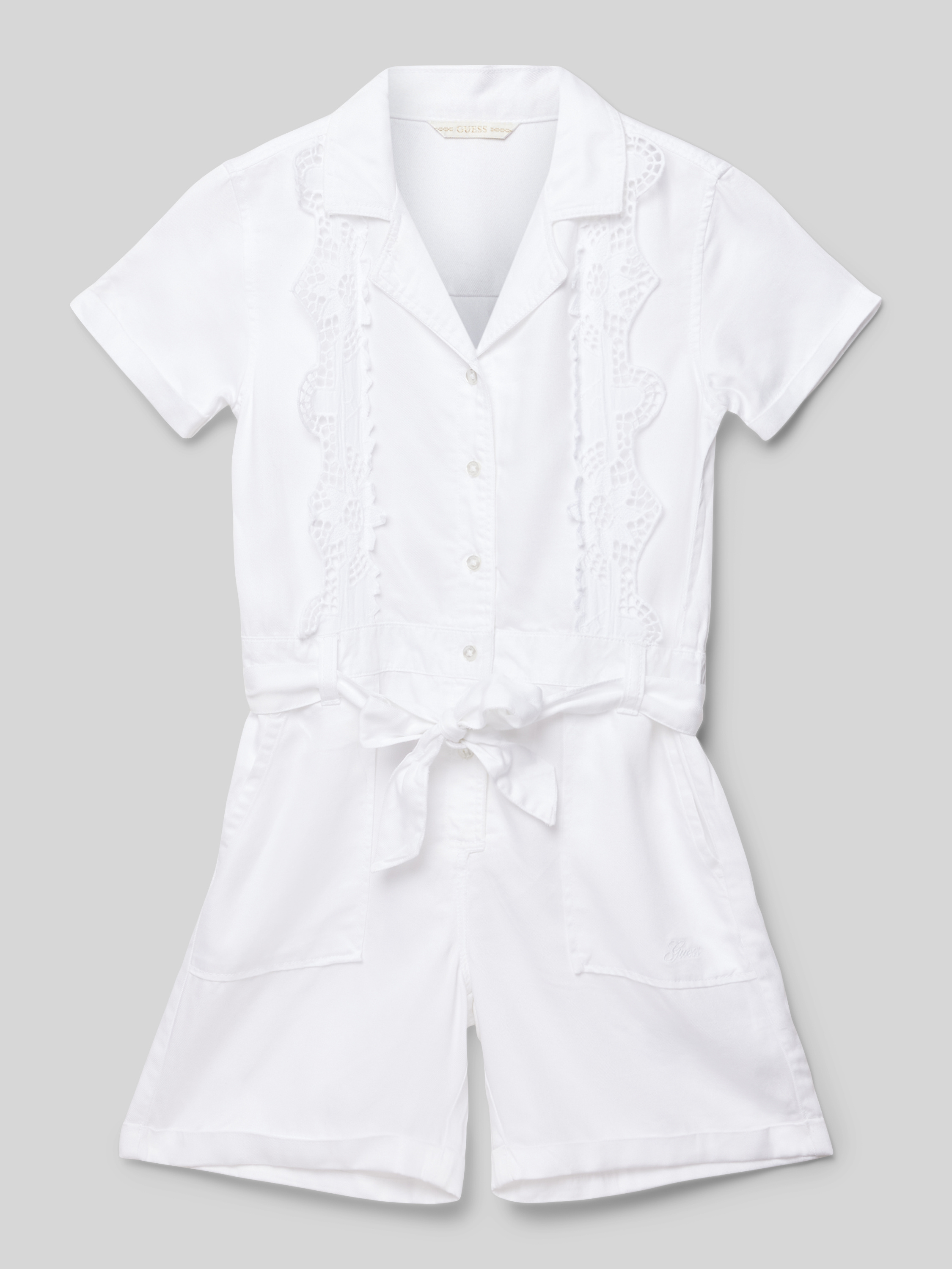Der GUESS Jumpsuit mit Bindegürtel kombiniert eine schlichte, unifarbene Optik mit einem Spitzenbesatz, der subtile Eleganz verleiht. Der Regular Fit sorgt für angenehmen Tragekomfort, während reine Baumwolle für ein weiches Hautgefühl sorgt. Der Bindegürtel ermöglicht individuelle Anpassung und Stil.