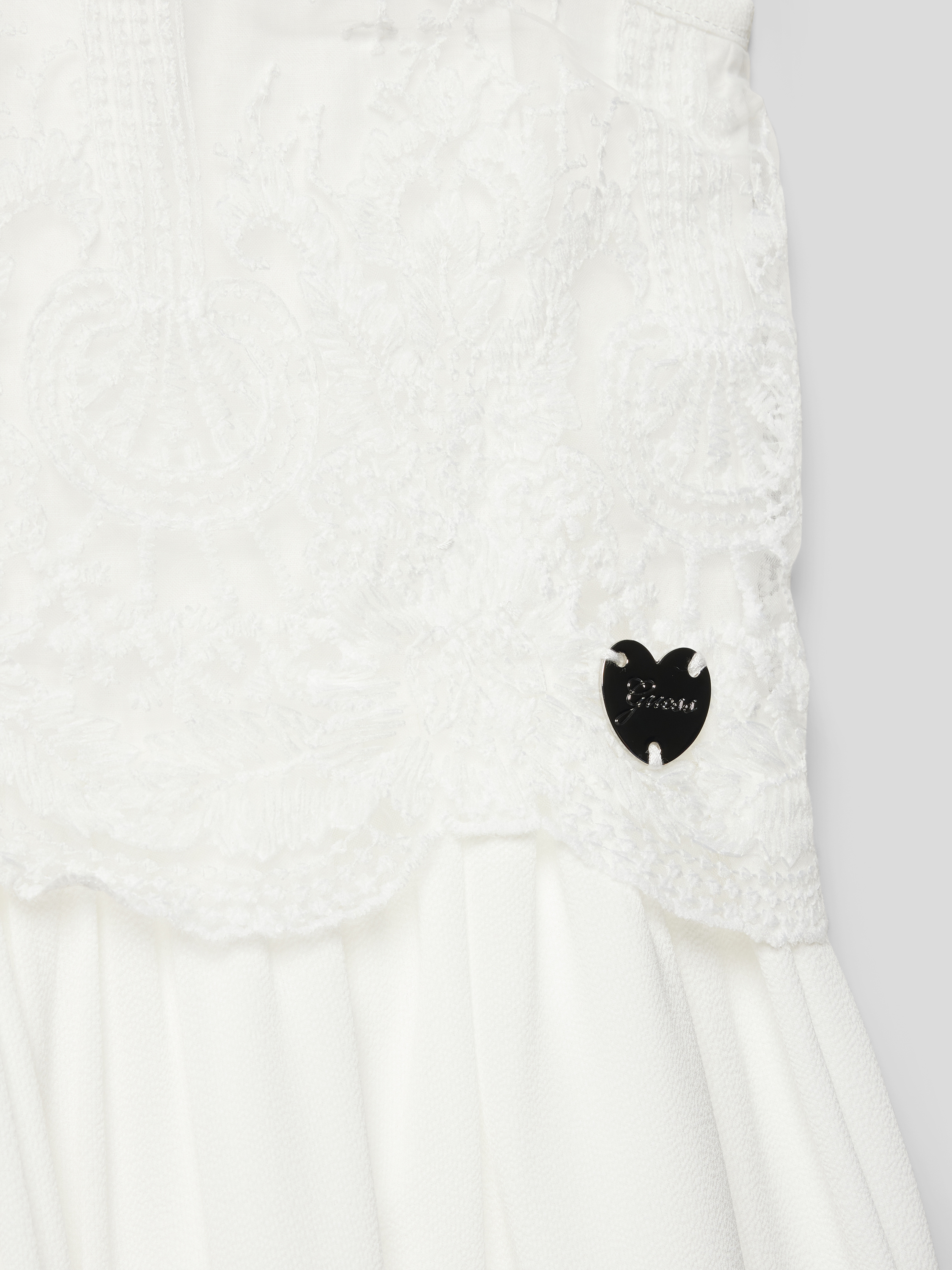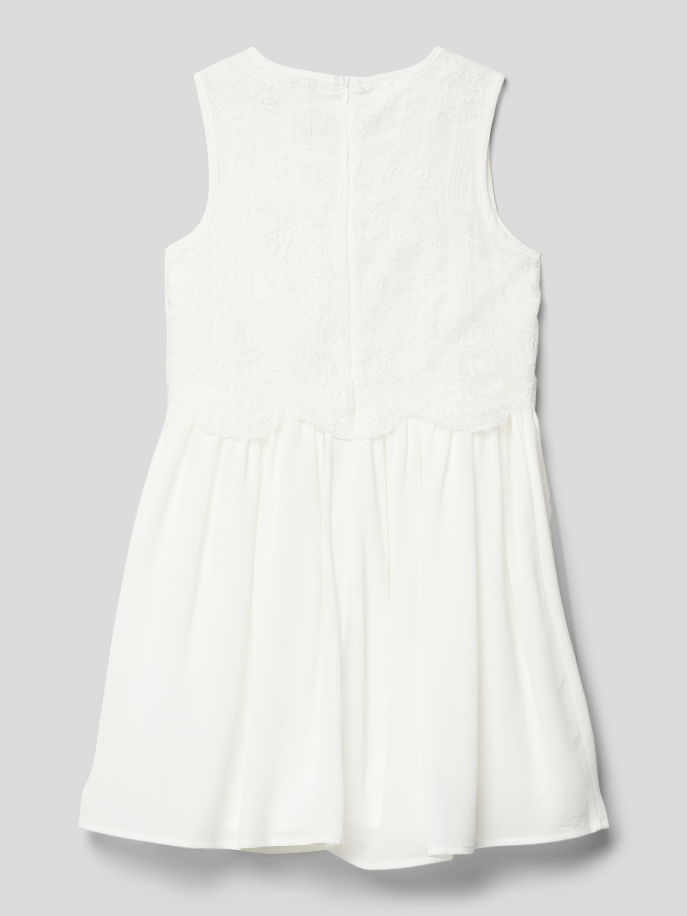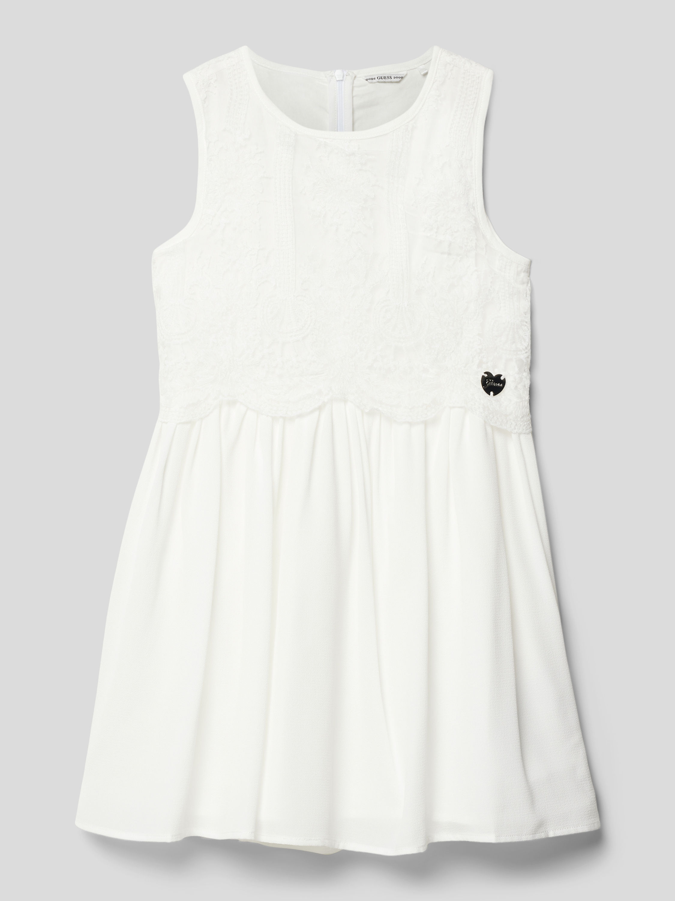 Das Kinder Kleid von GUESS im Stufen-Look kombiniert einen geraden Schnitt mit einem zarten Spitzenbesatz, der eine verspielte Note hinzufügt. Der Material-Mix mit Stretch-Anteil sorgt für angenehme Bewegungsfreiheit, während das ärmellose Design an warmen Tagen eine luftige Leichtigkeit bietet.