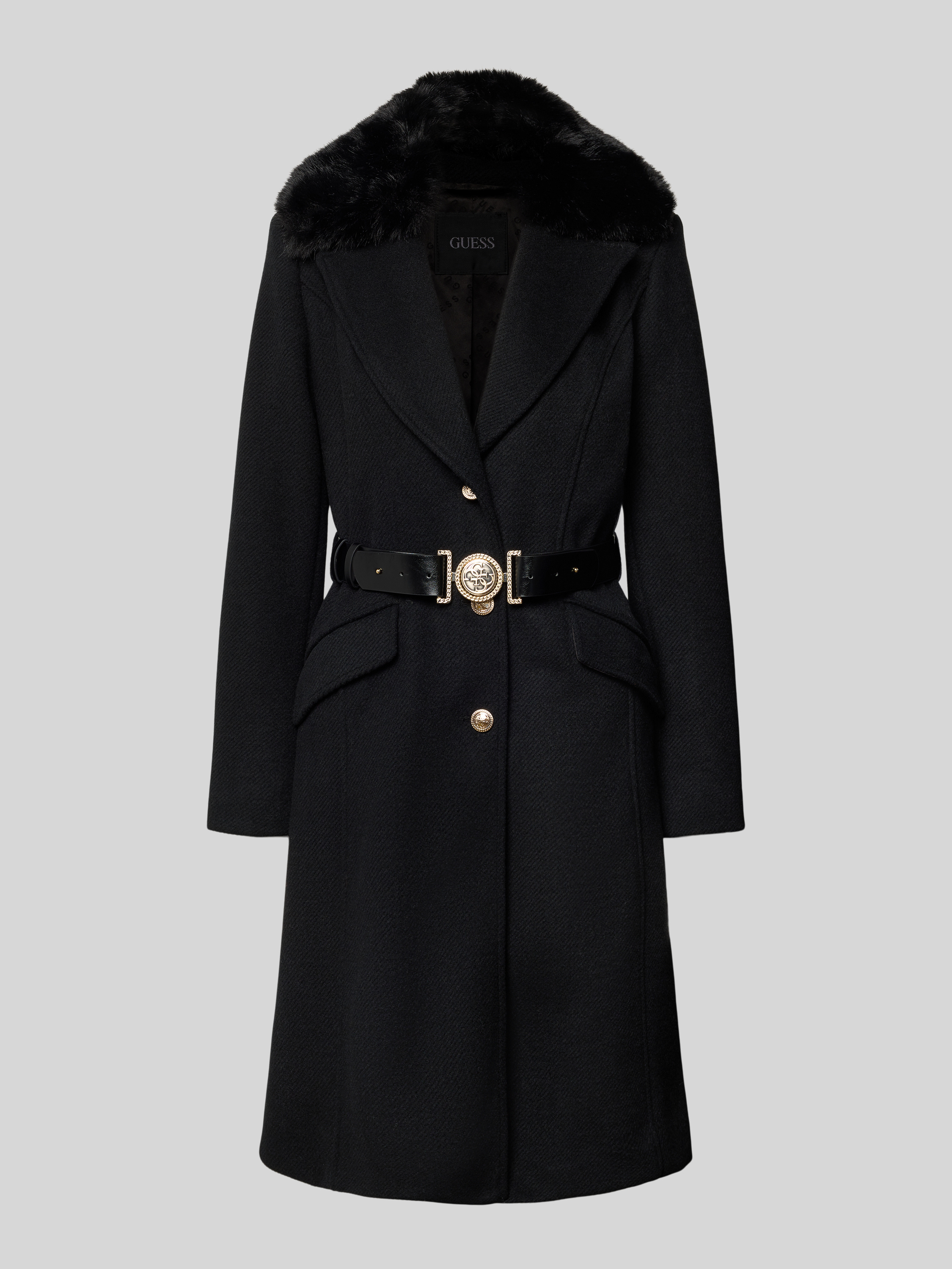 Der Mantel von Guess im Modell NEW PATRICE fällt durch seinen taillierten Schnitt und den Reverskragen mit Kunstfell auf, was eine feminine Silhouette unterstreicht. Pattentaschen und ein Gürtel ergänzen das Design, sodass sich Stauraum und Passform unkompliziert anpassen lassen. So kann man an kühleren Tagen stilvoll und komfortabel unterwegs sein.