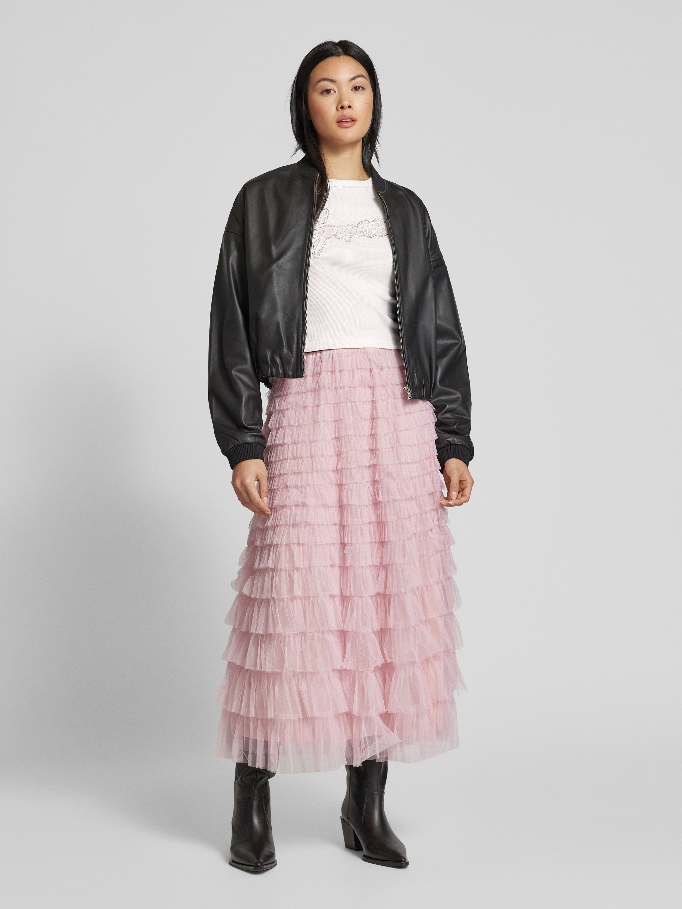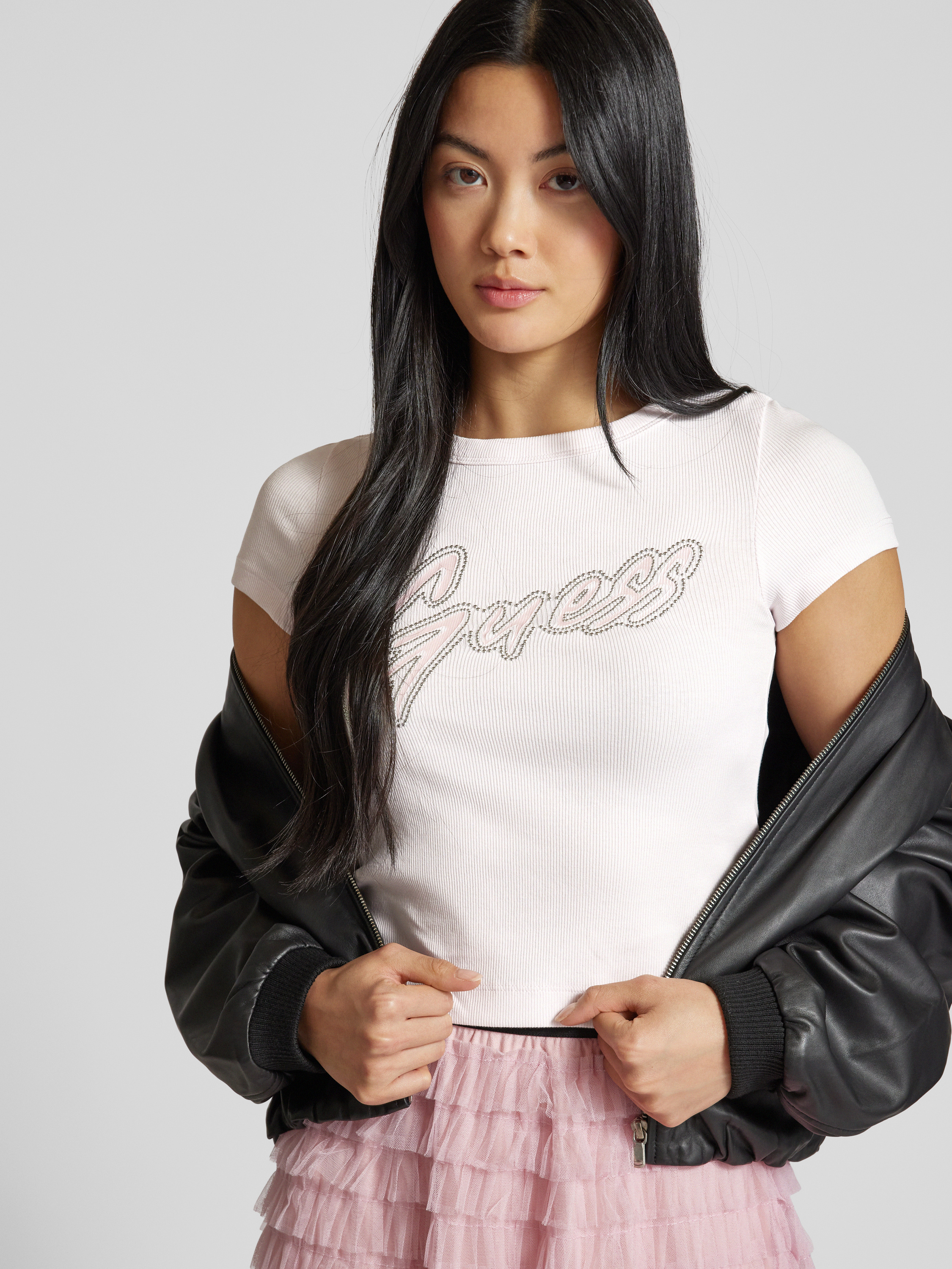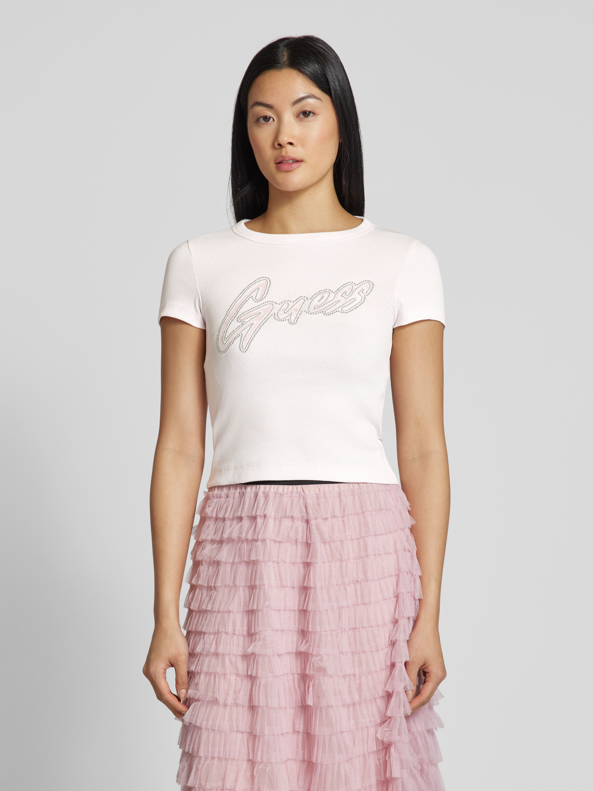 Das Damen T-Shirt von GUESS kombiniert einen Baumwoll-Elasthan-Mix mit einem klassischen Regular Fit, der angenehm auf der Haut liegt. Der gerippte Rundhalsausschnitt sorgt für eine bequeme Passform, während der Label-Print und der Ziersteinbesatz dezente Akzente setzen. Ideal für vielseitige Alltagsoutfits.
