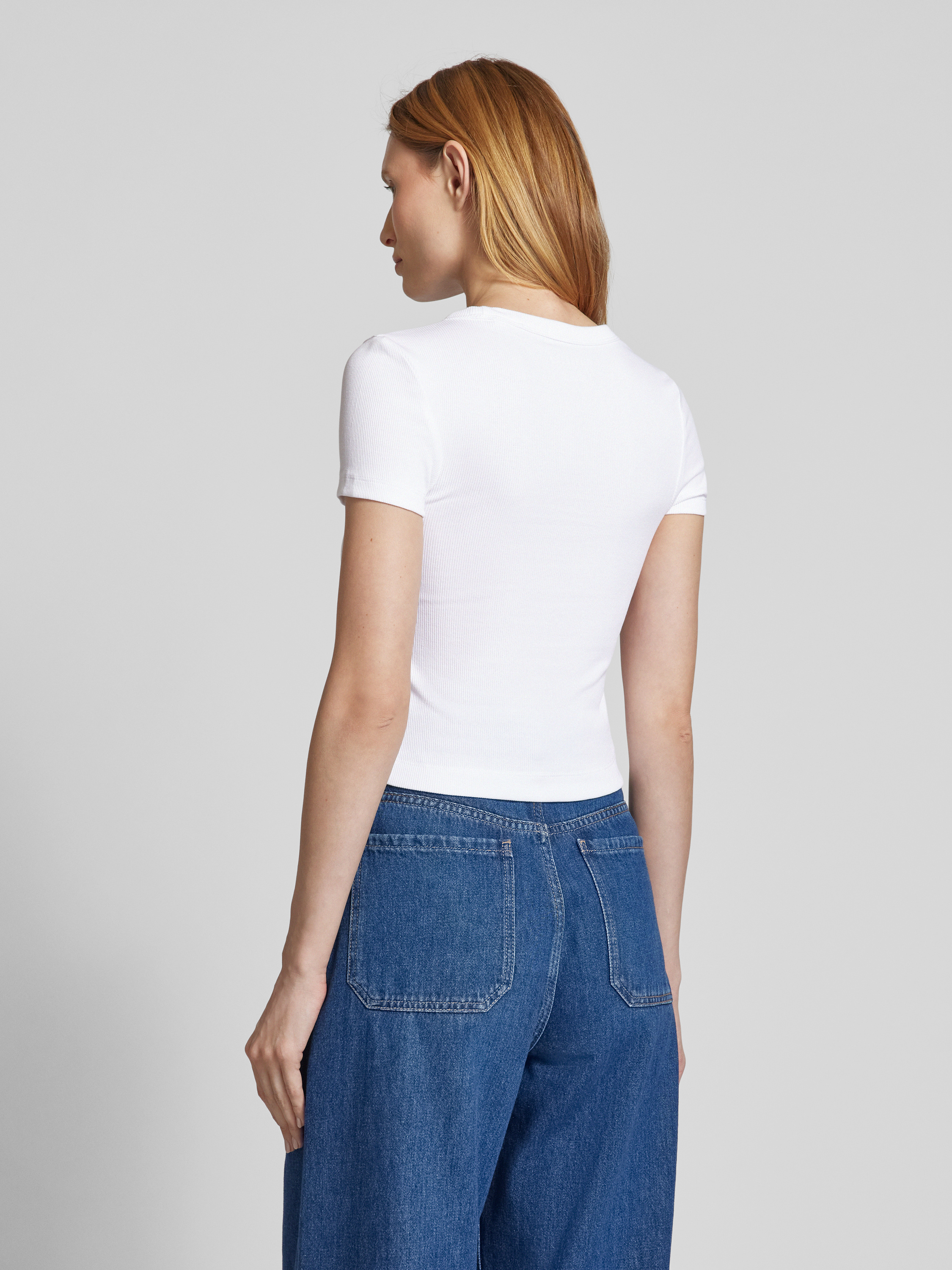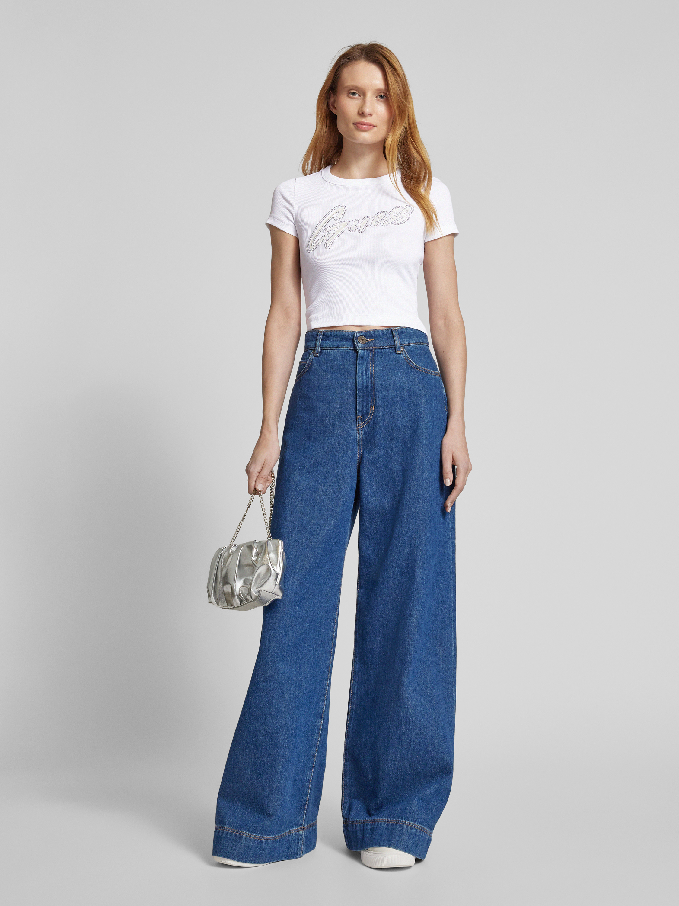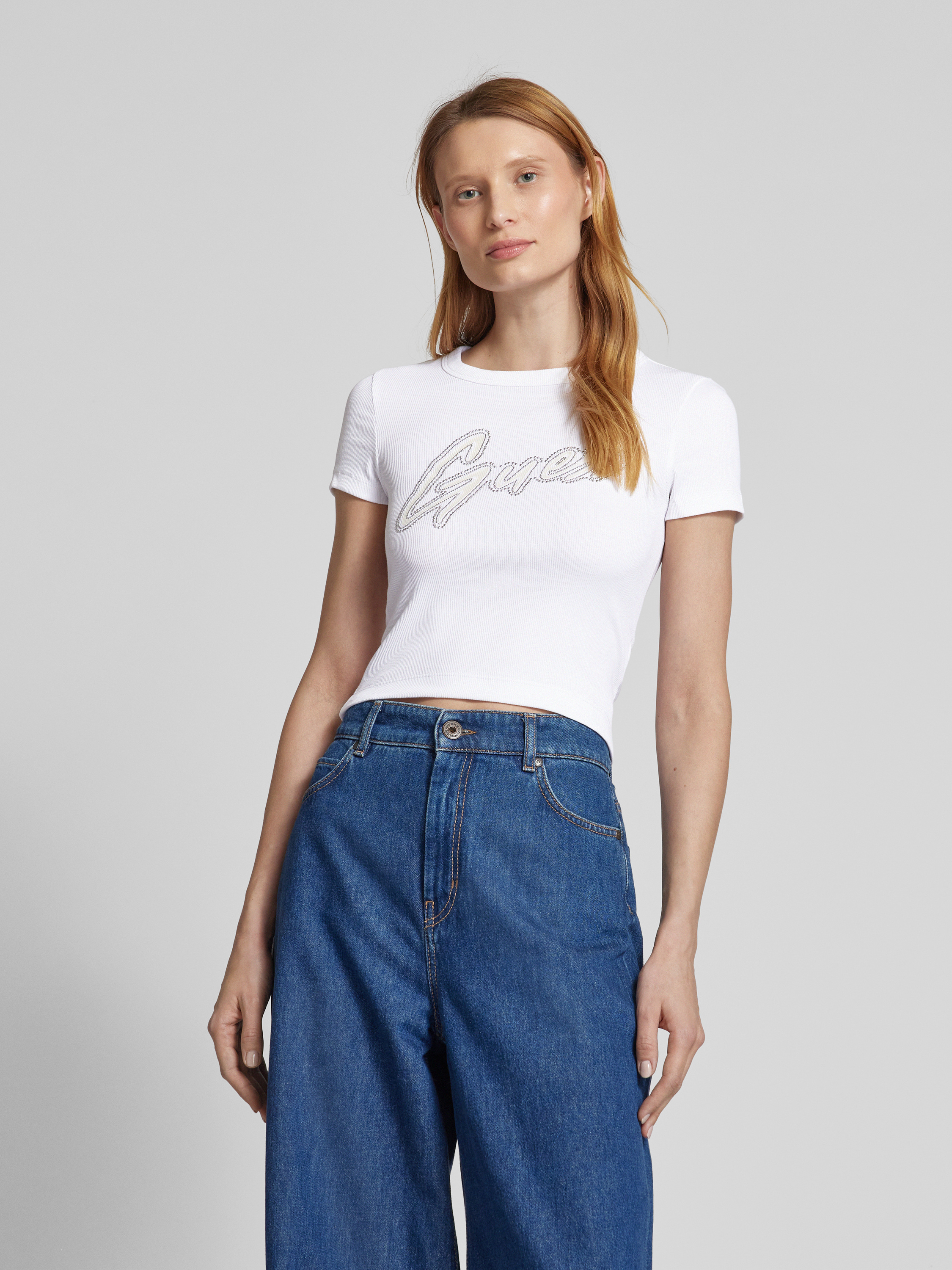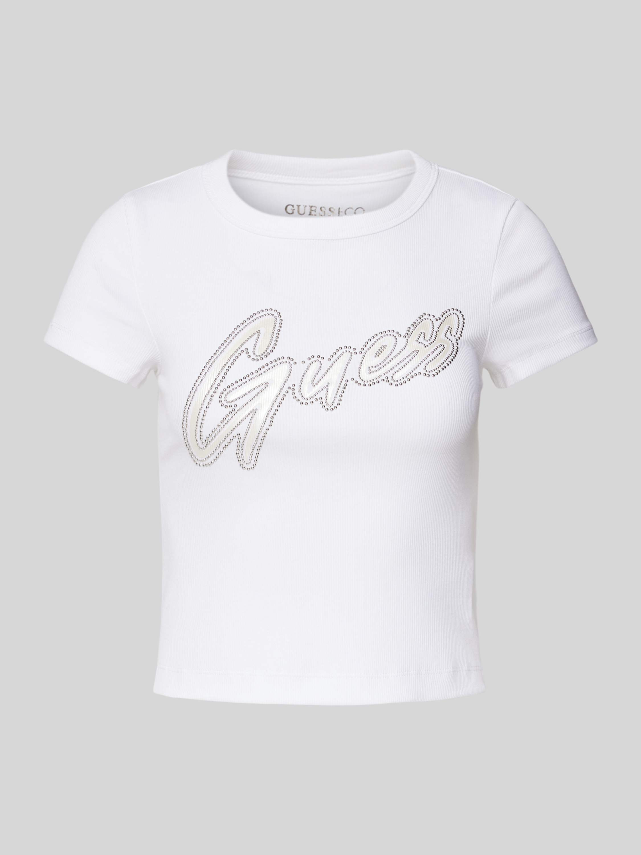 Das Damen T-Shirt von GUESS kombiniert einen Baumwoll-Elasthan-Mix mit einem klassischen Regular Fit, der angenehm auf der Haut liegt. Der gerippte Rundhalsausschnitt sorgt für eine bequeme Passform, während der Label-Print und der Ziersteinbesatz dezente Akzente setzen. Ideal für vielseitige Alltagsoutfits.