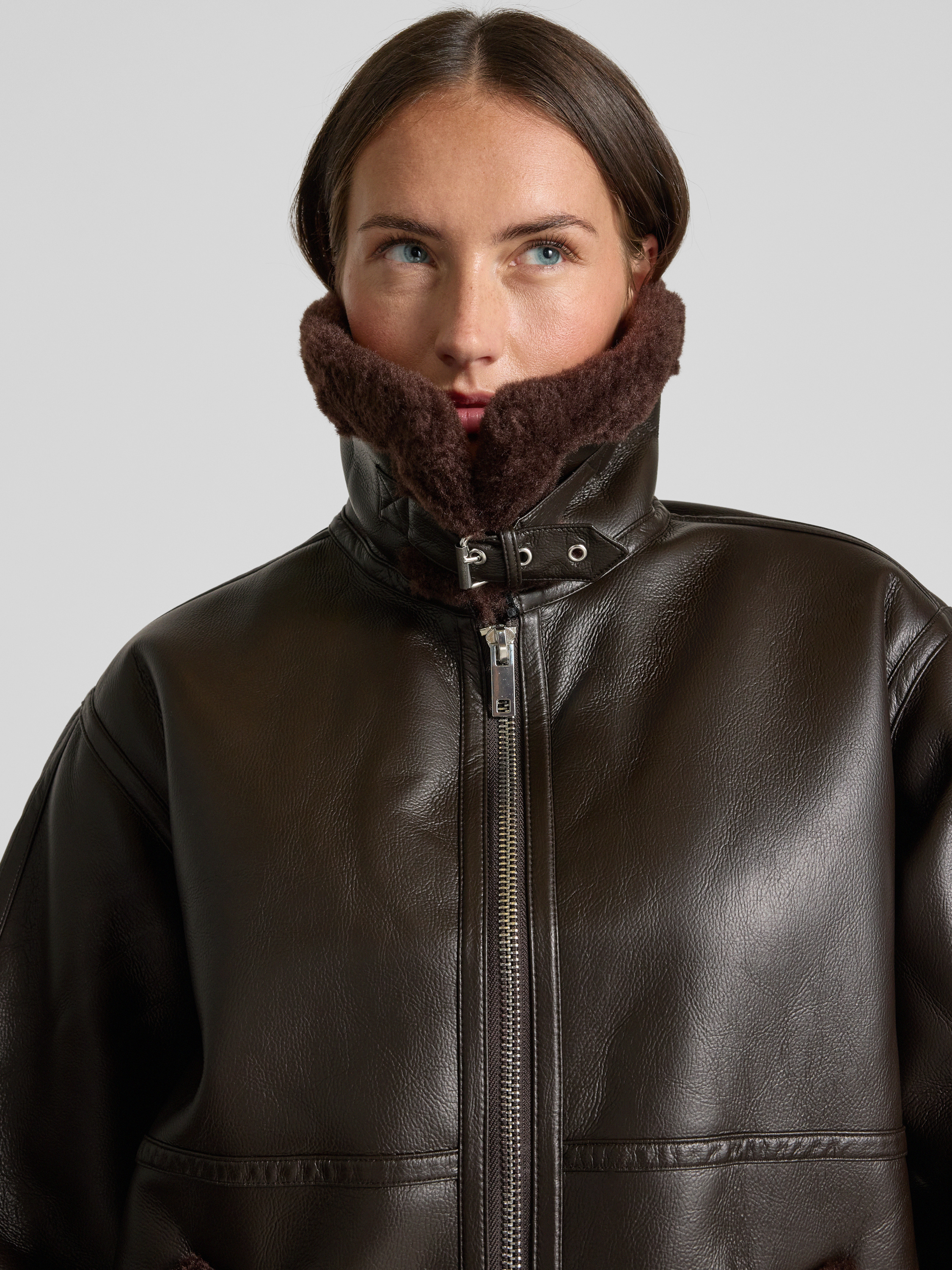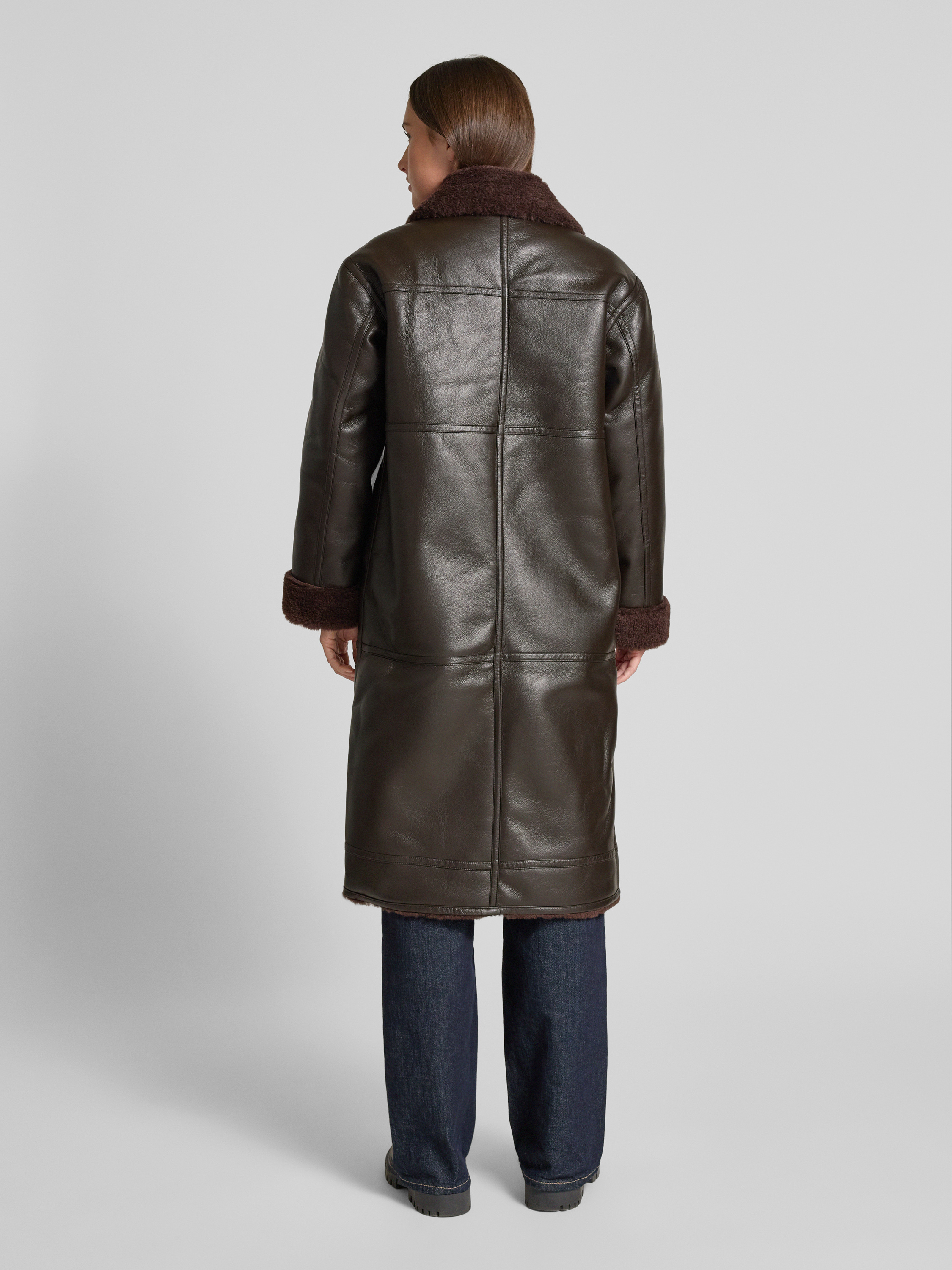 Der Mantel von GUIDO MARIA KRETSCHMER WOMAN zeigt sich im Modell 'Enie' mit lockerem Schnitt, der Bewegungsfreiheit schafft und vielseitige Kombinationen ermöglicht. Die Leder-Optik verleiht dem Design eine moderne Note, während ein Kunstfellbesatz am Umlegekragen Akzente setzt. Dank praktischer Eingrifftaschen bleibt Platz für kleine Dinge im Alltag.