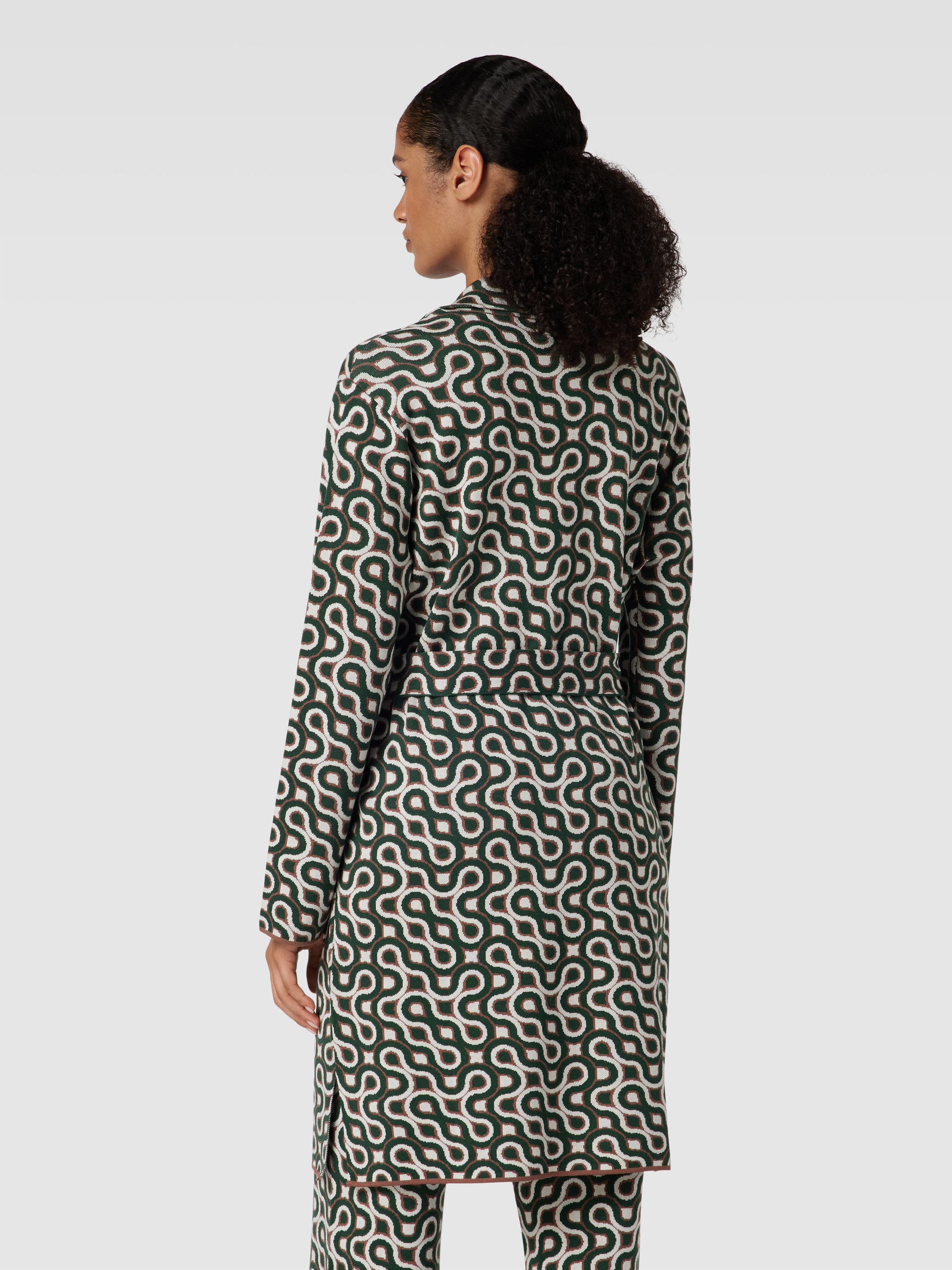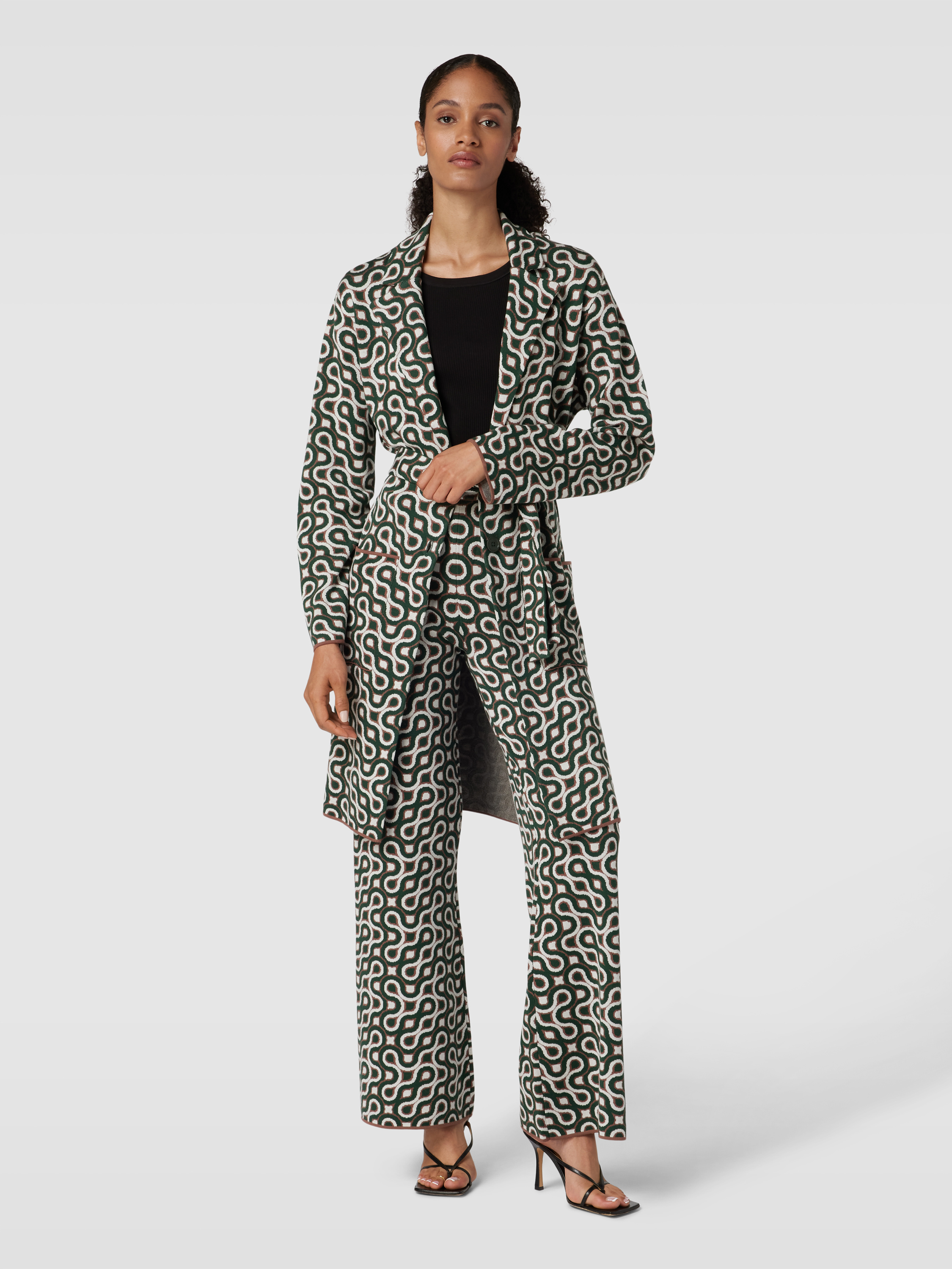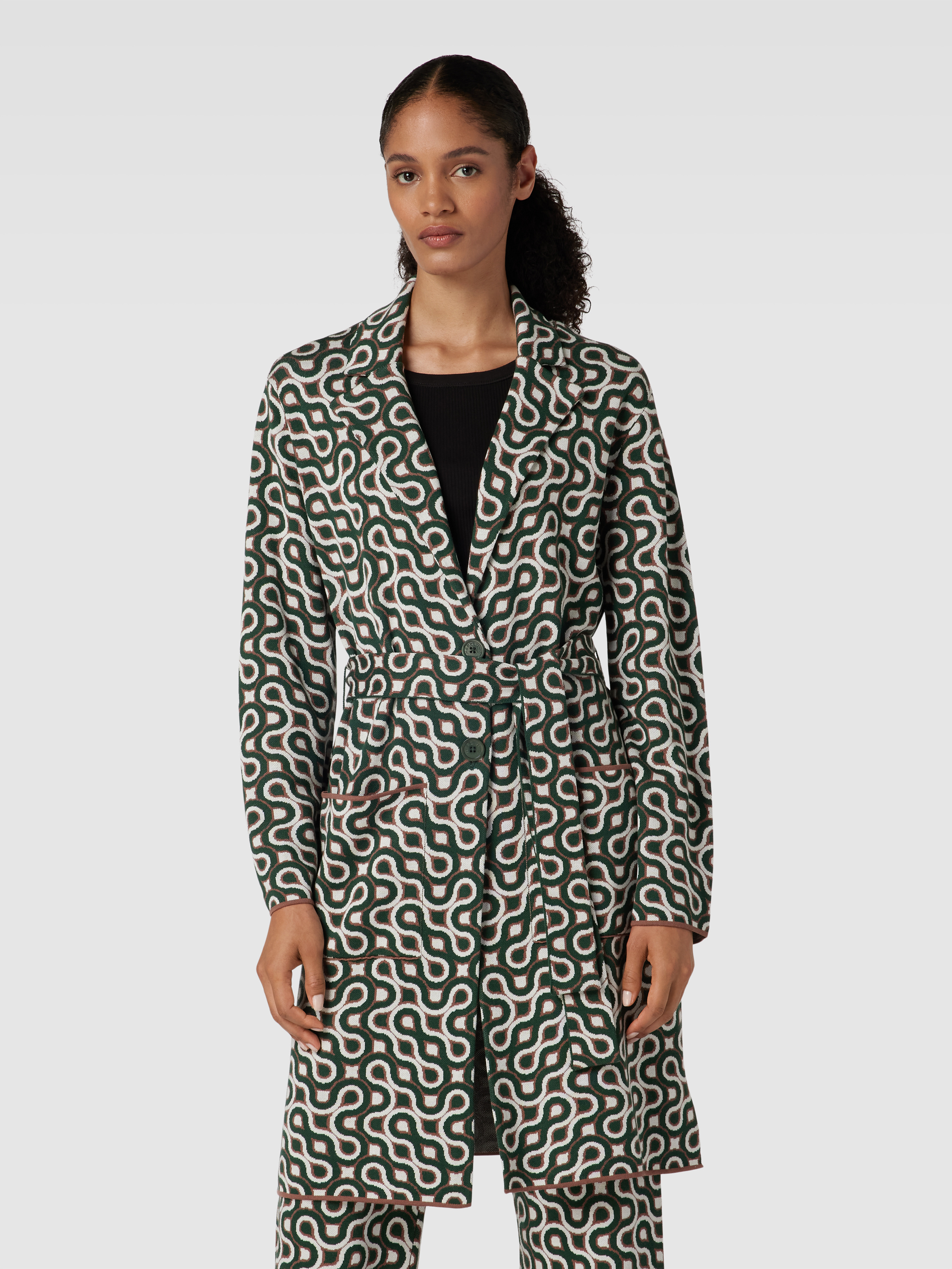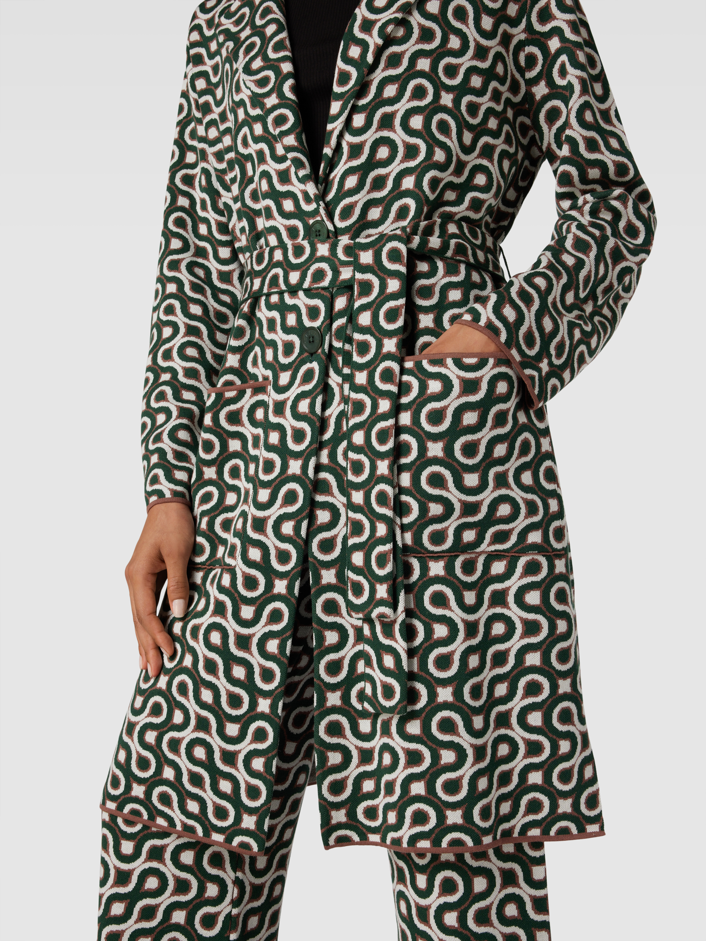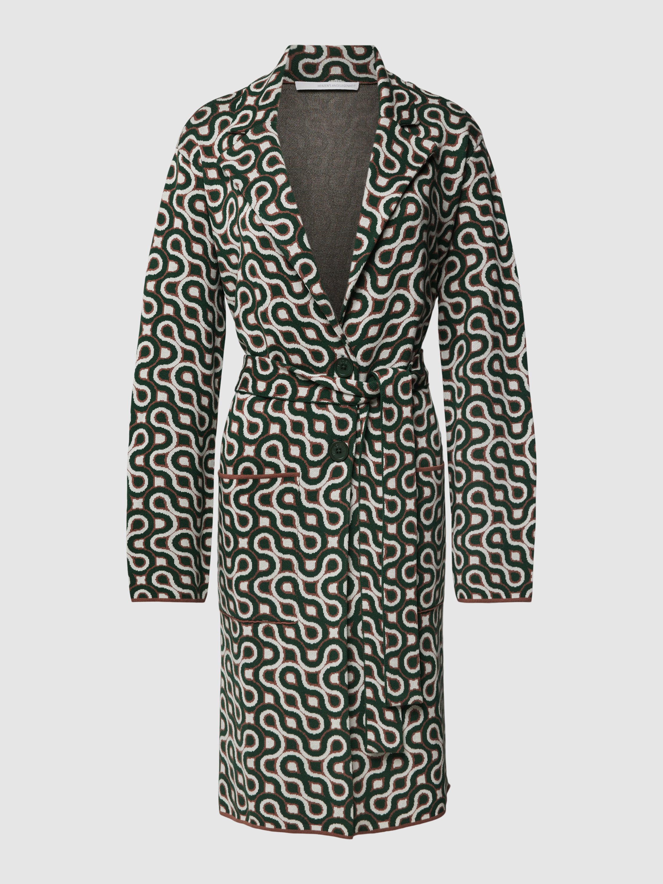 Der Mantel von HERZENS fällt durch sein Allover-Muster direkt ins Auge und schmiegt sich dank taillierter Passform angenehm an die Figur. Das Material aus Lyocell-Baumwoll-Mix fühlt sich weich auf der Haut an und sorgt für ein leichtes Tragegefühl. Ein Reverskragen, Gürtel und praktische Eingrifftaschen runden das Design funktional ab.