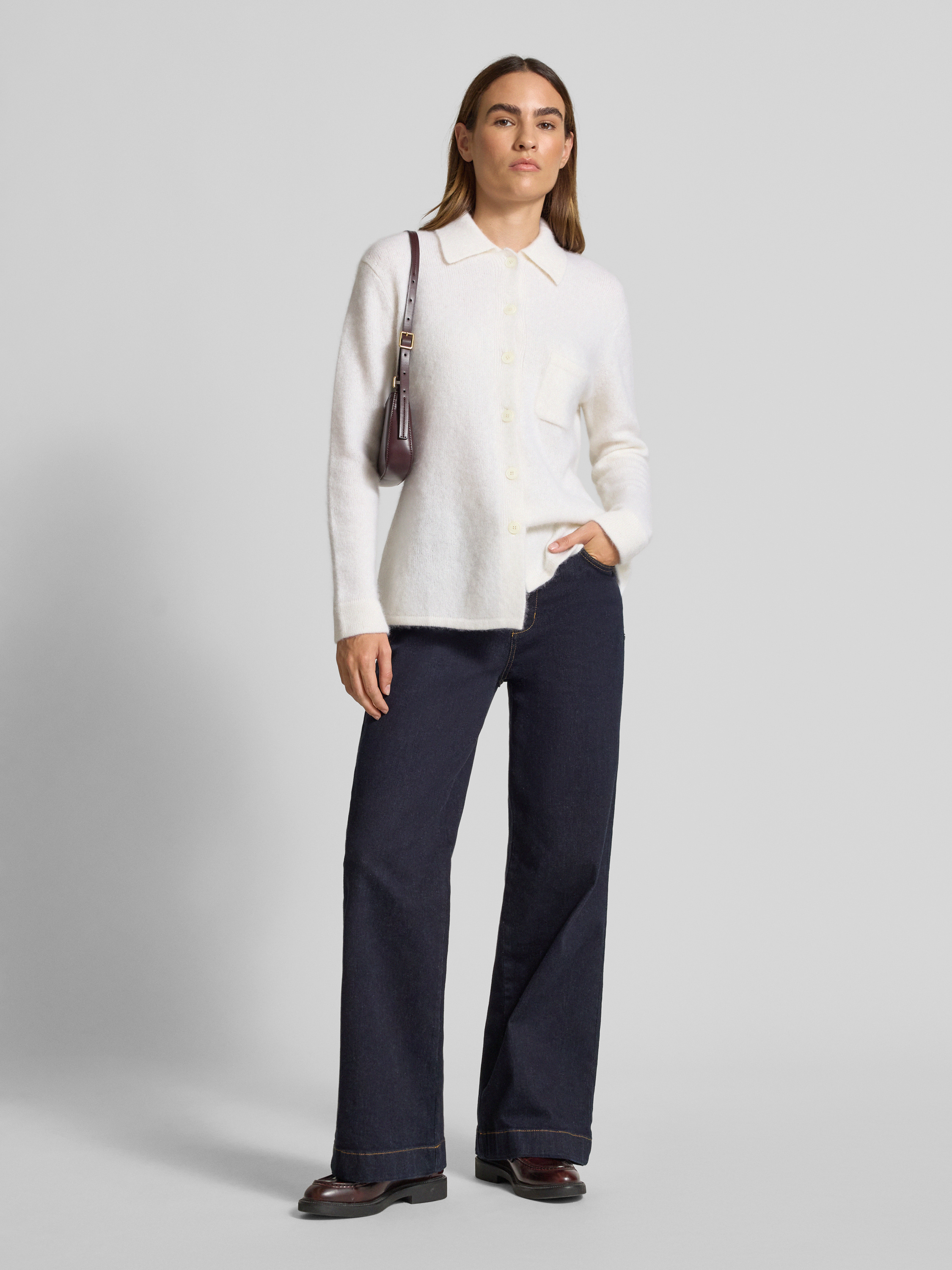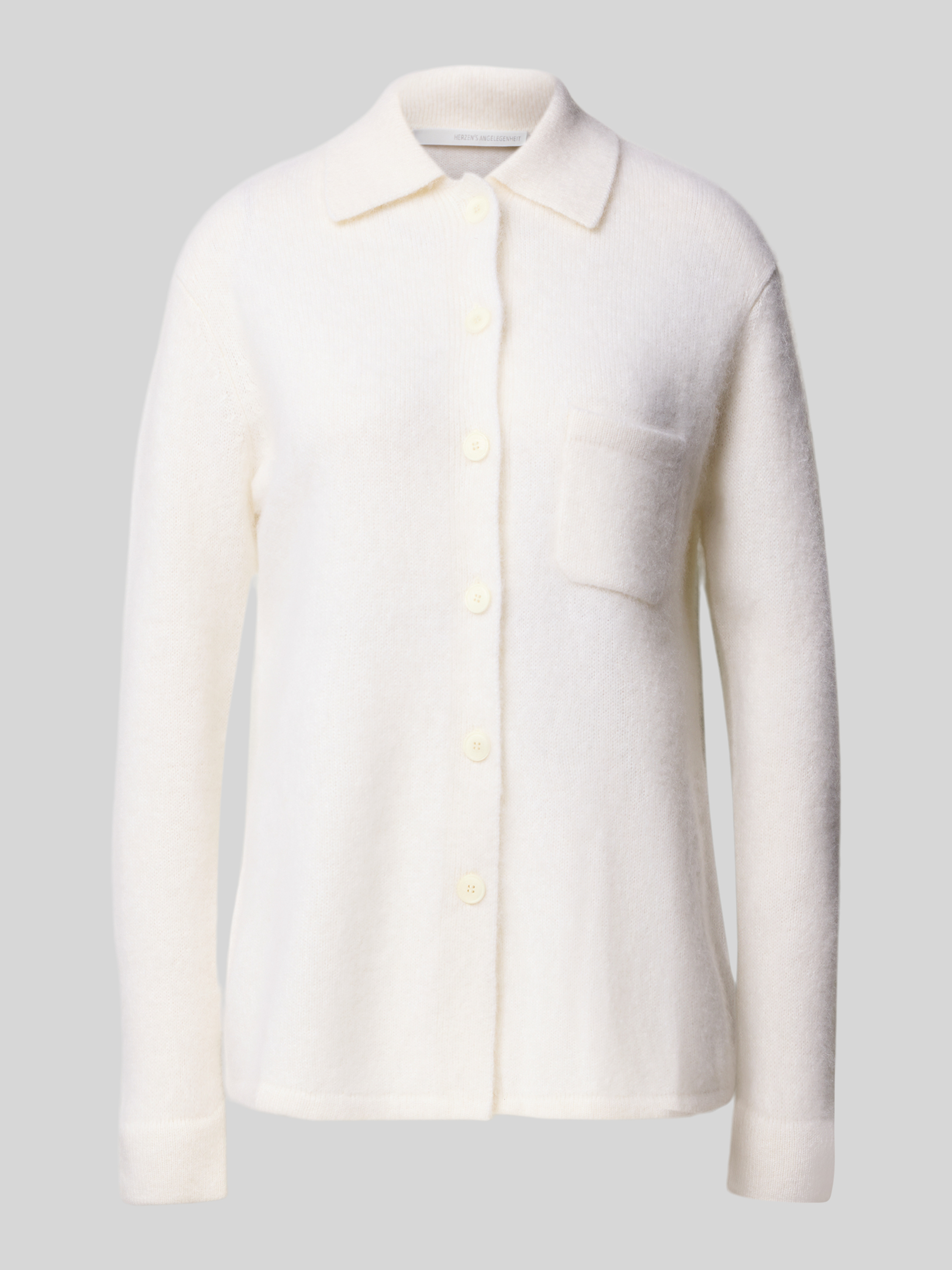 Die Damen Strickjacke von HERZENS besteht aus einem weichen Kaschmir-Baumwoll-Mix, der sich angenehm auf der Haut anfühlt und für ein behagliches Tragegefühl sorgt. Durch den lockeren Schnitt fällt sie entspannt und lässt sich vielseitig kombinieren. Ein Kentkragen, eine Knopfleiste sowie eine praktische Brusttasche runden das zeitlose Design ab.