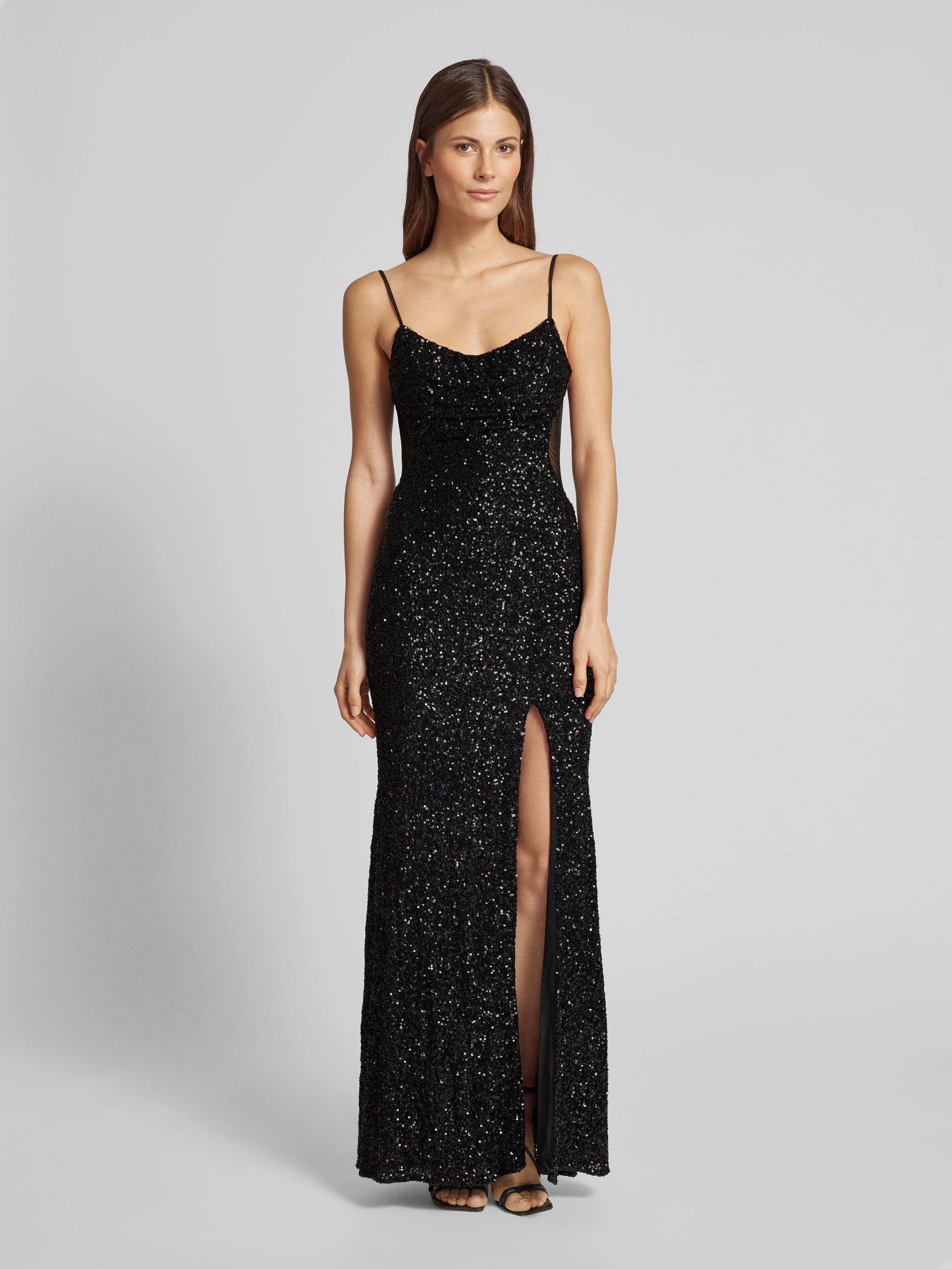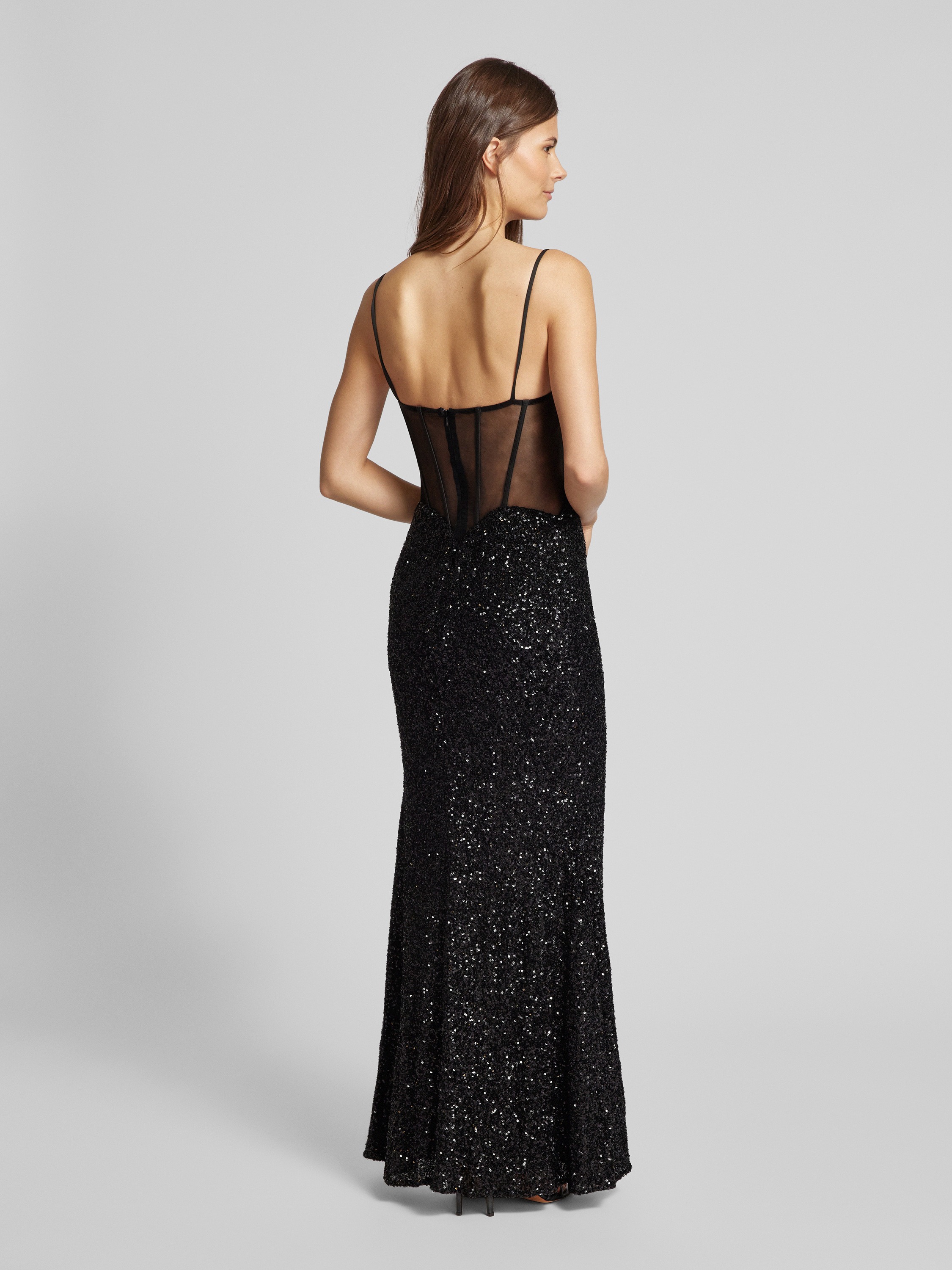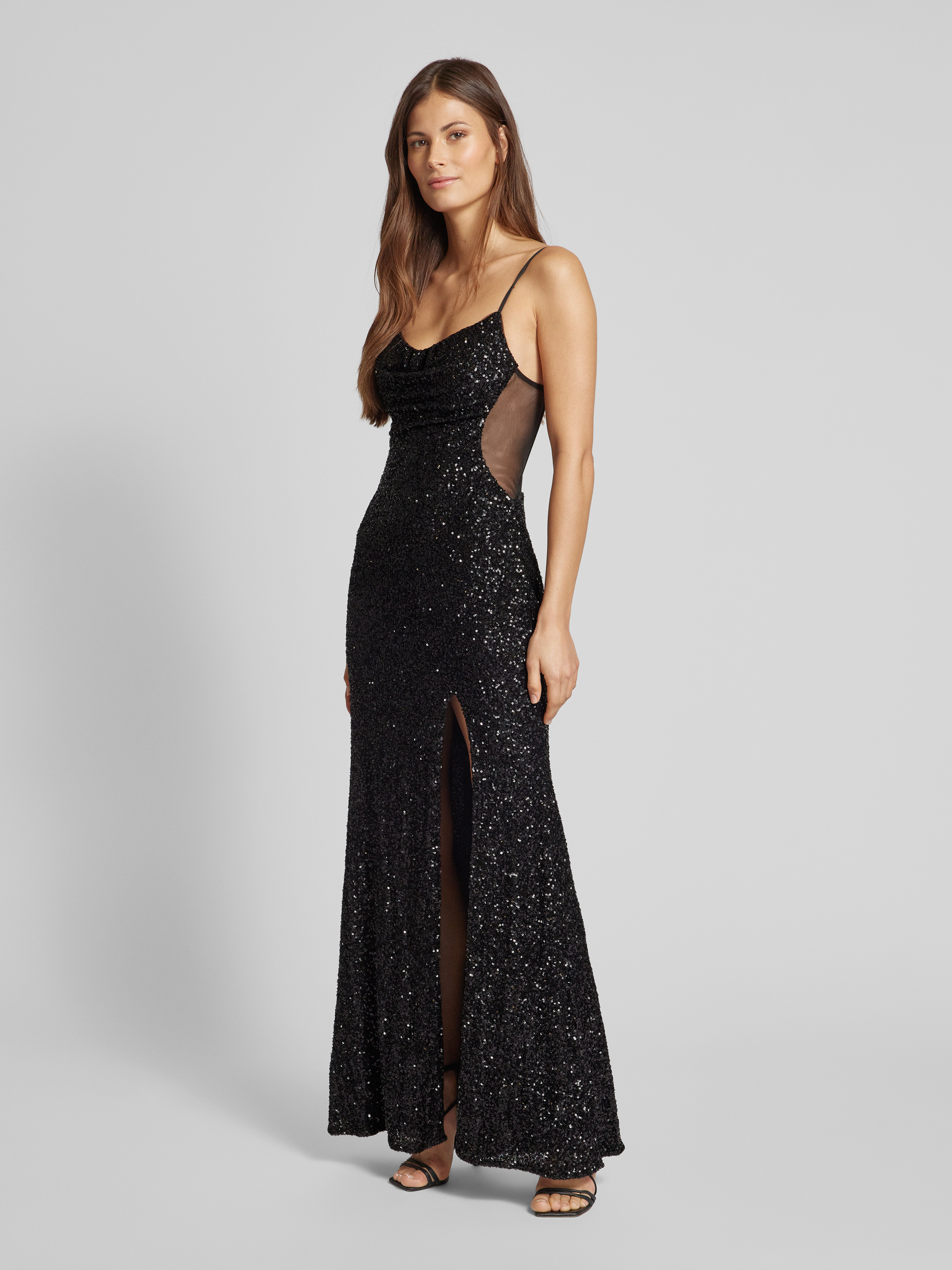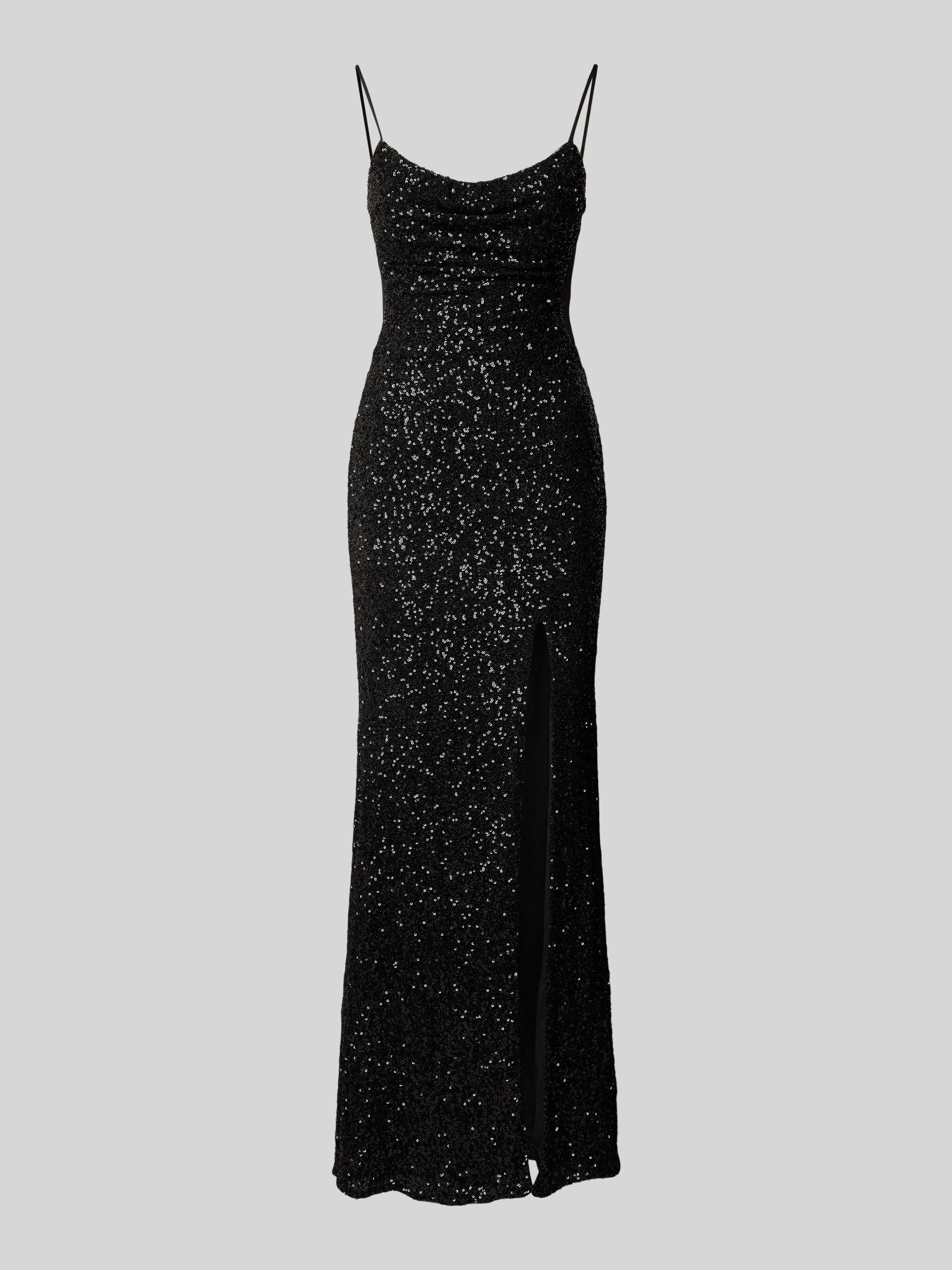 Das Abendkleid von Hey Kyla verbindet einen figurbetonten Schnitt mit funkelnden Pailletten und bietet durch die Maxilänge und den Gehschlitz Bewegungsfreiheit. Die zarten Spaghettiträger verleihen dem Kleid eine elegante Note und machen es zu einem stilvollen Begleiter für besondere Anlässe.