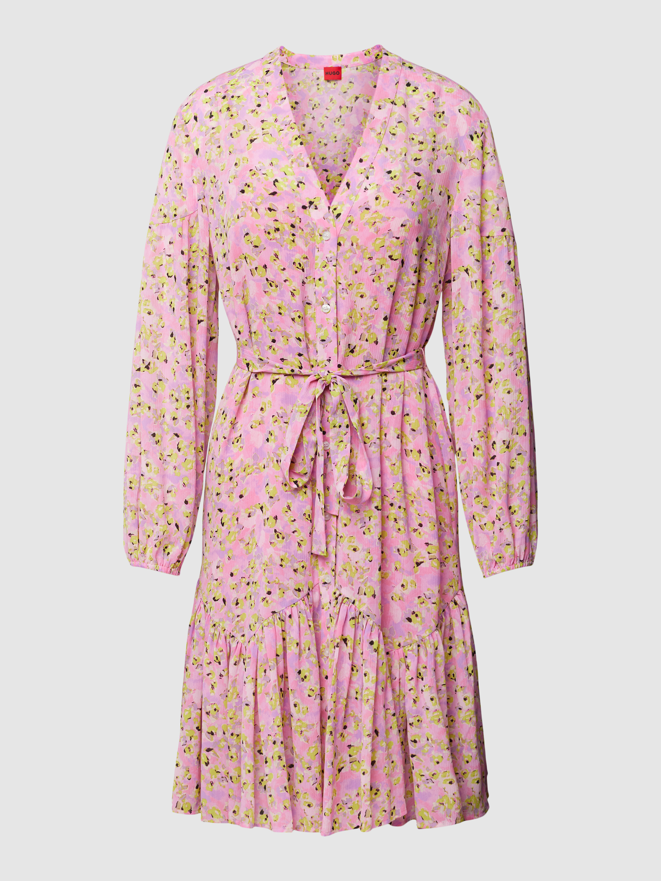 Das knielange Kleid 'Kawarda' von HUGO kombiniert einen taillierten Schnitt mit einem charmanten Allover-Muster, das durch den V-Ausschnitt und den Volantsaum stilvoll ergänzt wird. Der Bindegürtel verleiht zusätzliche Form und Flexibilität, während die Länge Eleganz und Alltagstauglichkeit verbindet.