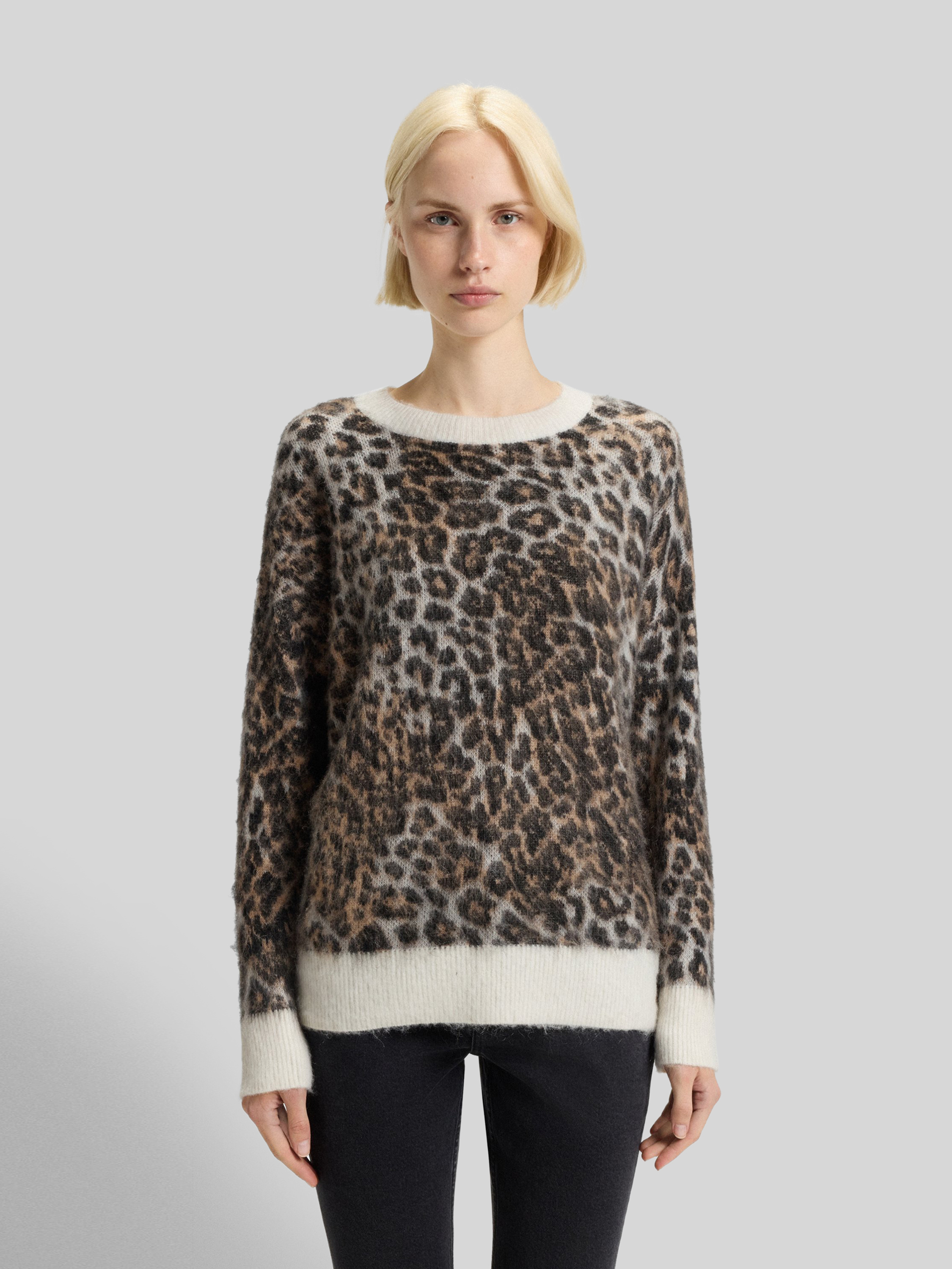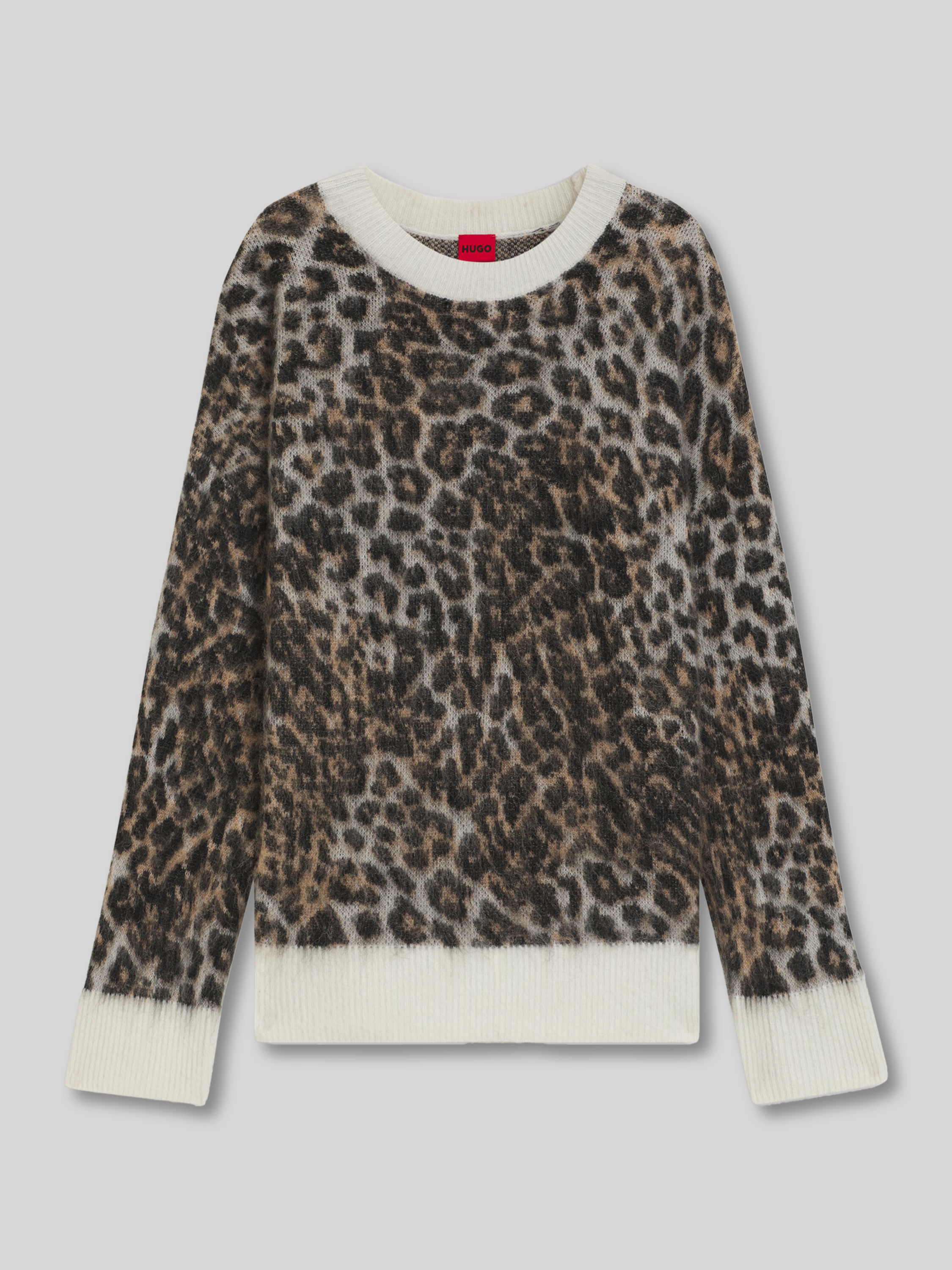 Der Damen Strickpullover von HUGO, Modell Seratu, kombiniert einen entspannten Loose-Fit mit einem auffälligen Animal Print in Allover-Muster. Durch den Alpaka-Anteil im Strick fühlt sich das Material angenehm weich an und wärmt spürbar. Dank Crew Neck und langen Ärmeln eignet sich das Stück vielseitig für kühlere Tage.