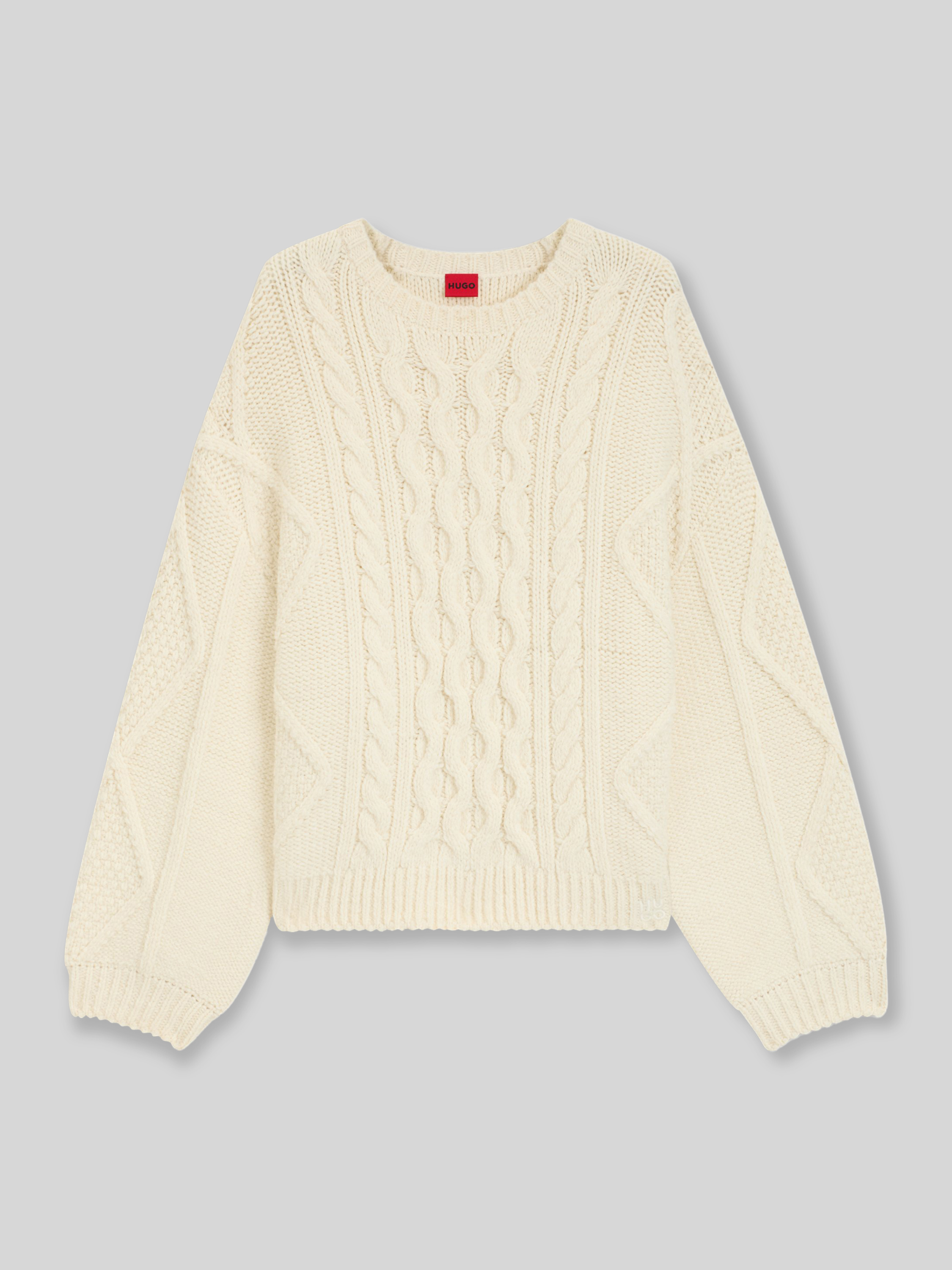 Der Damen Strickpullover von HUGO, Modell 'Saicos', vereint einen Oversized-Schnitt mit markantem Zopfmuster und überschnittenen Schultern. Durch die Ballonärmel und den Rundhals entsteht ein legerer Eindruck, der unkompliziert kombiniert werden kann. Die angenehme Strickverarbeitung sorgt für spürbaren Tragekomfort im Alltag.