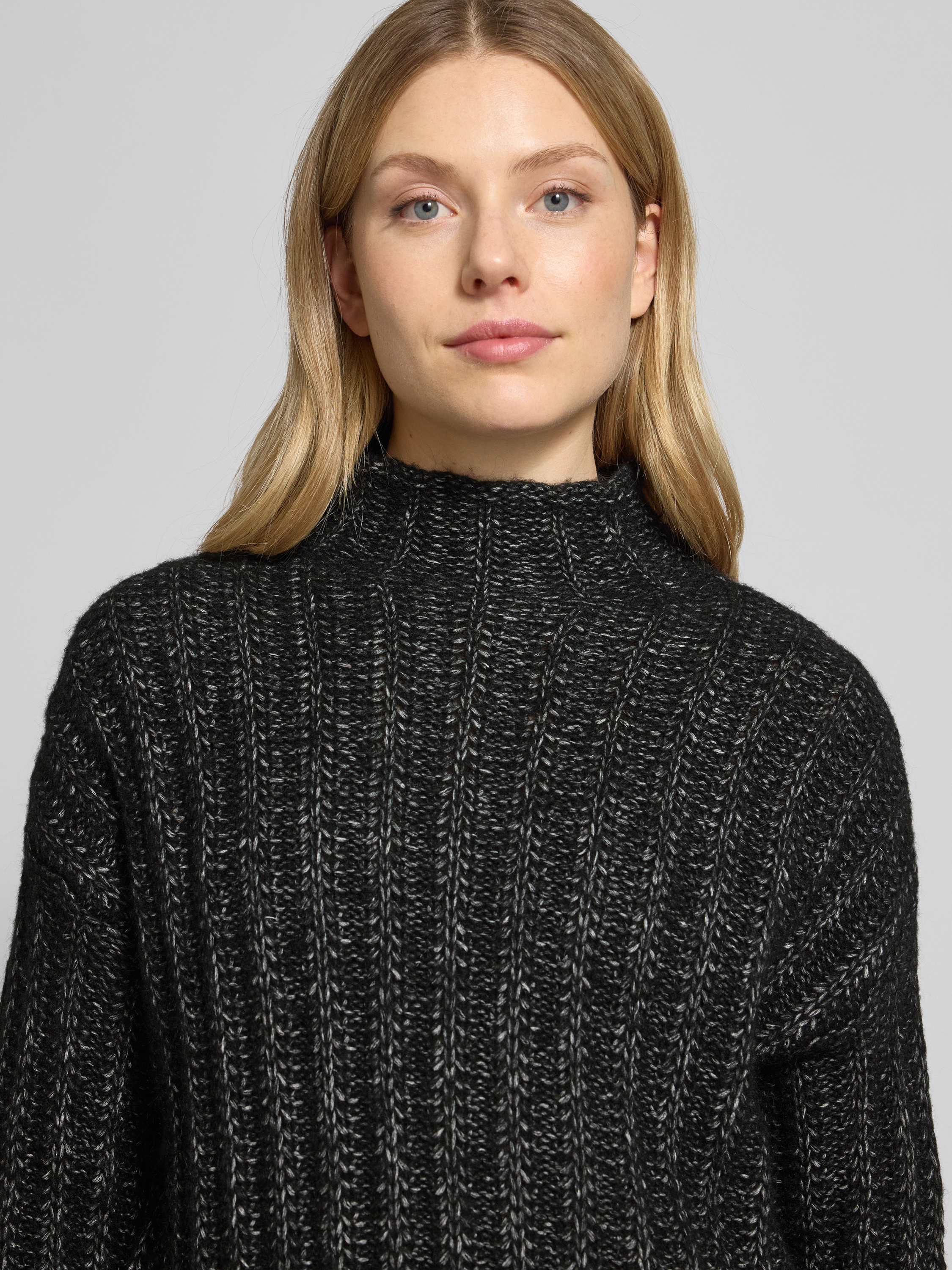 Der Damen Strickpullover von HUGO, Modell Safineyny, kombiniert eine angenehm lockere Passform mit melierter Optik und überschnittenen Schultern. Dank Woll-Anteil fühlt sich das Material weich an und wärmt dezent. Der Mock Neck ergänzt den entspannten Charakter und sorgt für einen modernen Akzent.