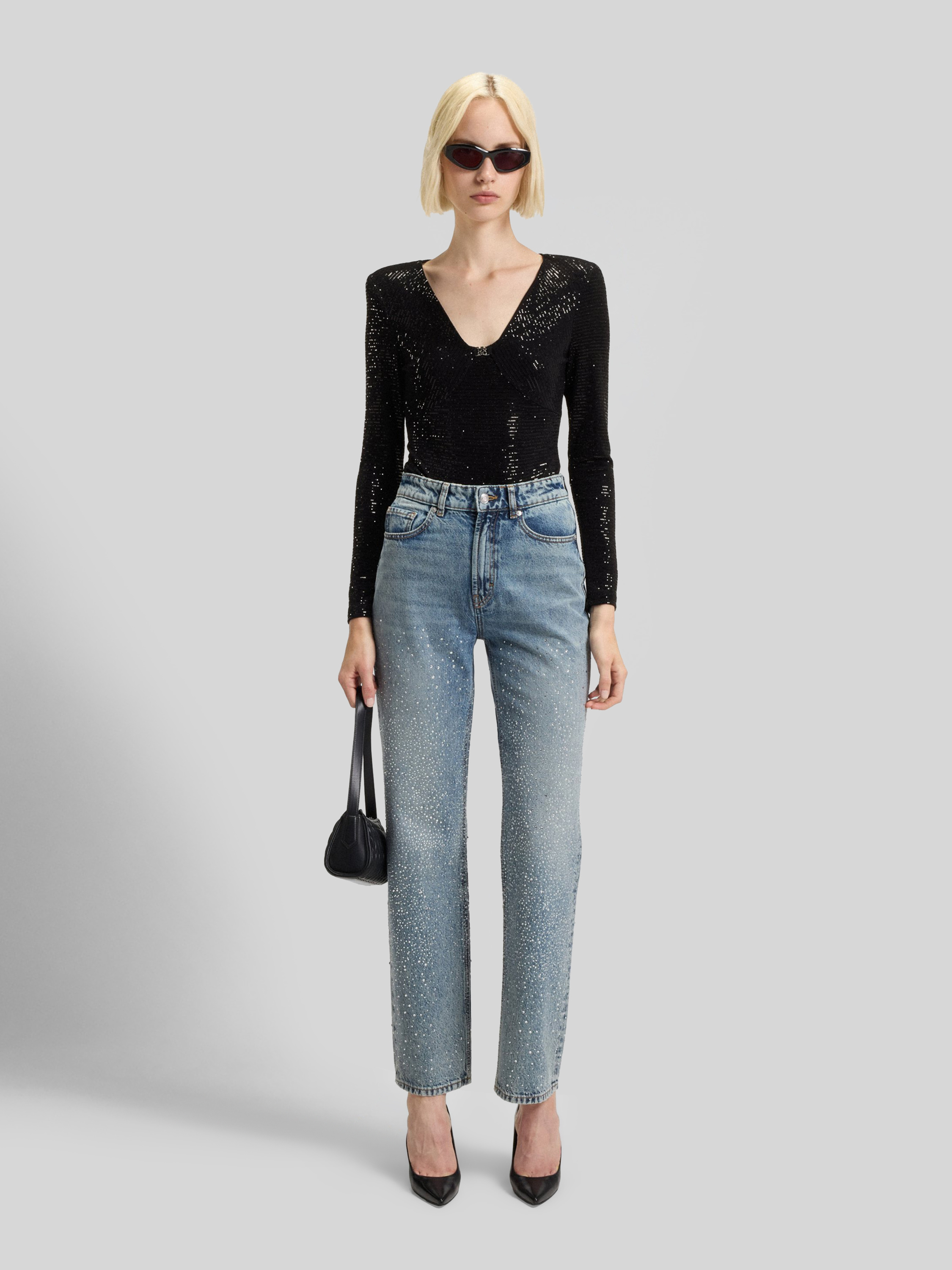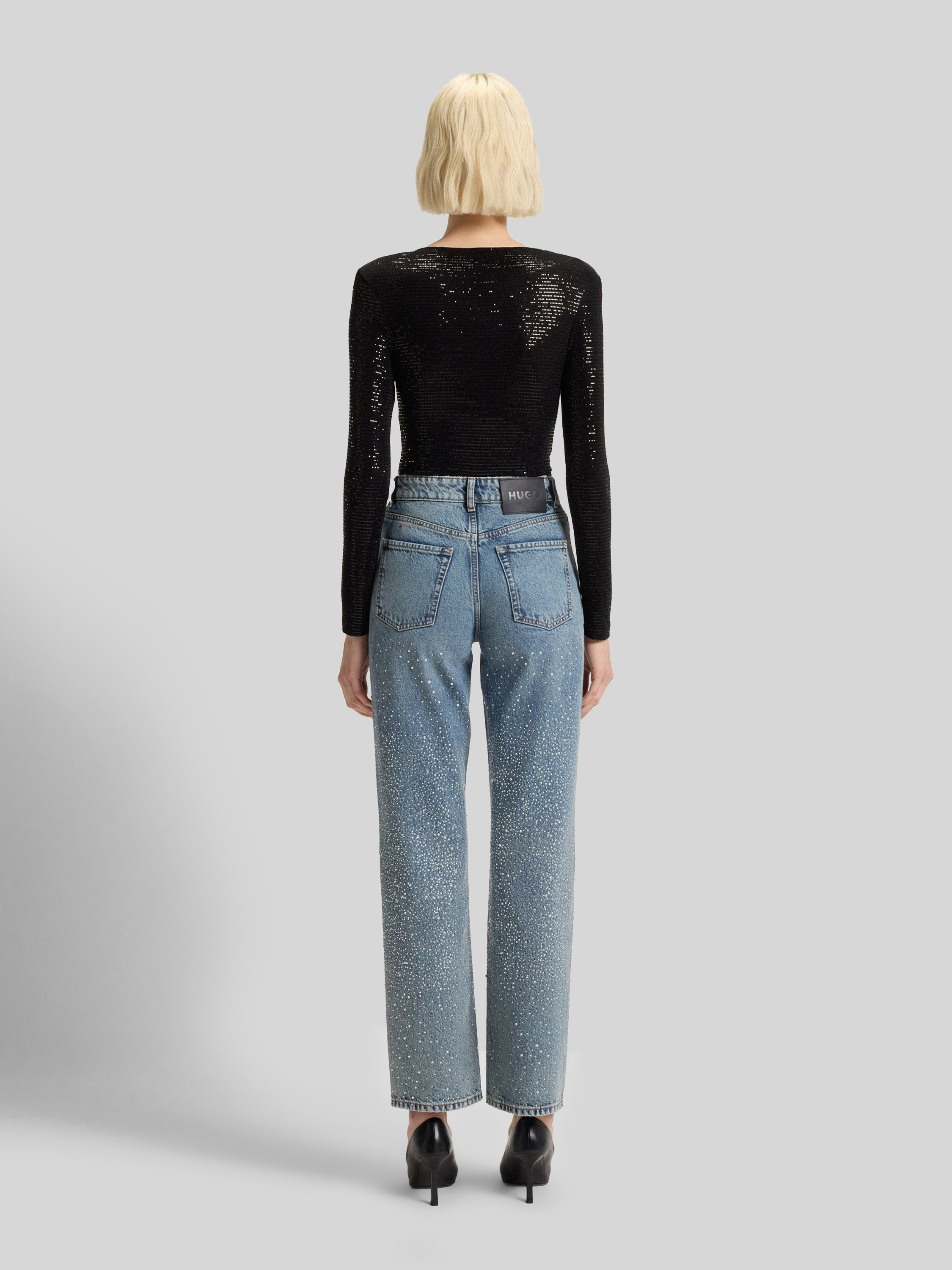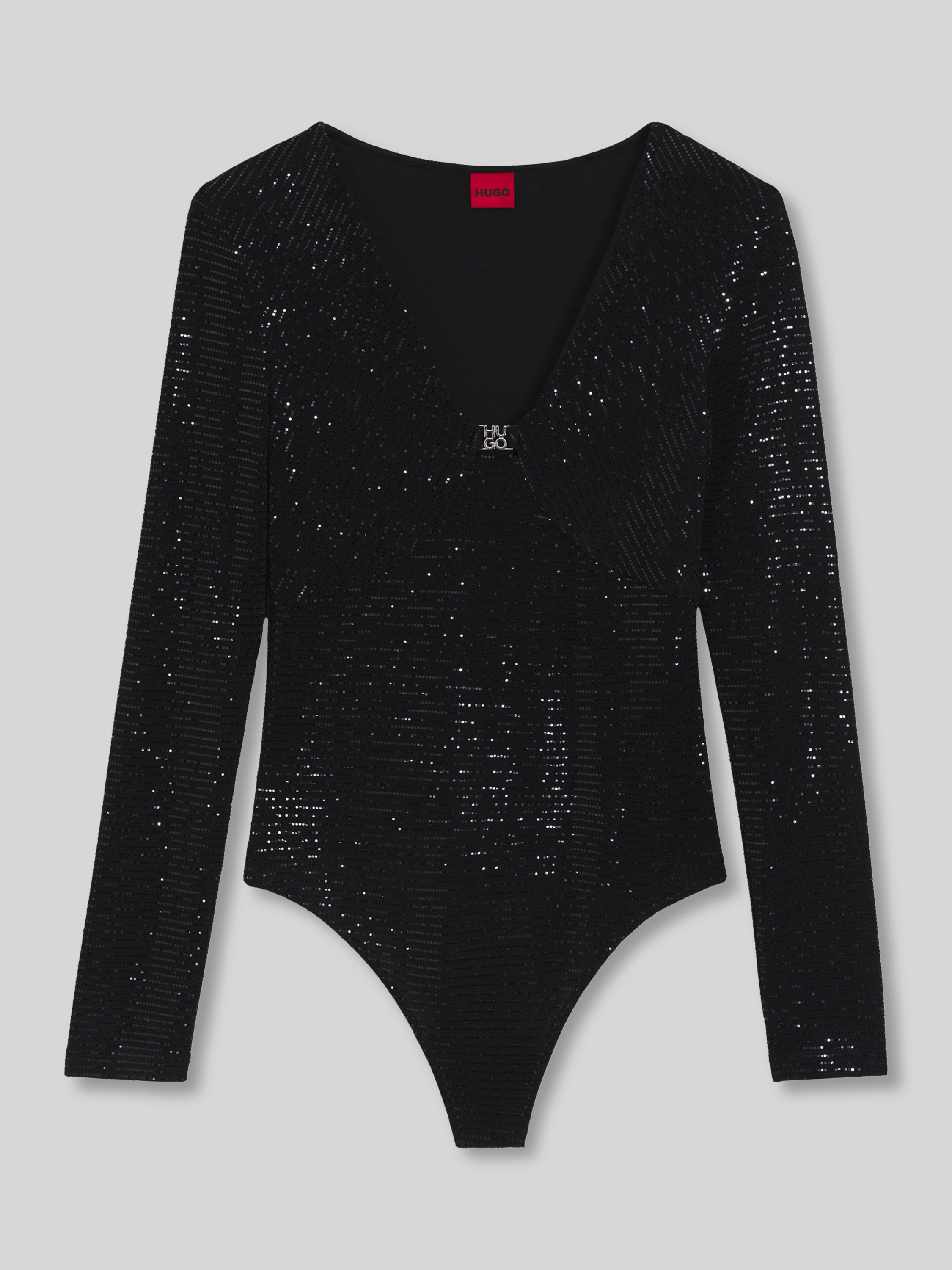 Der Damen Body von HUGO, Modell Dammery, zeichnet sich durch einen figurbetonten Schnitt und den schimmernden Jersey aus, der sanft auf der Haut liegt. Der V-Ausschnitt unterstreicht eine feminine Linie, während lange Ärmel für vielseitige Kombinationsmöglichkeiten sorgen. Dezente Metallapplikationen setzen einen modernen Akzent.