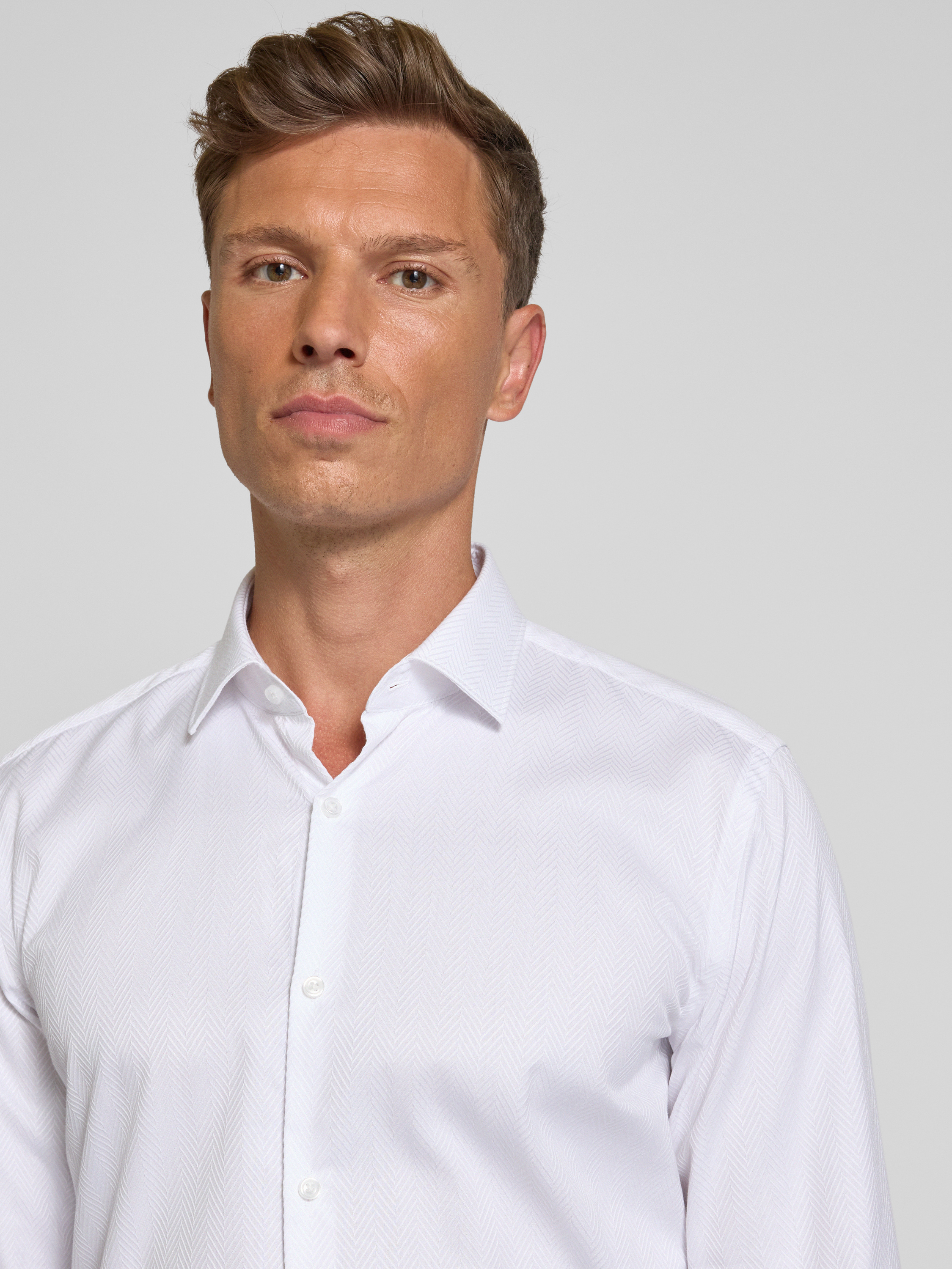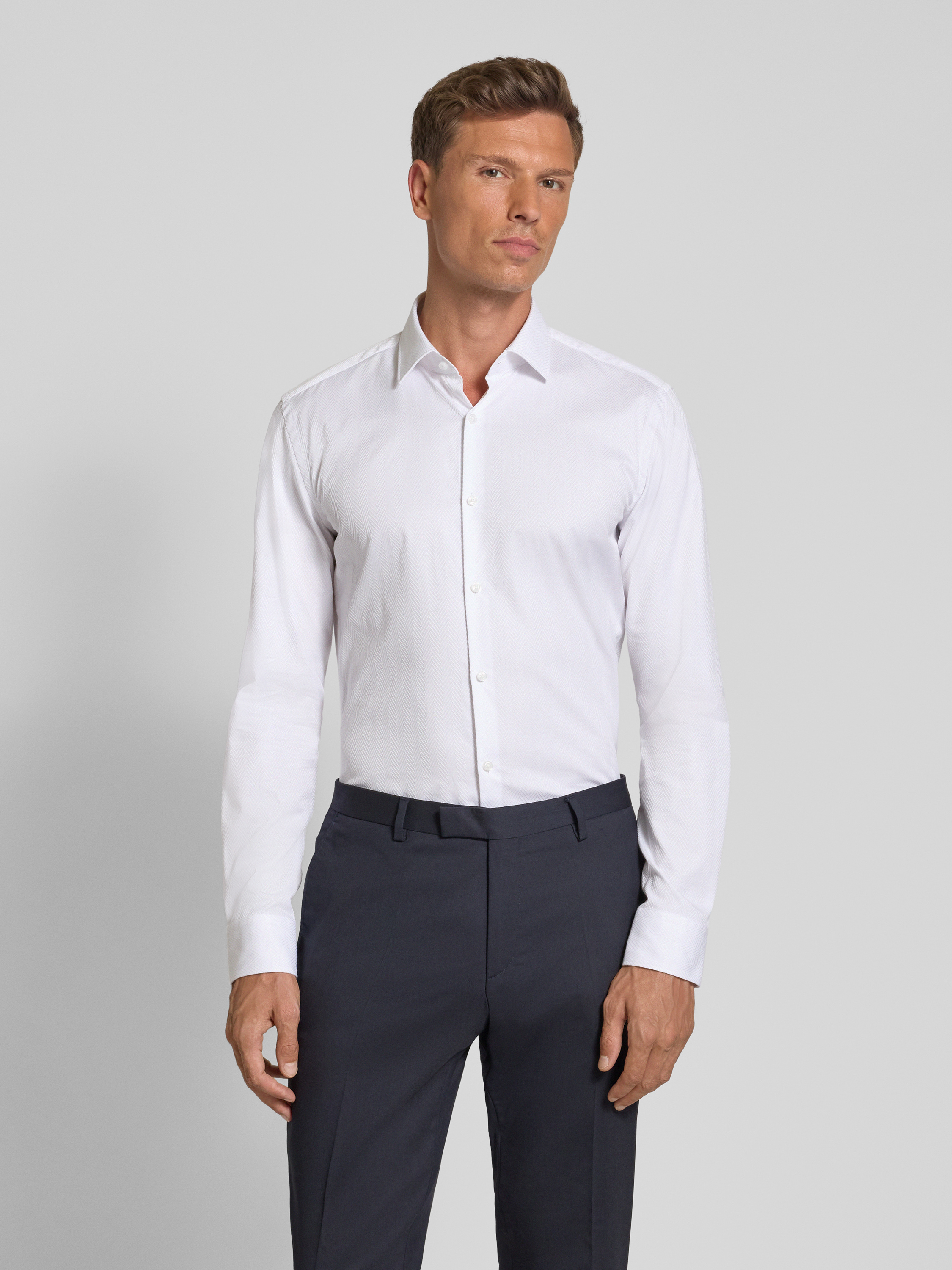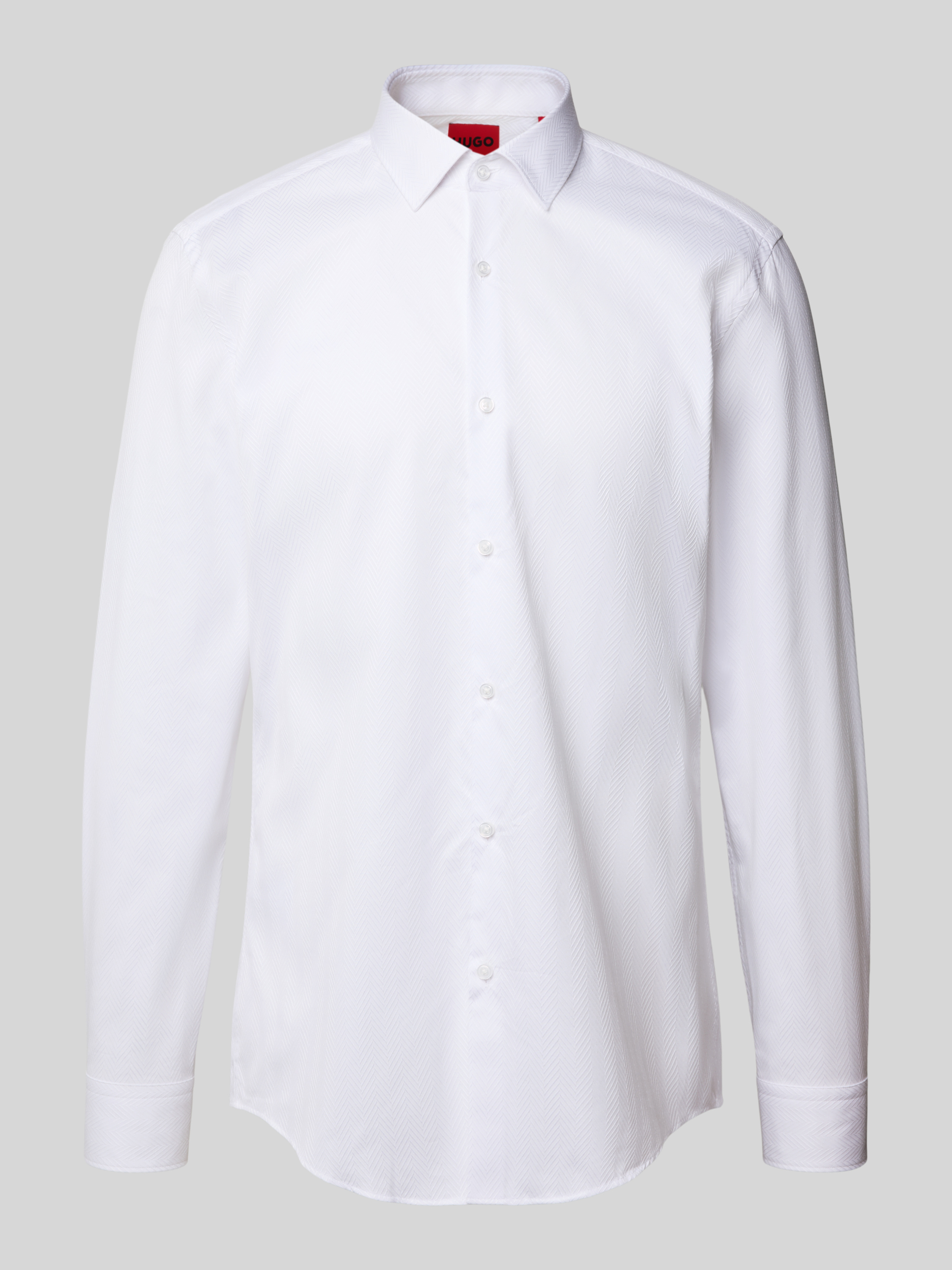 Das Slim Fit Businesshemd von HUGO, Modell 'Kenno', besticht durch seine klare Struktur und den eleganten Kentkragen. Gefertigt aus reiner Baumwolle, bietet es angenehmen Tragekomfort und eine moderne Passform. Ideal für professionelle Anlässe und vielseitig kombinierbar.