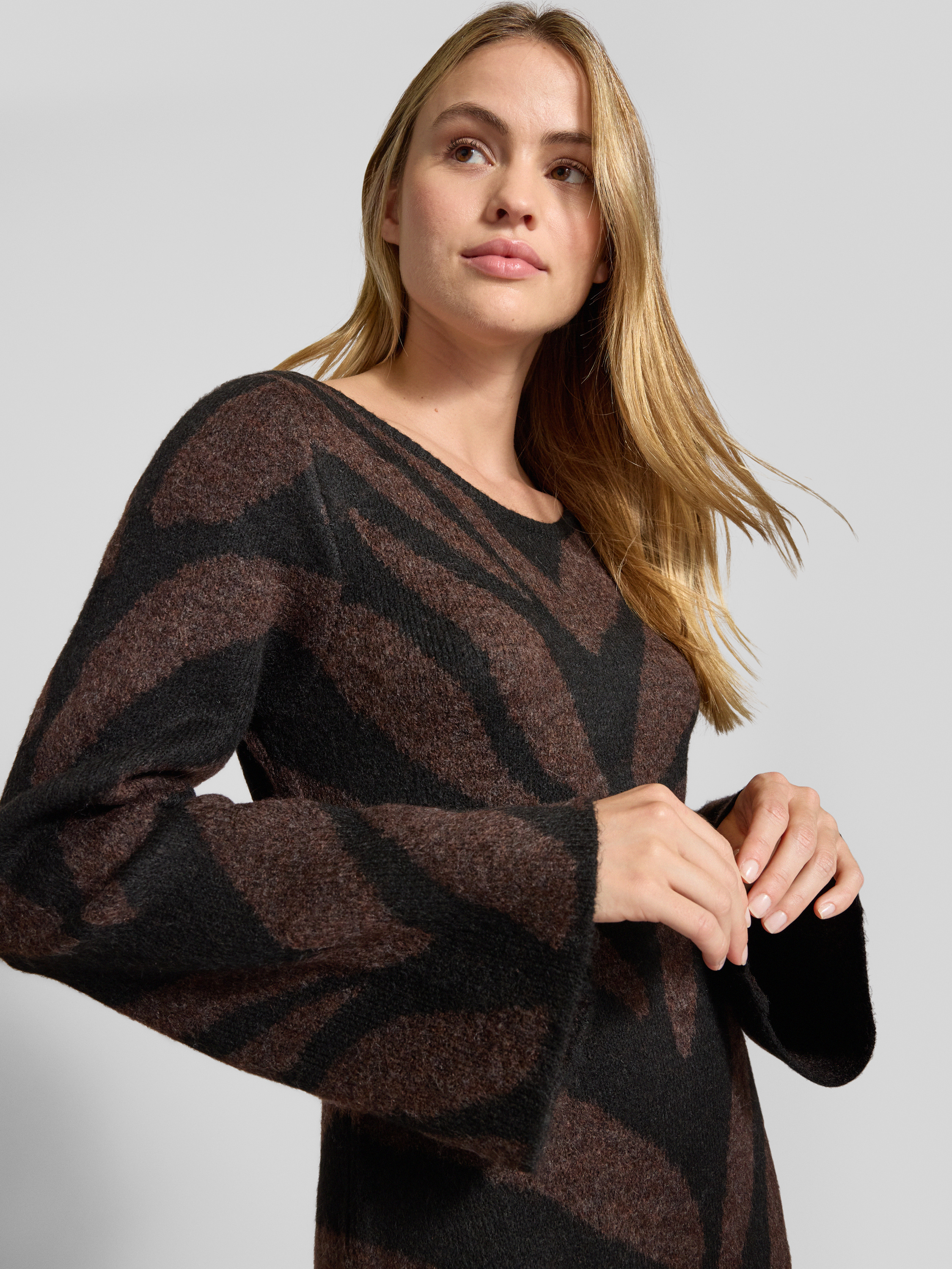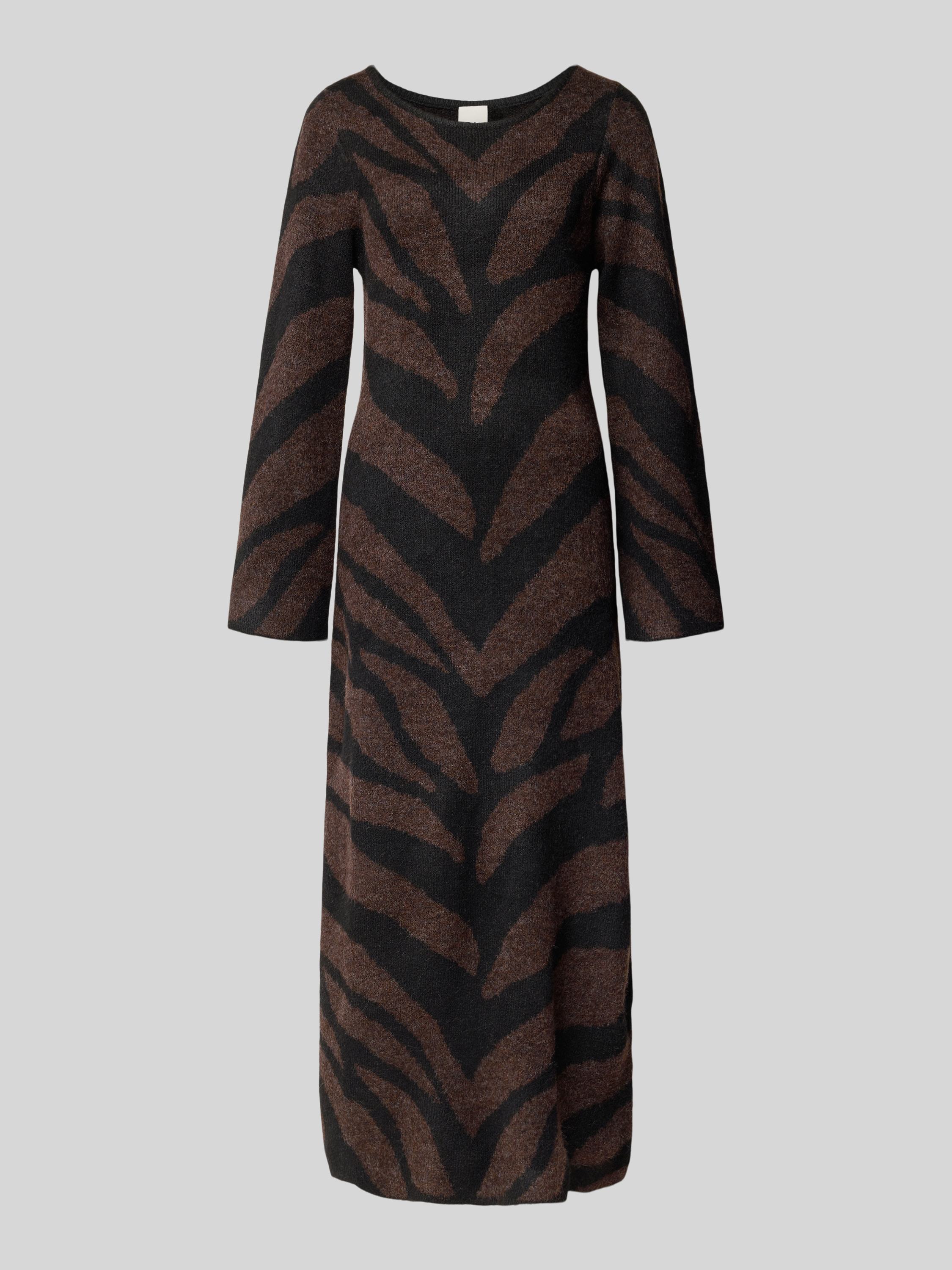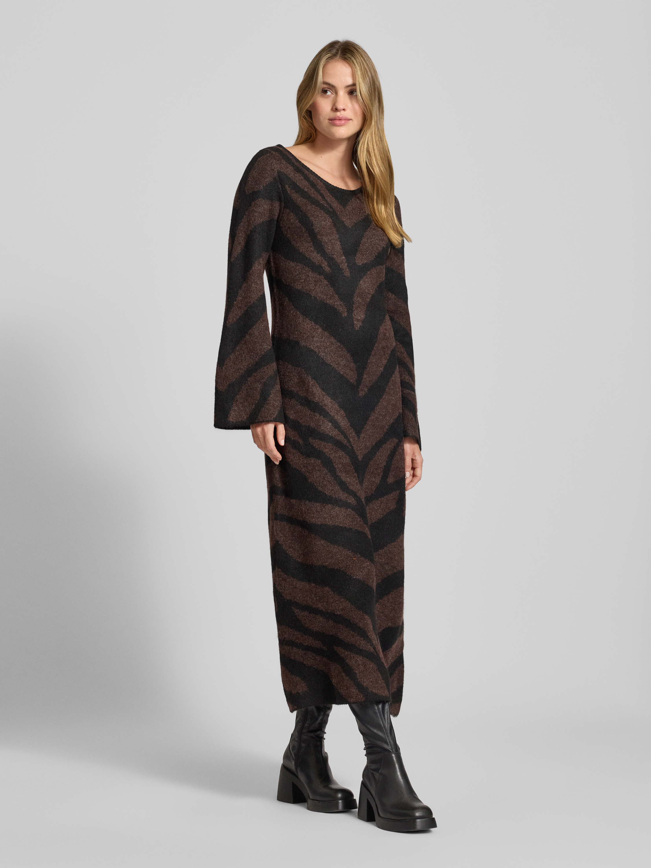 Das Damenkleid Dasila von ICHI zeigt sich mit einem markanten Animal-Print, der in Strick-Optik dezent strukturiert wirkt. Der Regular Fit sorgt gemeinsam mit dem elastischen Material-Mix für angenehmen Tragekomfort. Langärmel und Rundhalsausschnitt runden das Midikleid lässig ab.