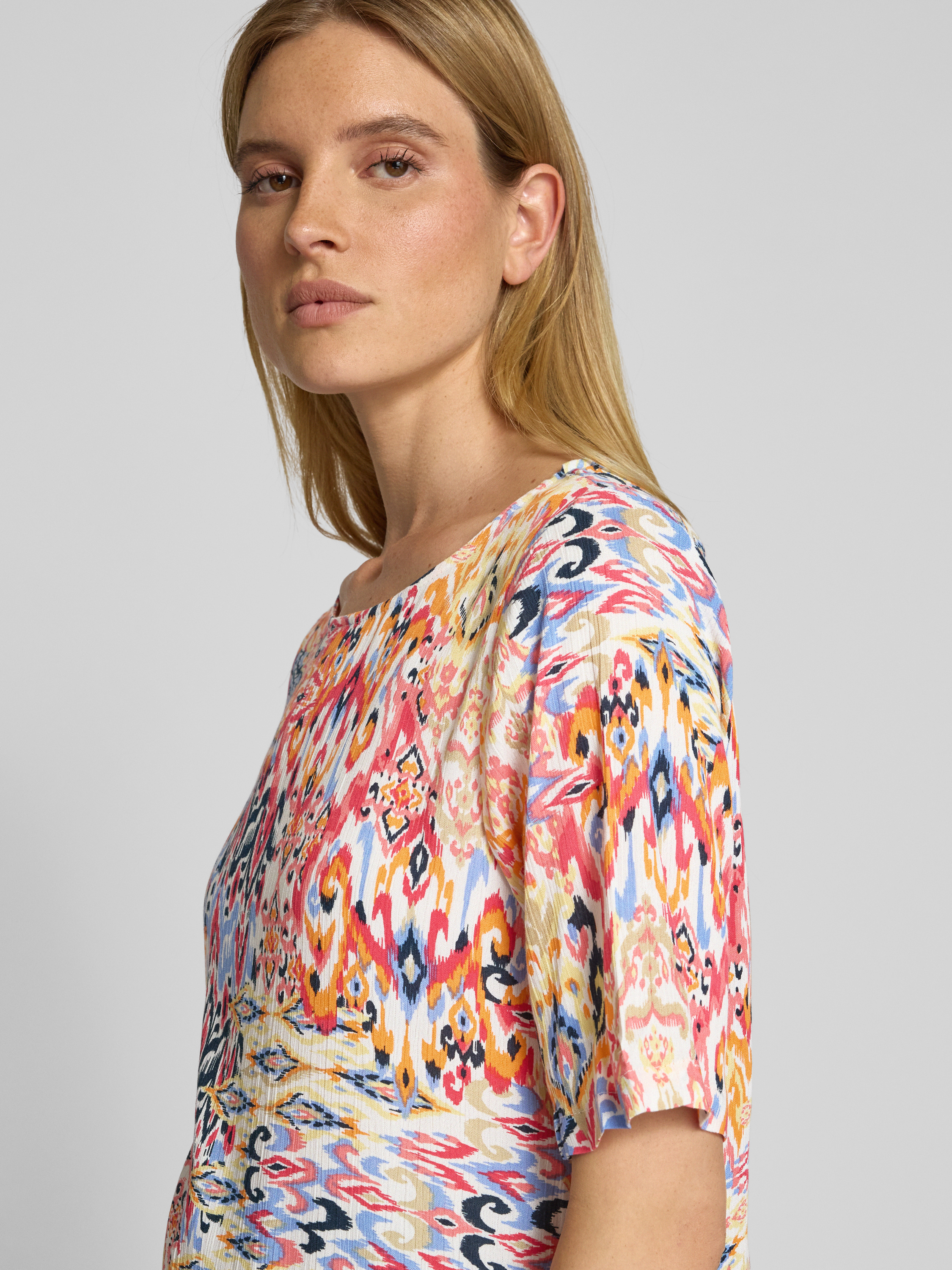 Die Regular Fit Bluse 'MARRAKECH' von ICHI aus reiner Viskose kombiniert lässigen Komfort mit zeitloser Eleganz. Der Rundhalsausschnitt und die halblangen Ärmel bieten eine angenehme Passform, die sich mühelos in verschiedenste Outfits integrieren lässt. Ideal für vielseitige Stylingmöglichkeiten.