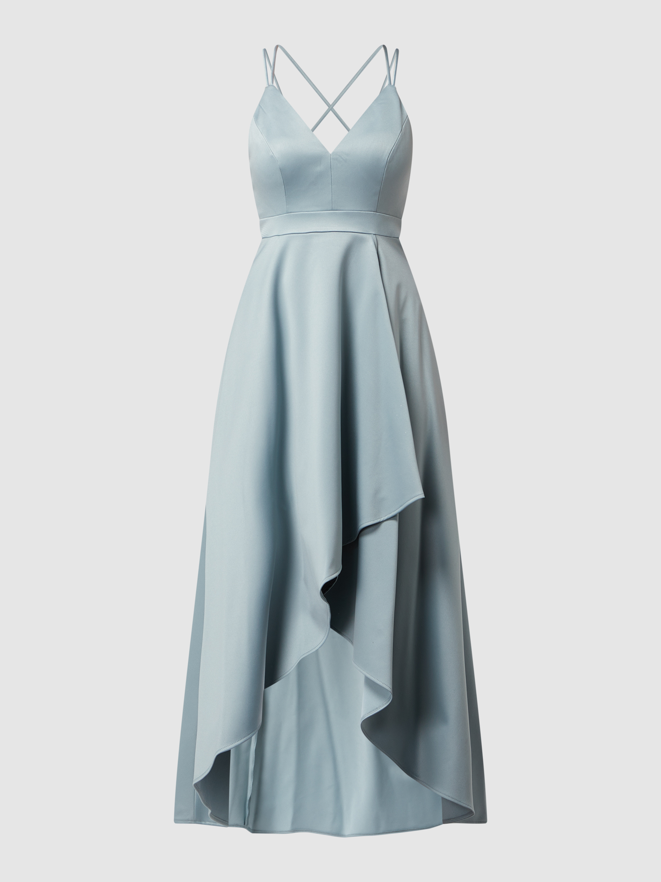Das Abendkleid von Jake*s Cocktail ist aus Satin gefertigt und tailliert geschnitten. Es kommt im Vokuhila-Look mit Herz-Ausschnitt und Spaghettiträgern.