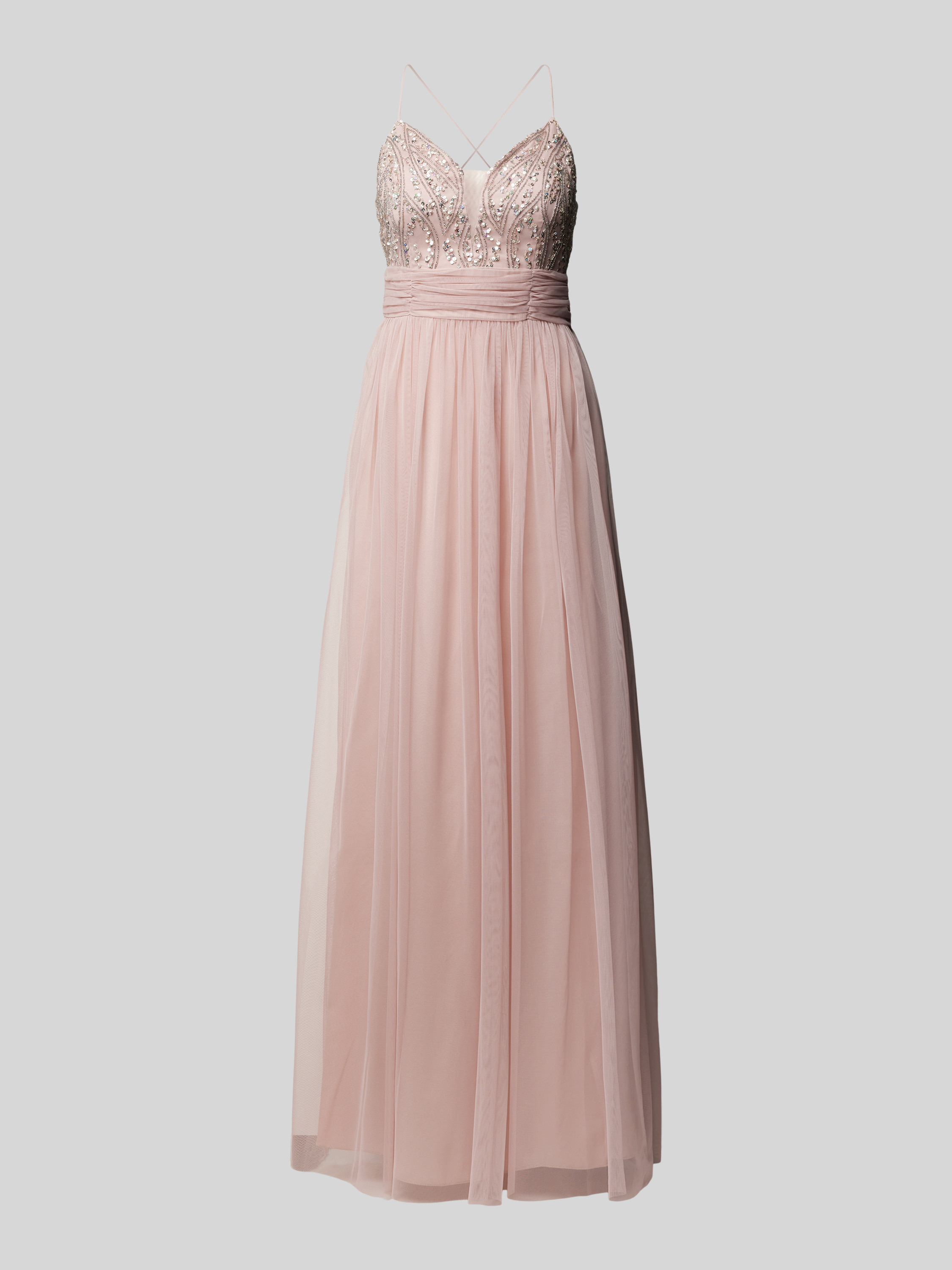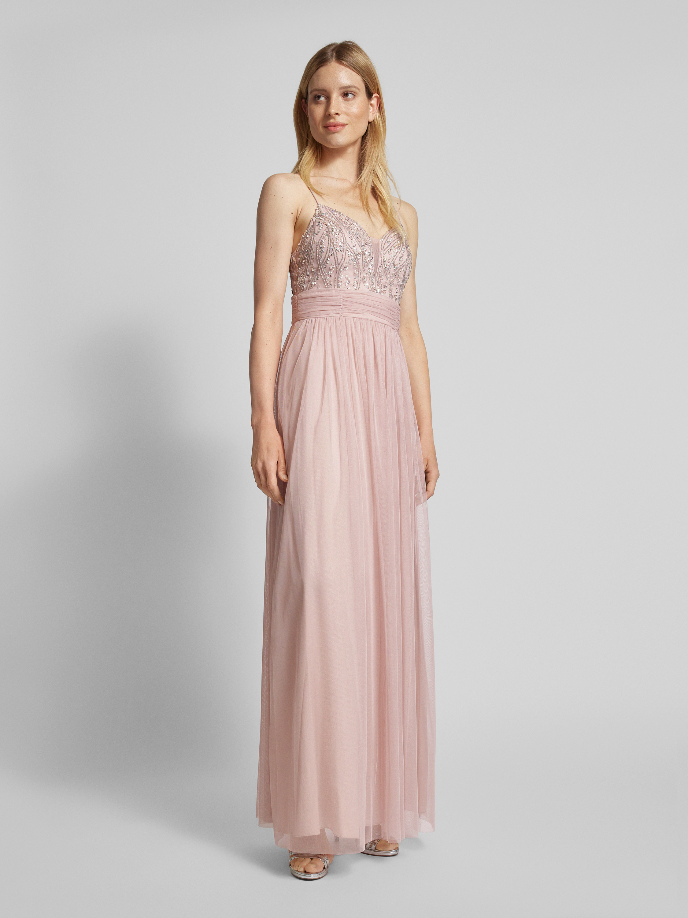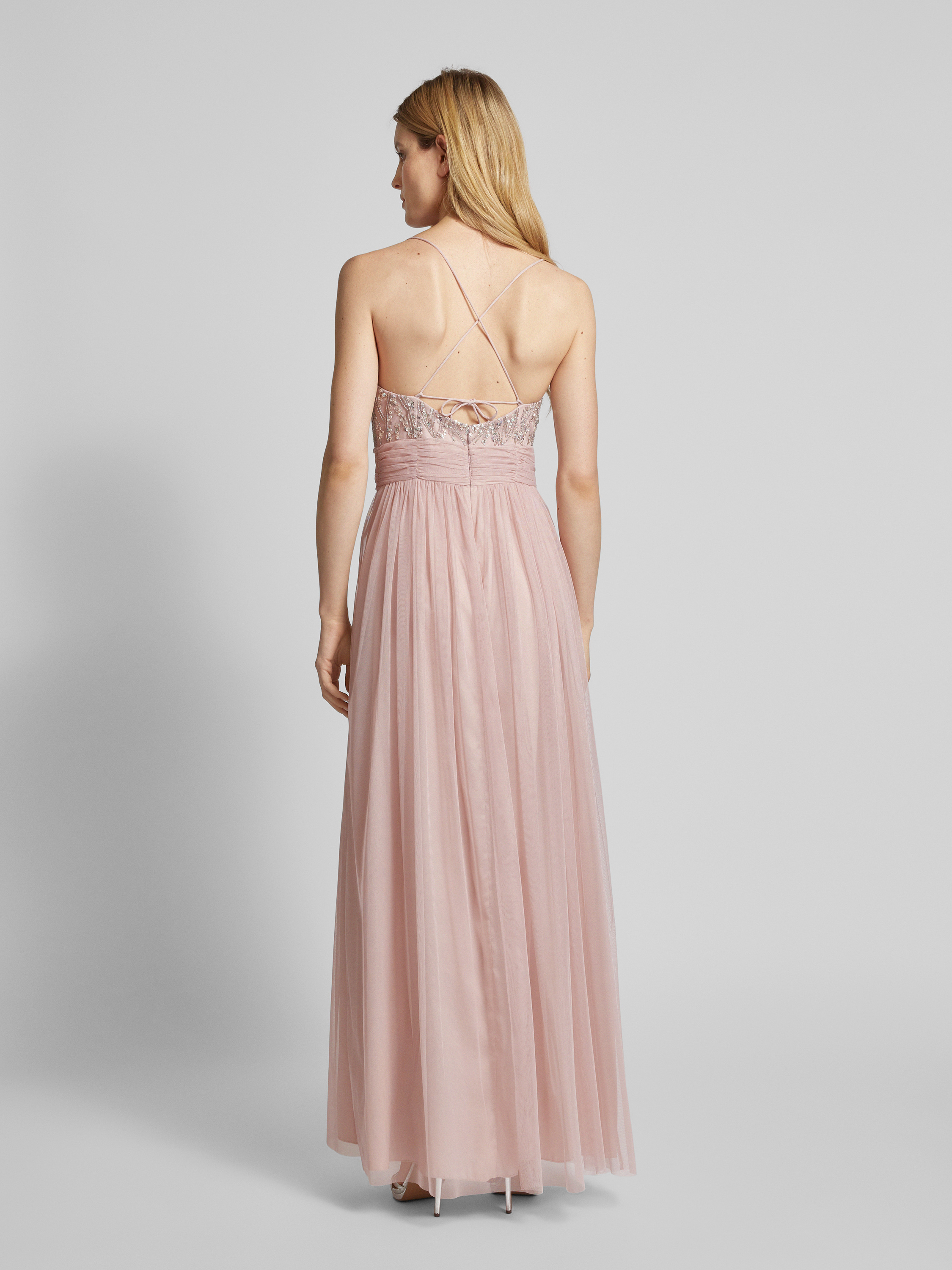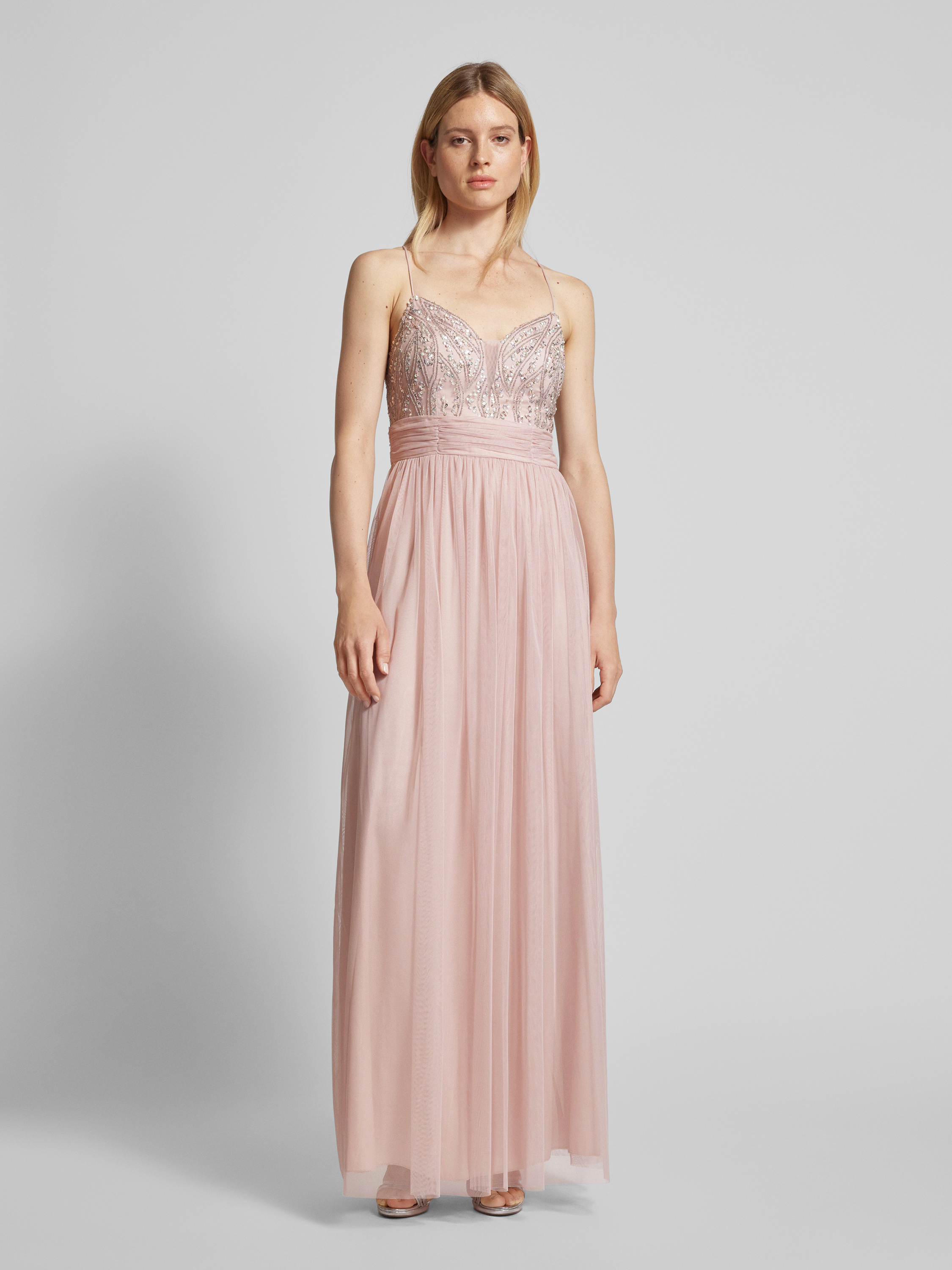 Das Abendkleid von Jake*s Cocktail beeindruckt durch seine elegante A-Linie und den zauberhaften Stufen-Look. Der zarte Tüll umhüllt den Körper sanft, während der Paillettenbesatz subtile Glanzakzente setzt. Spaghettiträger verleihen dem Maxikleid eine leichte Note und unterstreichen die feminine Silhouette.