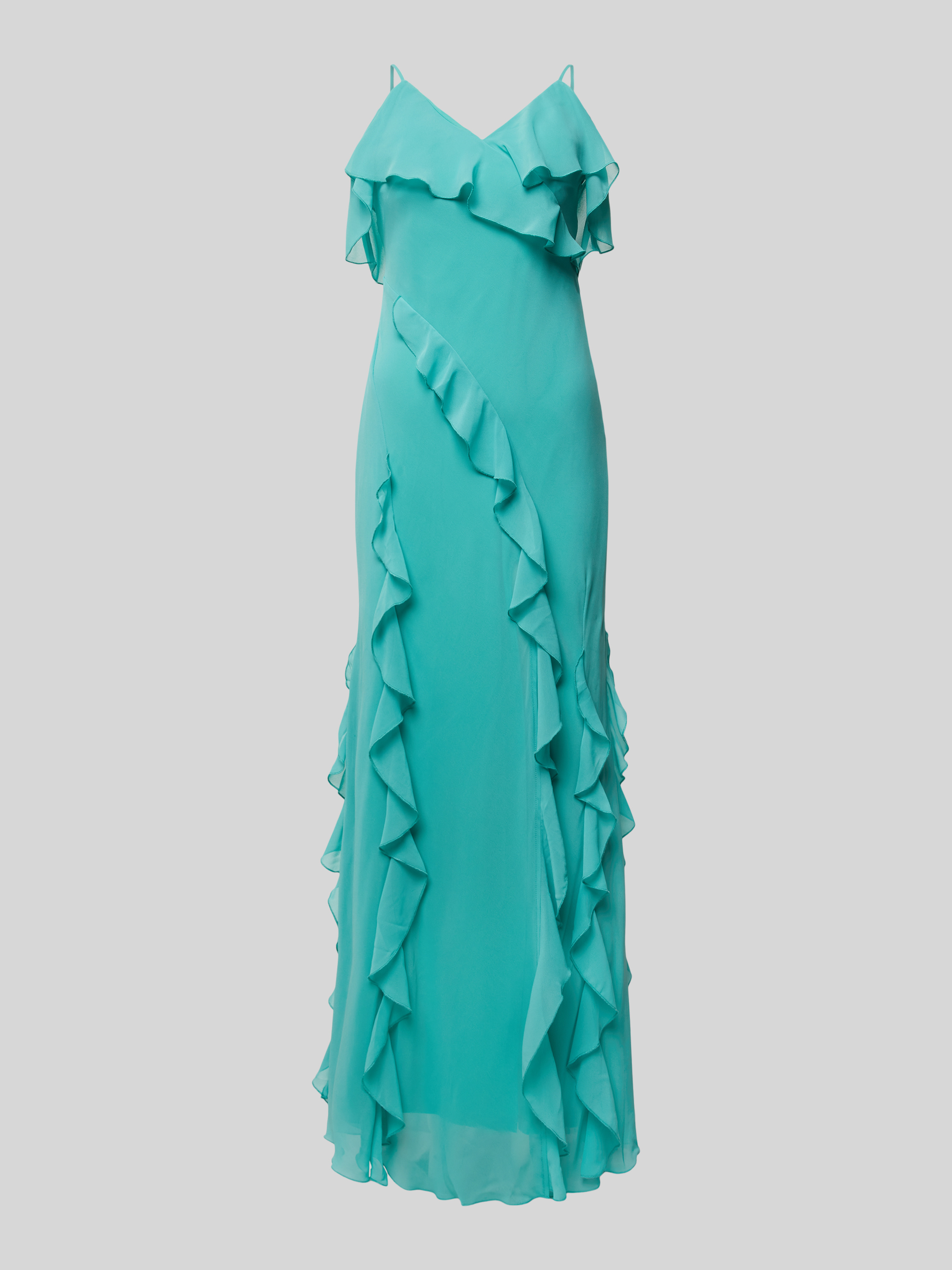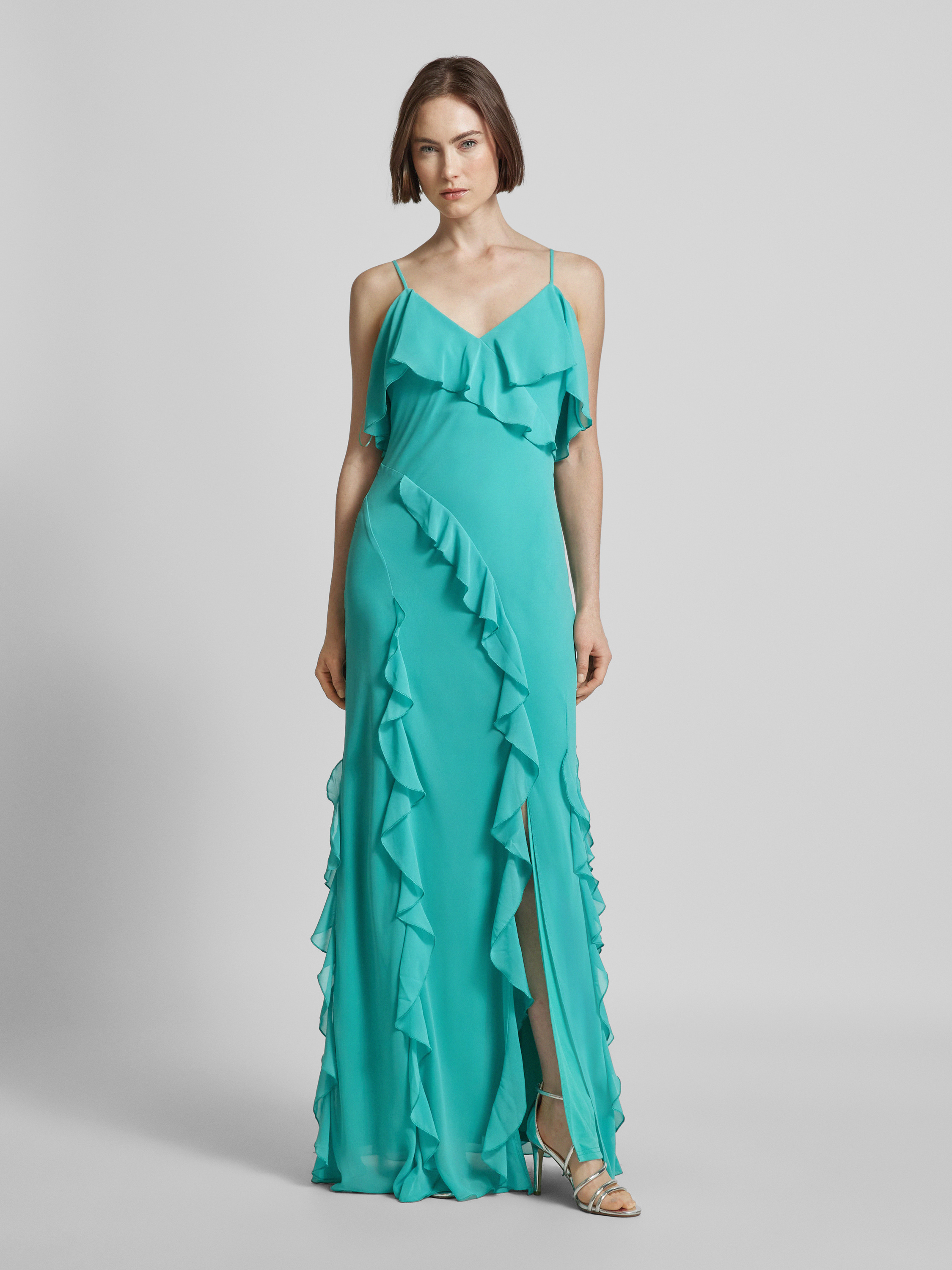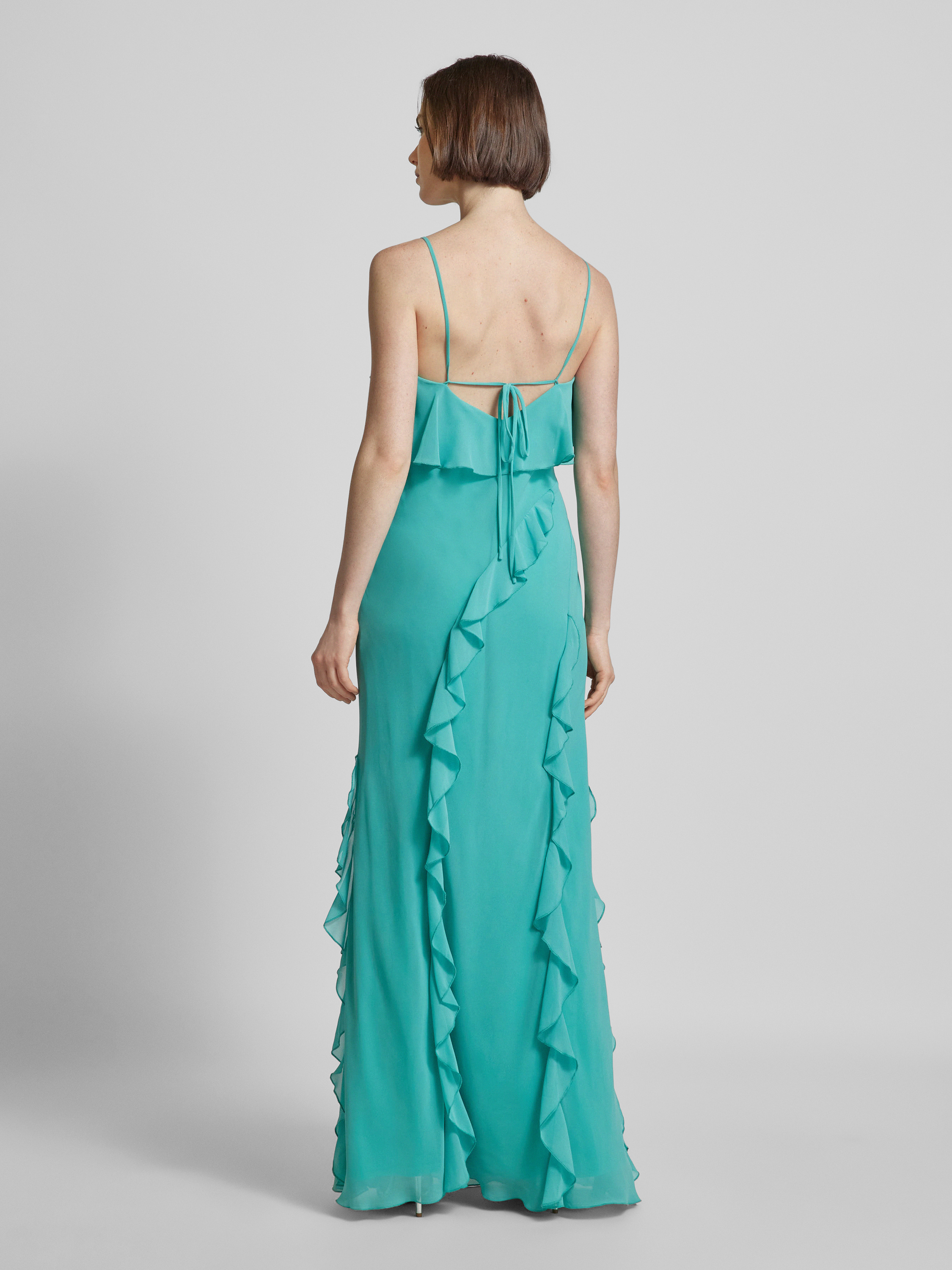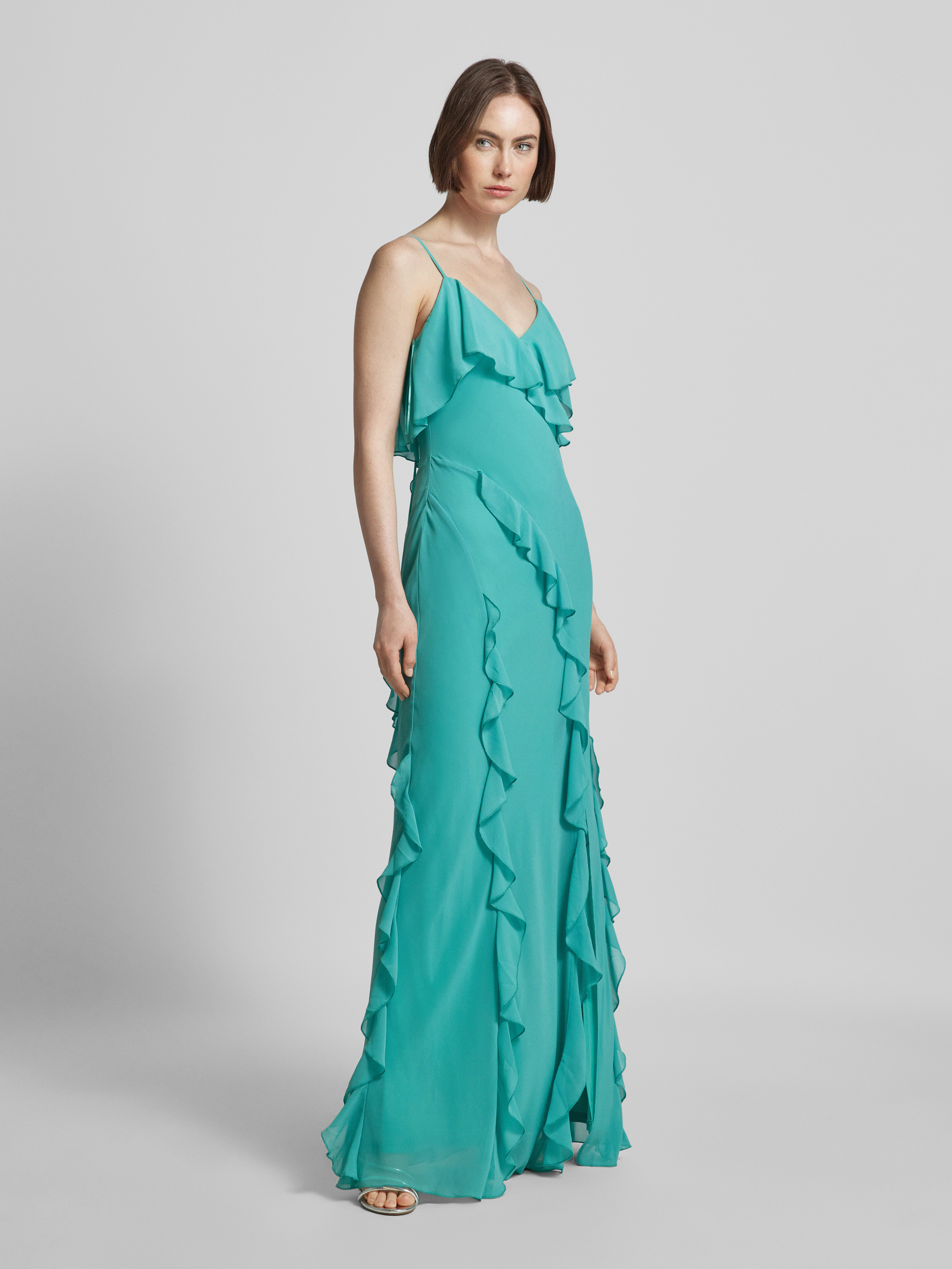 Das elegante Abendkleid von Jake*s Cocktail in unifarbener Optik präsentiert sich in einem fließenden Chiffon-Material. Der taillierte Schnitt und die Spaghettiträger sorgen für eine feminine Silhouette, während die Volants dem Maxi-Kleid eine verspielte Note verleihen. Ein V-Ausschnitt rundet das Design stilvoll ab.