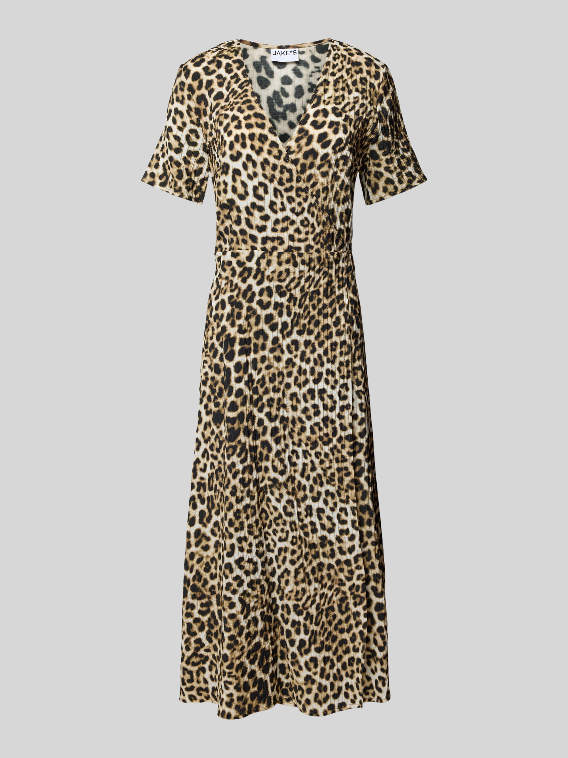 Das Damen Wickelkleid von Jake*s Casual kombiniert ein lebendiges Allover-Muster mit einer schmeichelhaften A-Linien-Passform, die Bewegungsfreiheit bietet. Der V-Ausschnitt und der Bindegürtel setzen feminine Akzente, während der leichte Viskose-Mix ein angenehmes Tragegefühl gewährleistet. Ideal für vielseitige Stylingmöglichkeiten.