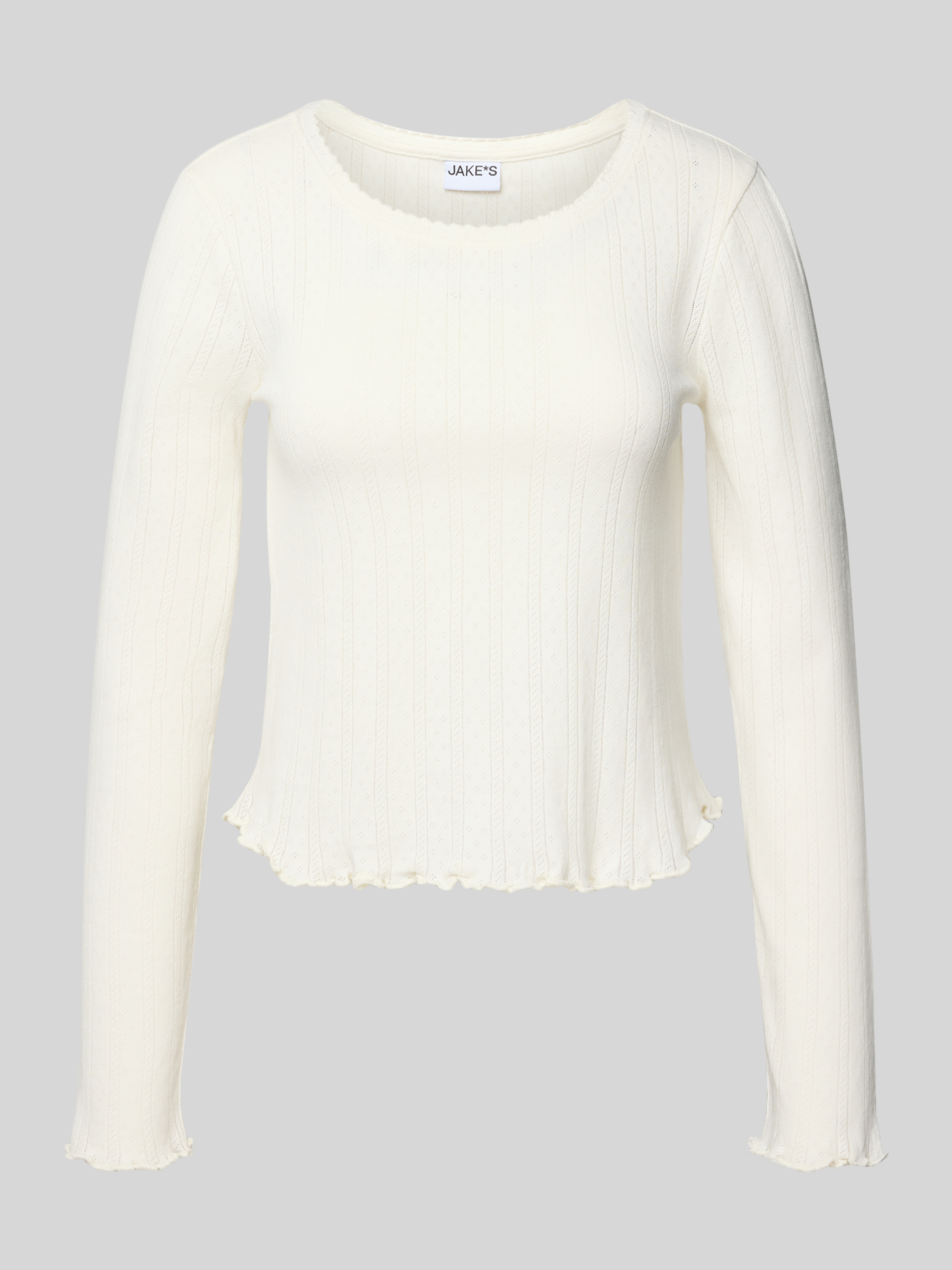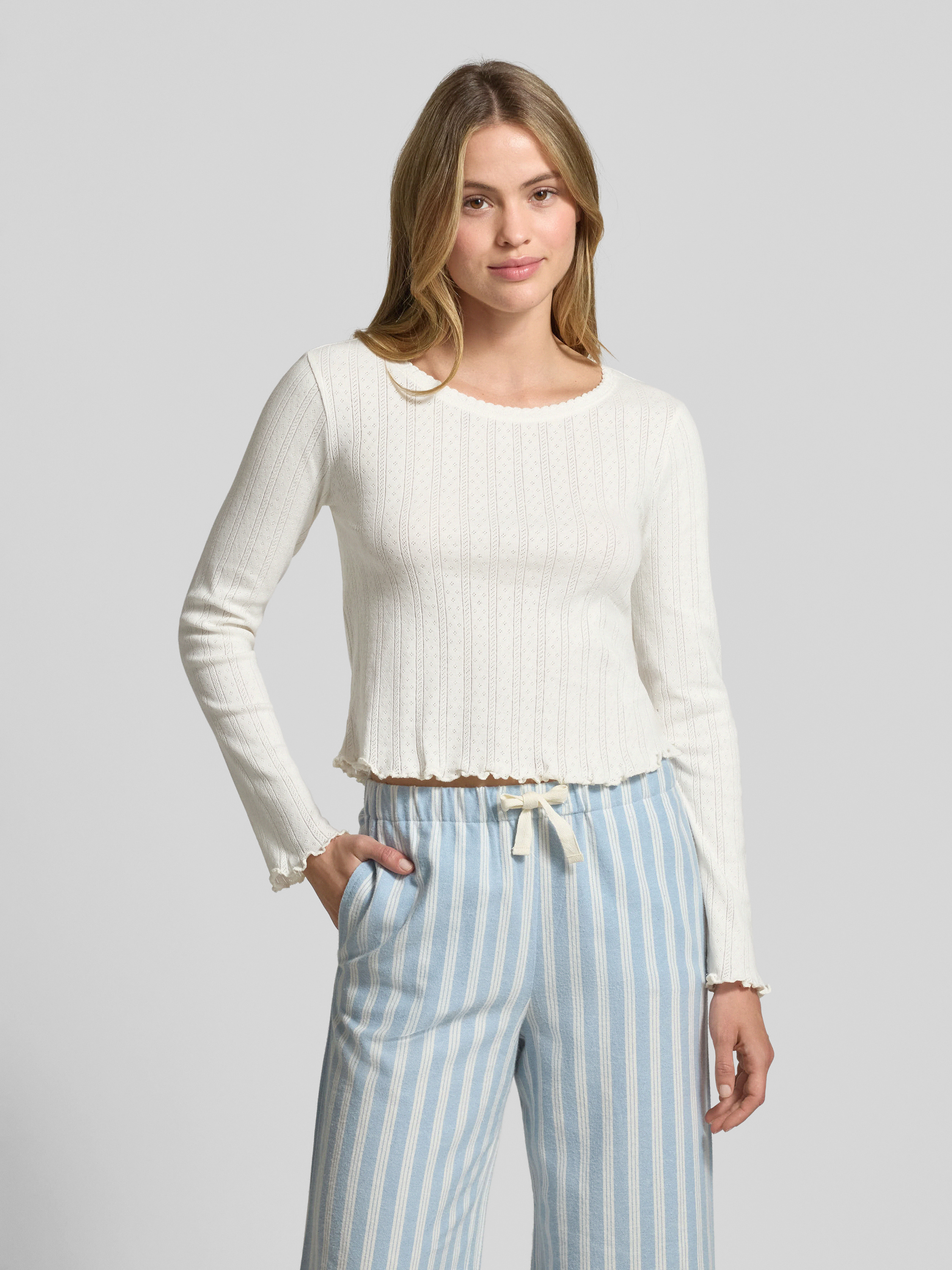 Das Damen Pyjama-Oberteil von Jake*s Casual schmiegt sich mit körpernaher Passform sanft an und punktet durch ein feines Lochmuster, das für angenehme Luftzirkulation sorgt. Dank Rundhalsausschnitt bleibt der Look zurückhaltend, während ein Muschelsaum dem Design eine verspielte Note verleiht.