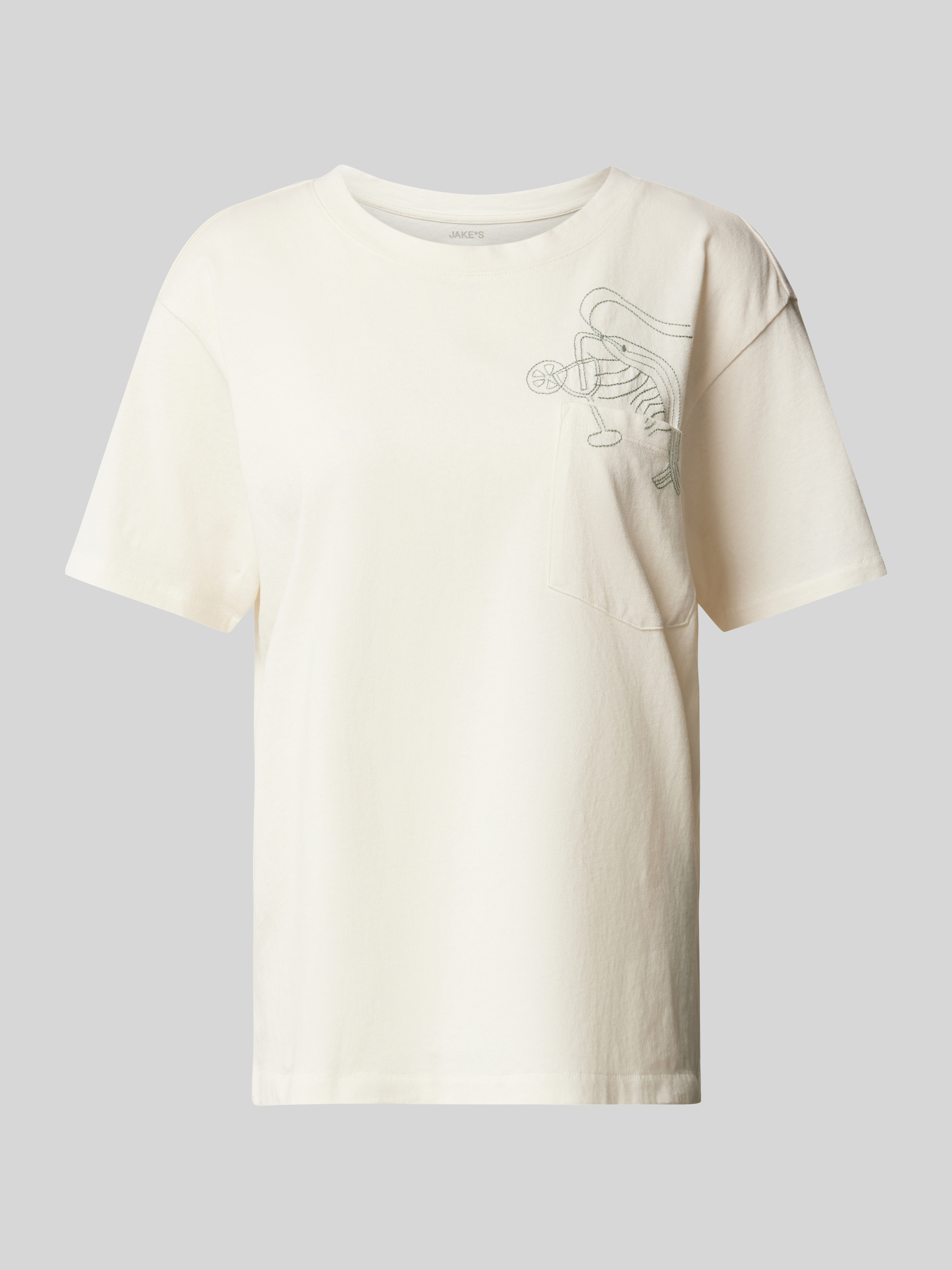 Das Jake*s Casual T-Shirt mit Motiv-Stitching aus reiner Baumwolle kombiniert Komfort mit einem frischen Look. Ein gerader Schnitt sorgt für eine entspannte Passform, während die Brusttasche dem Design eine praktische Note verleiht. Der Rundhalsausschnitt ergänzt den lässigen Stil ideal.