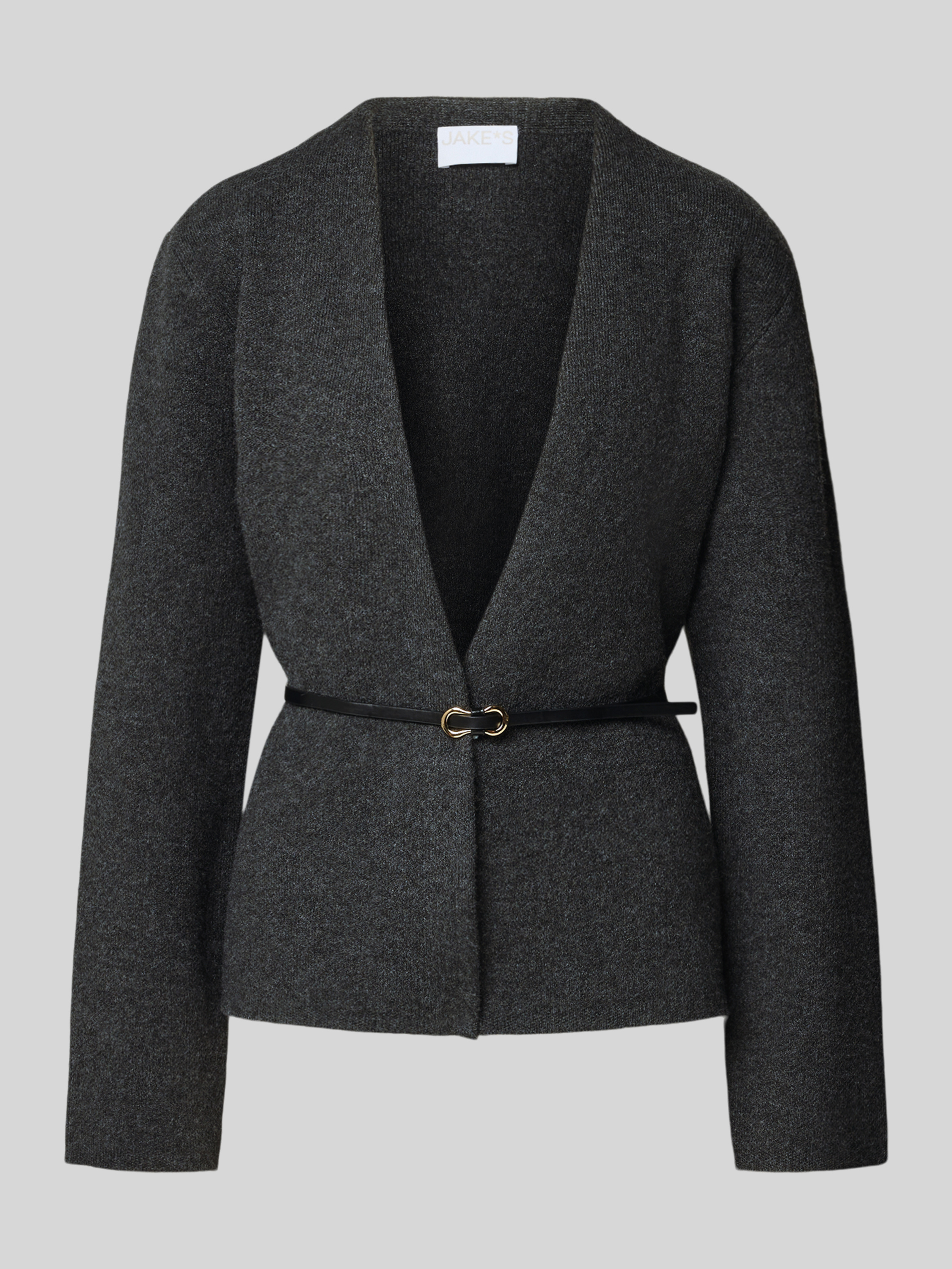 Die taillierte Strickjacke von Jake*s Collection kombiniert ein offenes Design mit einem feinen Lammwoll-Anteil, wodurch sie angenehm weich auf der Haut liegt. Ein abnehmbarer Gürtel mit dekorativer Schnalle bringt dezente Akzente ins Spiel. Durch den V-Ausschnitt lässt sich der Look vielseitig variieren.