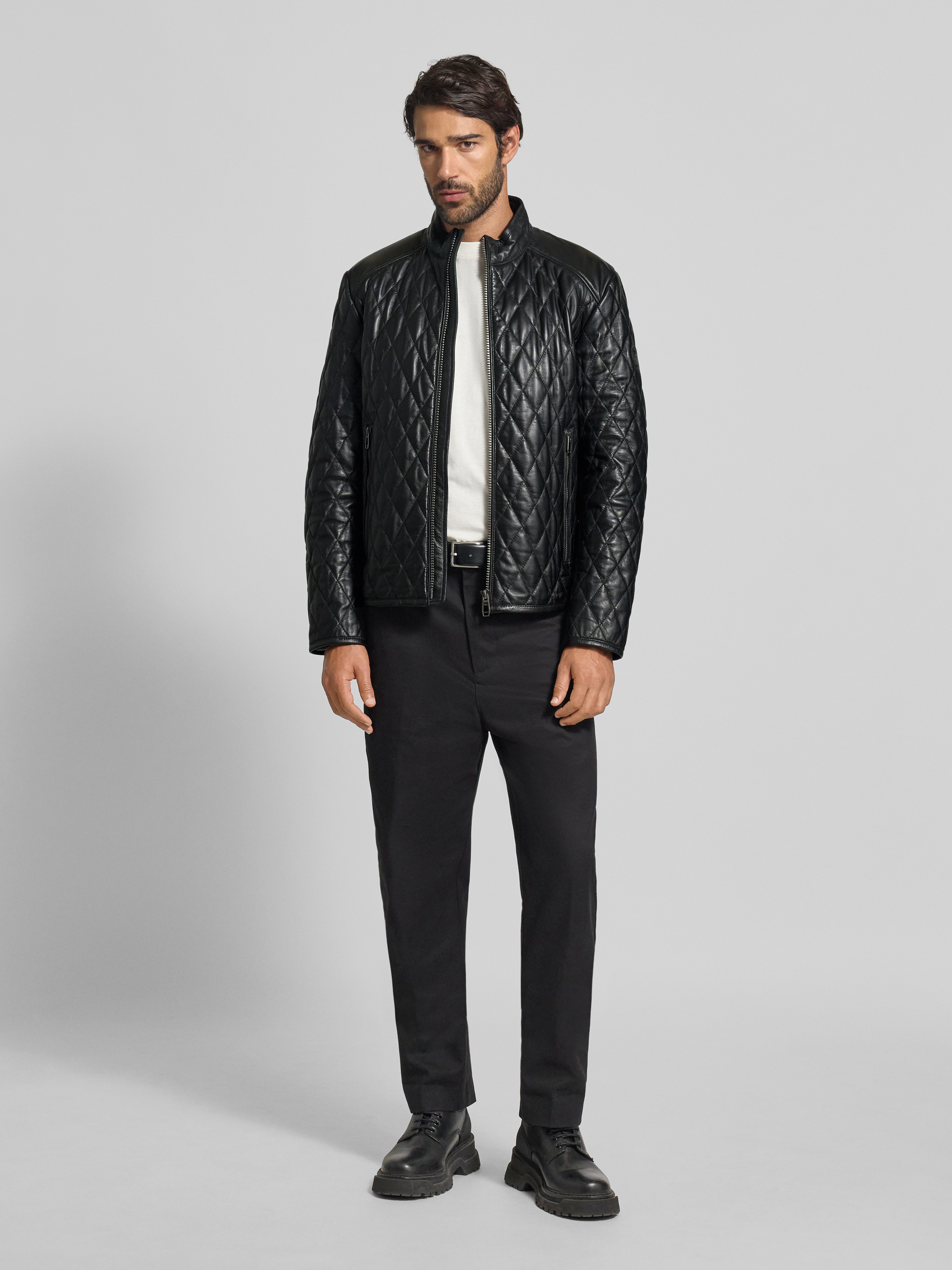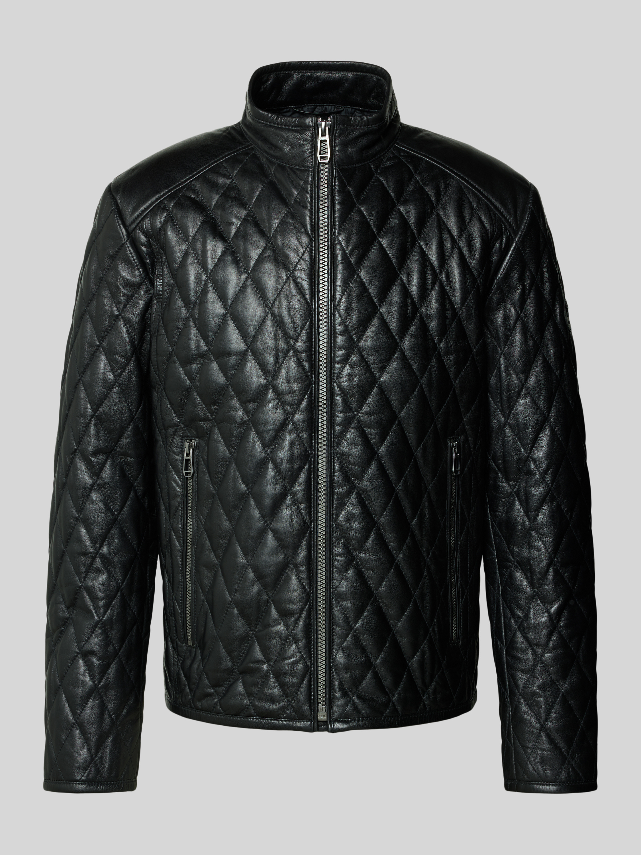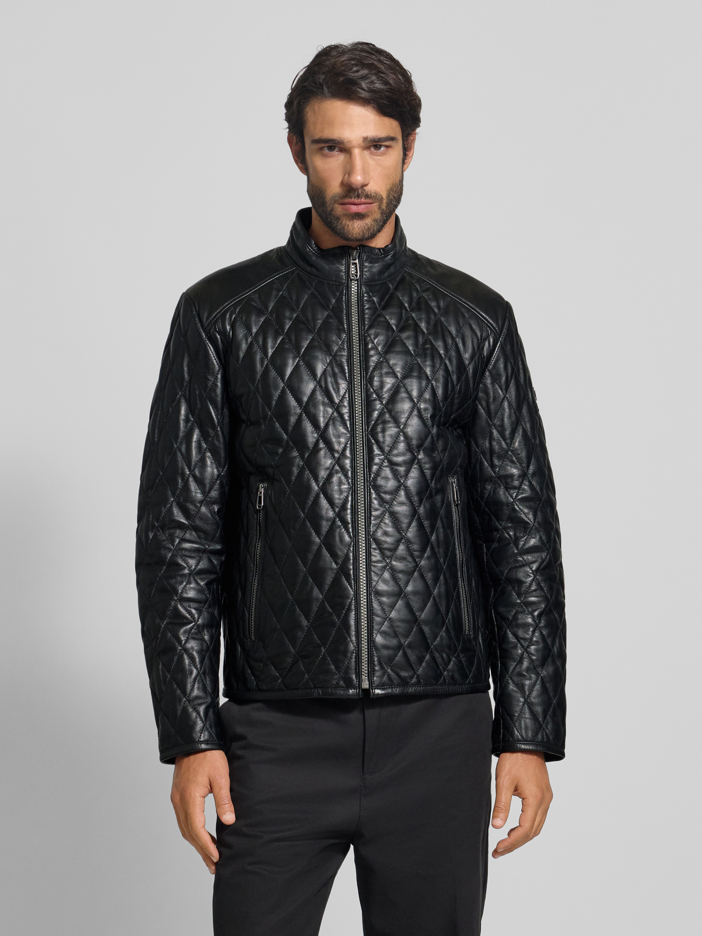 Der Herr trägt mit der Lederjacke von JOOP! Collection ein Modell, das durch feines Lammnappa und ein markantes Strukturmuster auffällt. Der gerade Schnitt sorgt für einen angenehmen Sitz, während der Stehkragen dem Auftritt eine dezente, moderne Note verleiht.