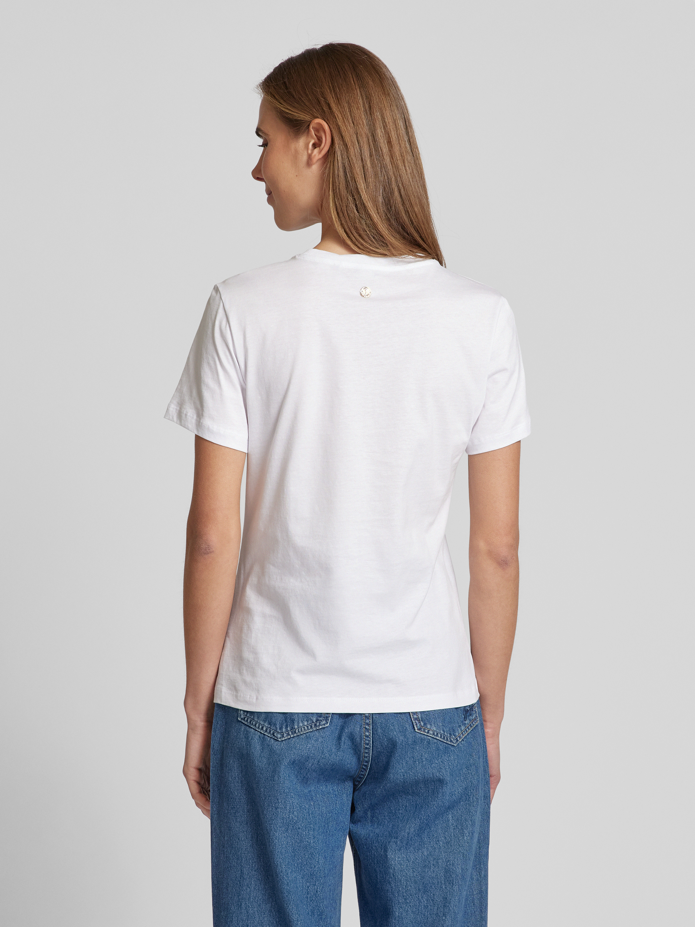 Das Damen T-Shirt von JOOP!, Modell 'Tolu', kombiniert einen geraden Schnitt mit der angenehmen Haptik reiner Baumwolle. Der Rundhalsausschnitt und der Strasssteinbesatz verleihen dem Oberteil eine besondere Note. Ein dezenter Label-Print rundet das Gesamtbild harmonisch ab.
