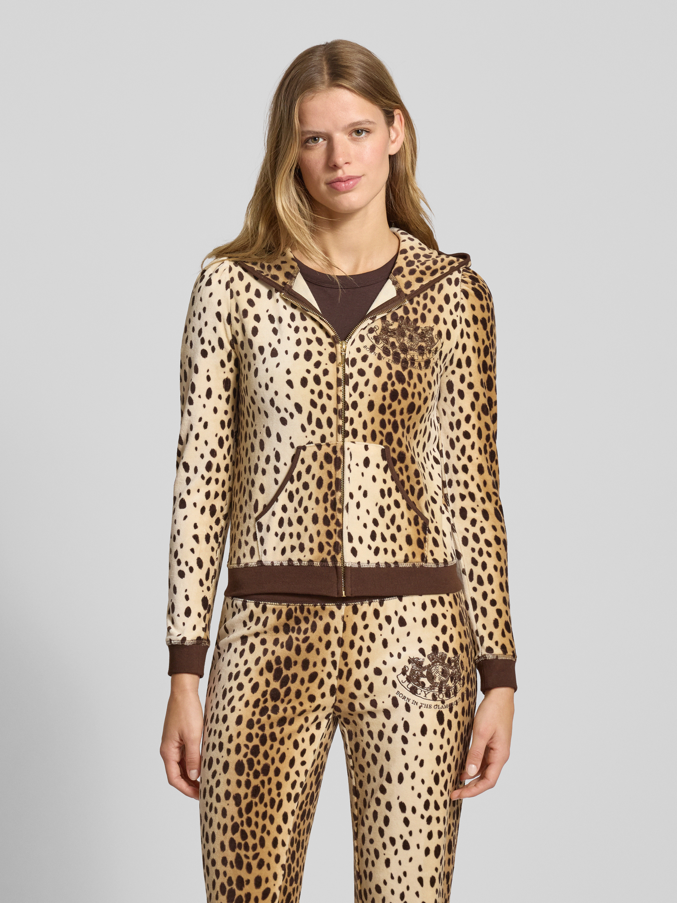 Die Damen Sweatjacke von Juicy Couture kombiniert einen körpernahen Slim Fit mit angenehm weichem Baumwoll-Viskose-Mix. Die Kapuze sorgt für zusätzlichen Komfort im Alltag, während praktische Eingrifftaschen und dezentes Label-Stitching das schlichte Design sinnvoll ergänzen. So eignet sich dieses Modell für entspannte Aktivitäten oder unterwegs.