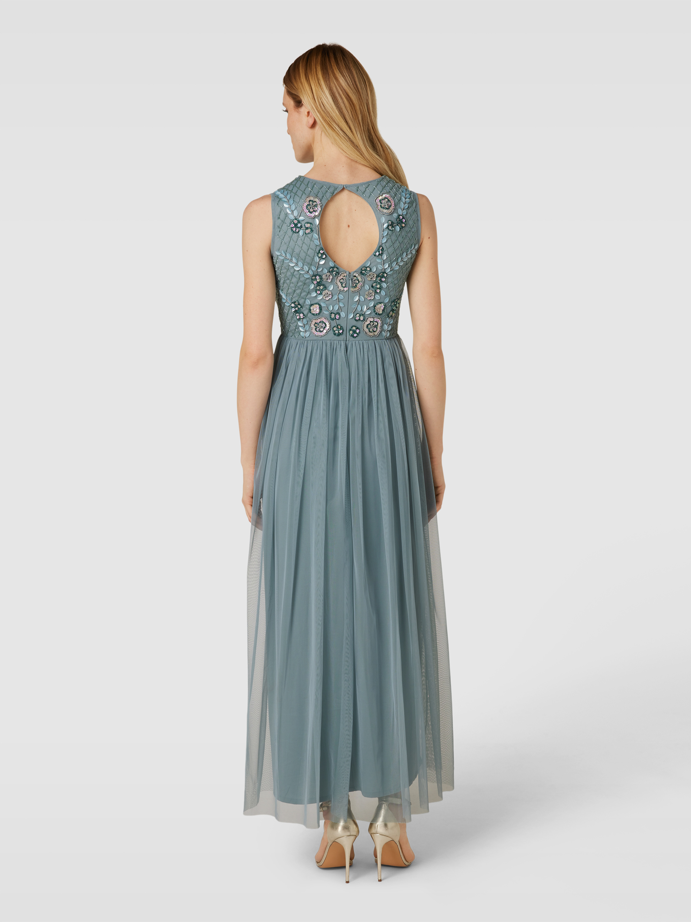 Das Abendkleid von Lace & Beads beeindruckt durch seinen fließenden Tüll in leichter A-Linie, der eine anmutige Silhouette zaubert. Der Pailletten- und Ziersteinbesatz sorgt für subtile Eleganz, während der blickdichte Unterrock Komfort bietet. Ein raffiniertes Rückendetail rundet das Design stilvoll ab.