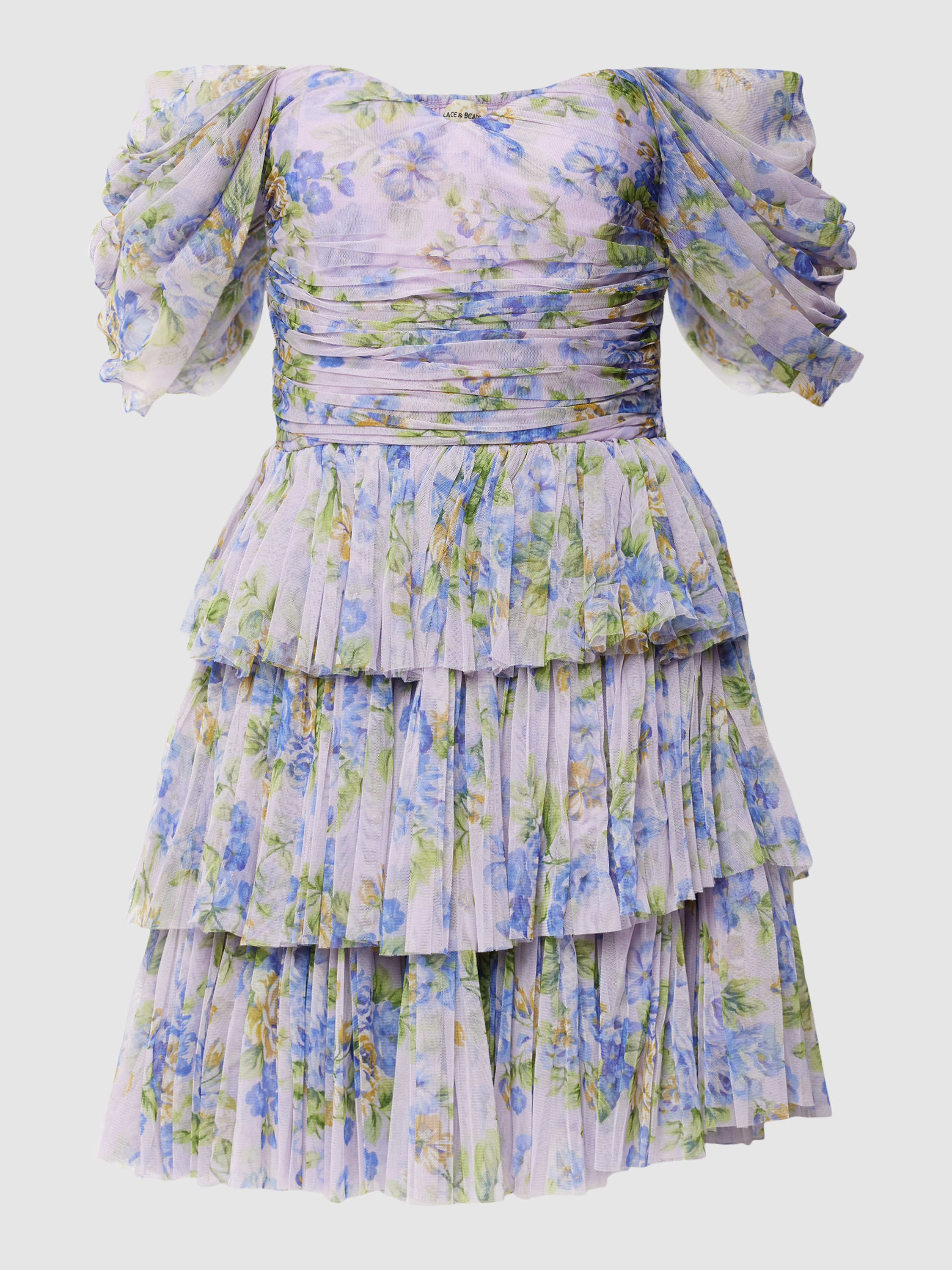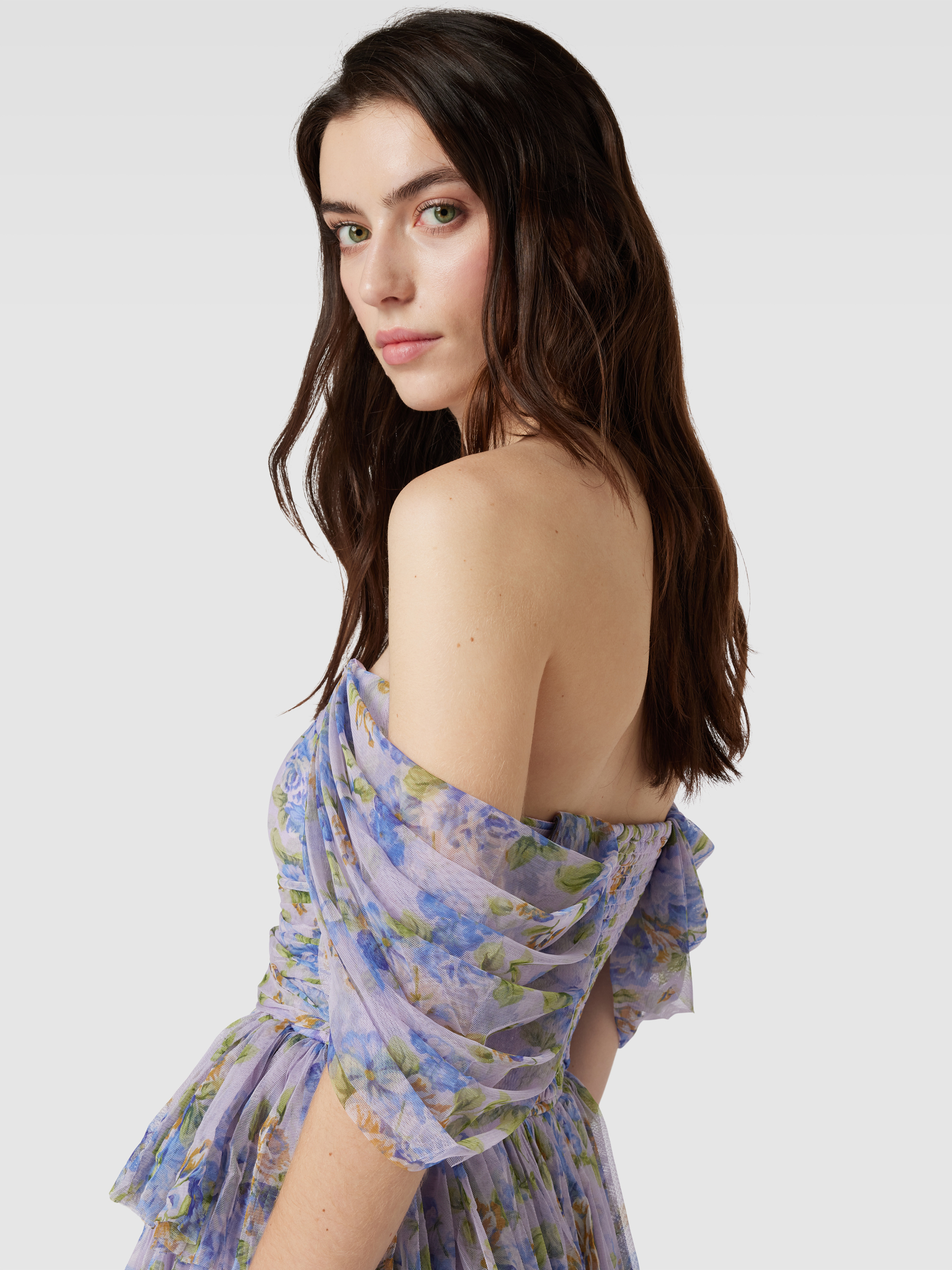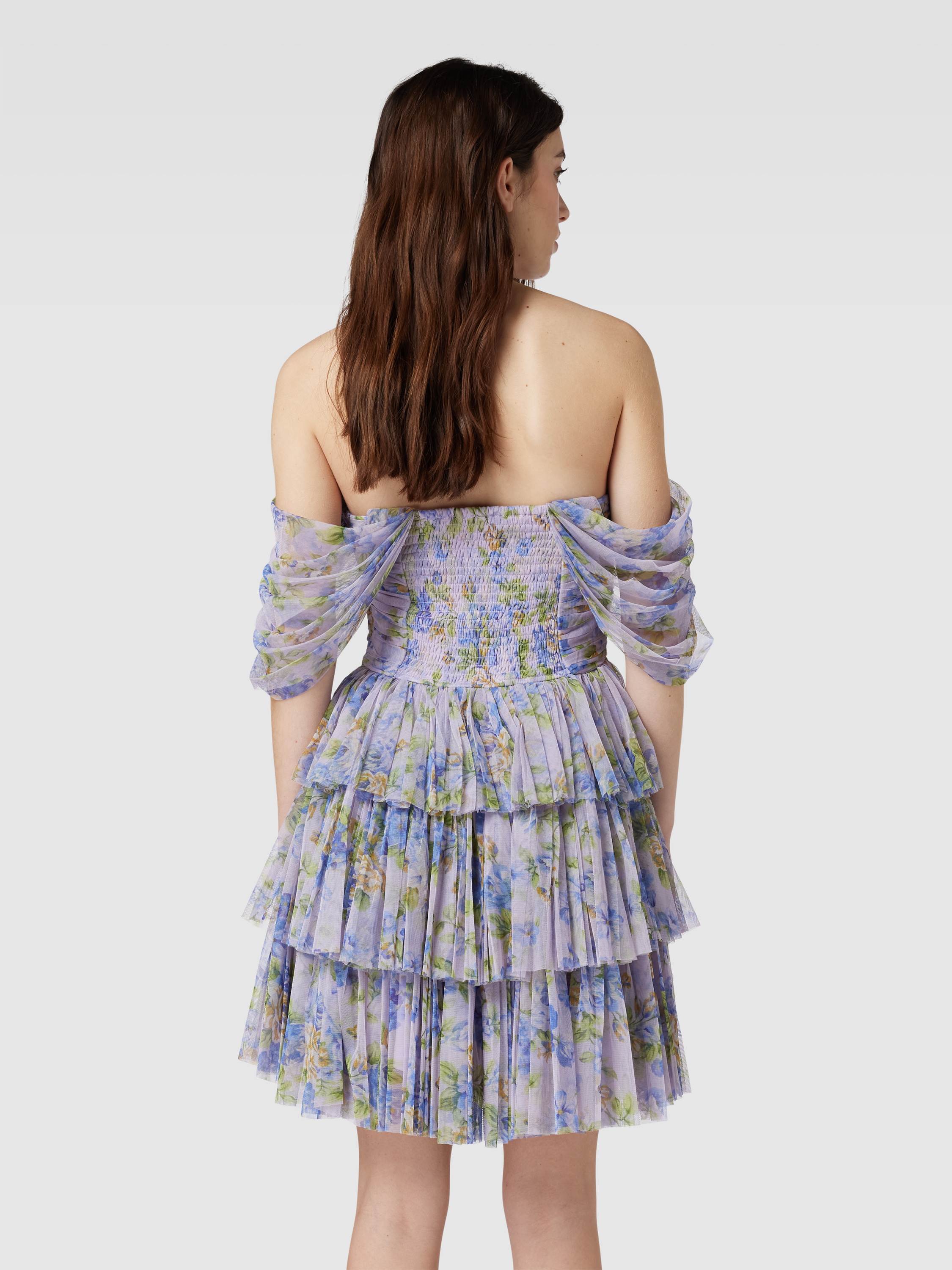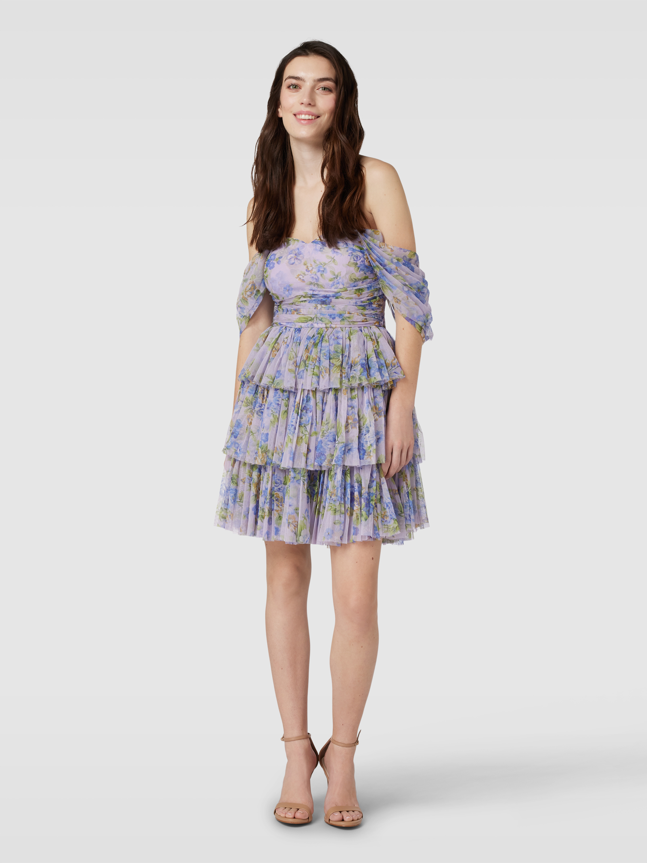 Das Damen Cocktailkleid von Lace & Beads fällt durch den ausgestellten Schnitt und die Knielänge angenehm locker, während der feine Tüll für eine zarte Haptik sorgt. Der florale Print und die Volants setzen verspielte Akzente, unterstützt von sanften Raffungen im Stufen-Look. Durch den Off-Shoulder-Stil mit Herz-Ausschnitt entsteht eine feminine Silhouette, die Bewegungsfreiheit mit leichtem Tragegefühl verbindet.