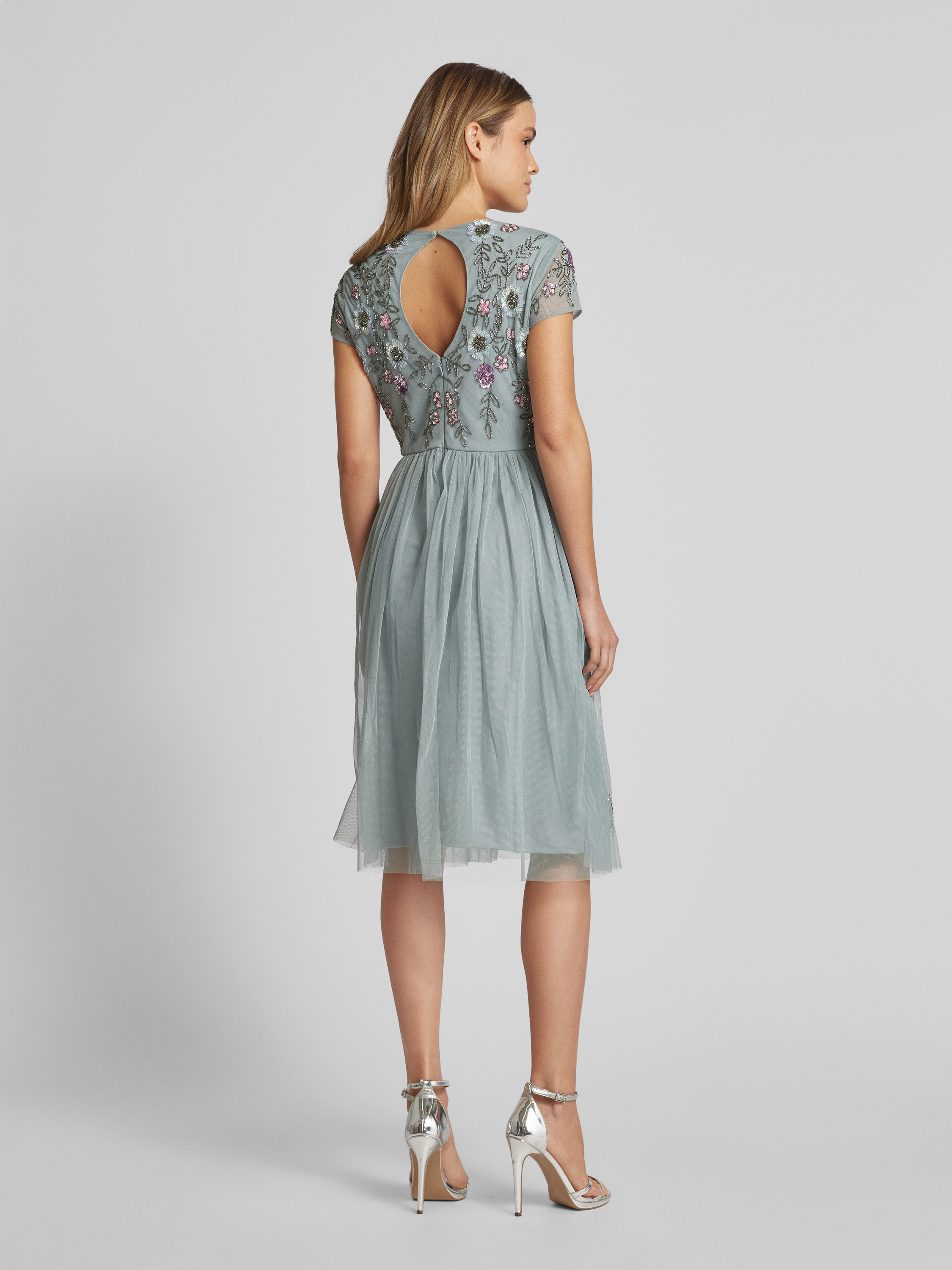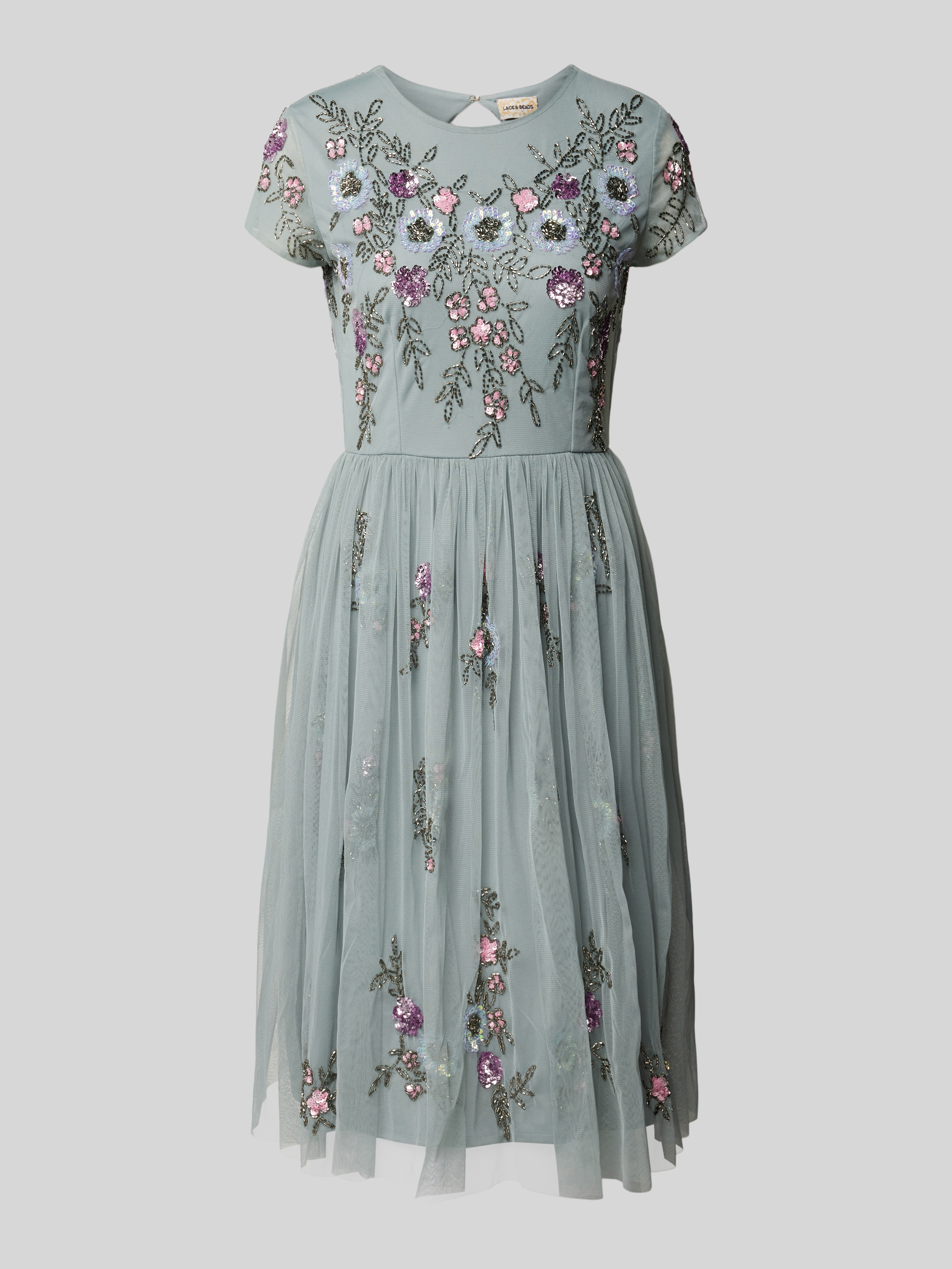 Das Damen Cocktailkleid von Lace & Beads kombiniert strapazierfähiges Material mit einem leicht taillierten Schnitt, der sanft die Silhouette umspielt. Ein floraler Paillettenbesatz verleiht dem Tüll-Rockteil eine besondere Note, während der Rundhalsausschnitt und die verkürzten Ärmel zeitlose Eleganz ausstrahlen.