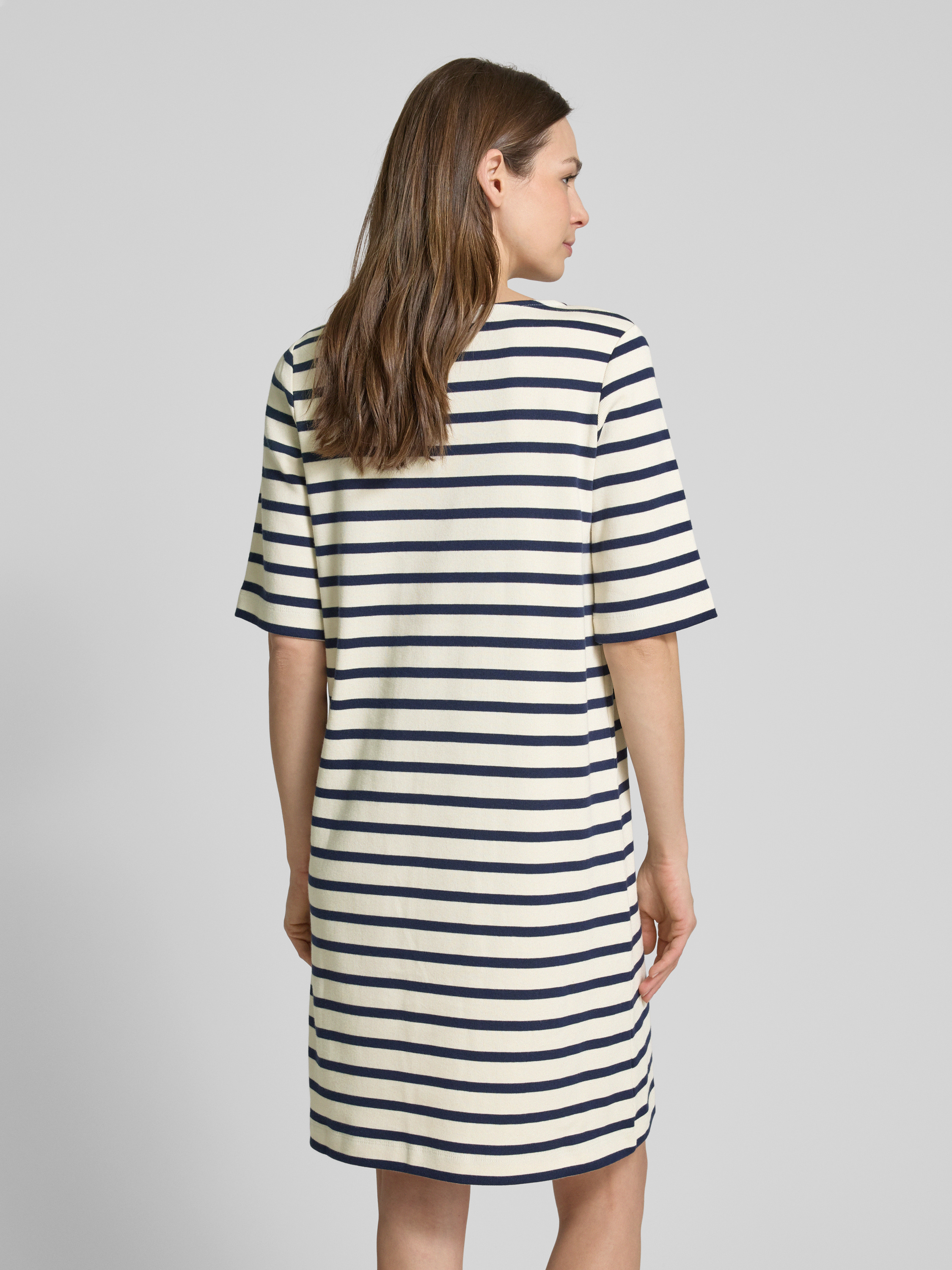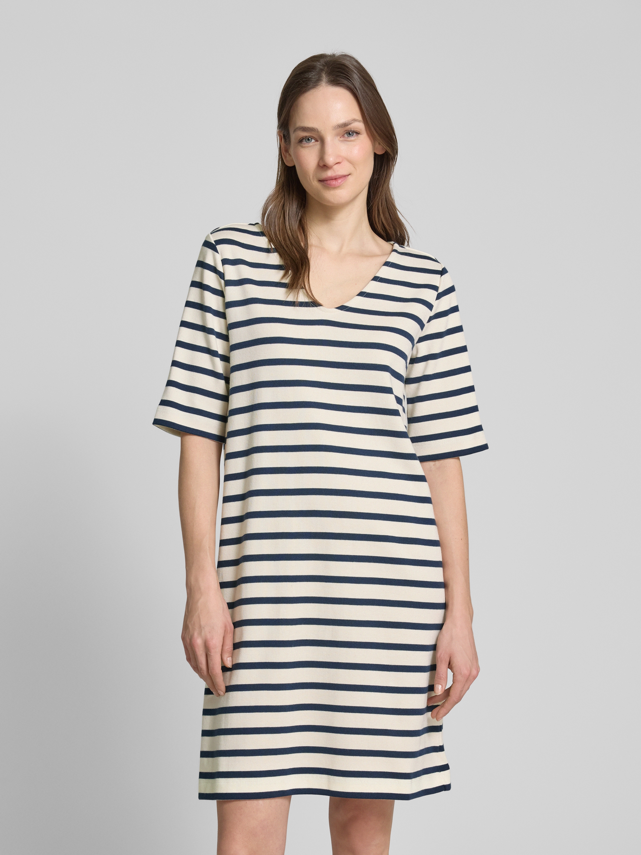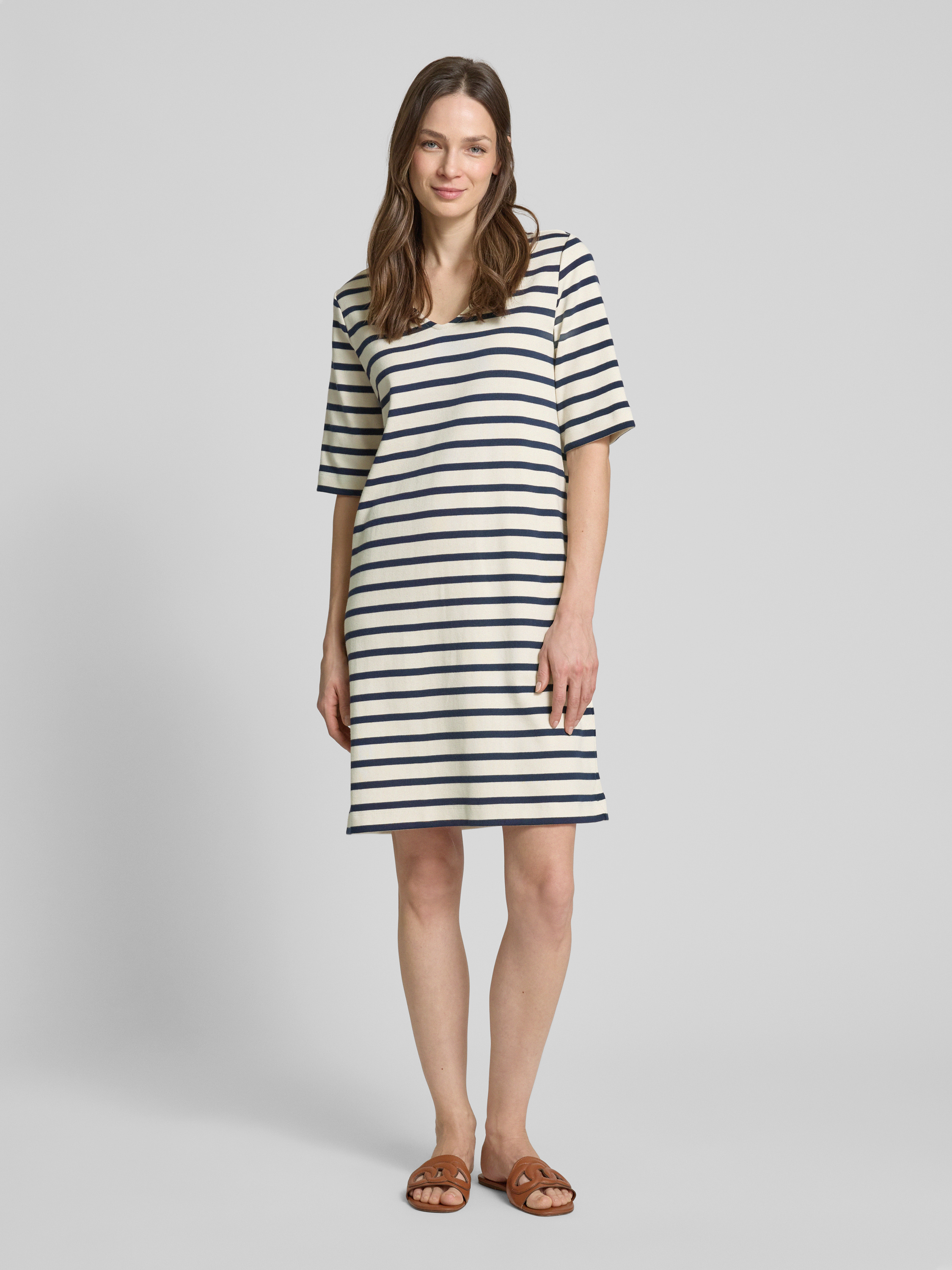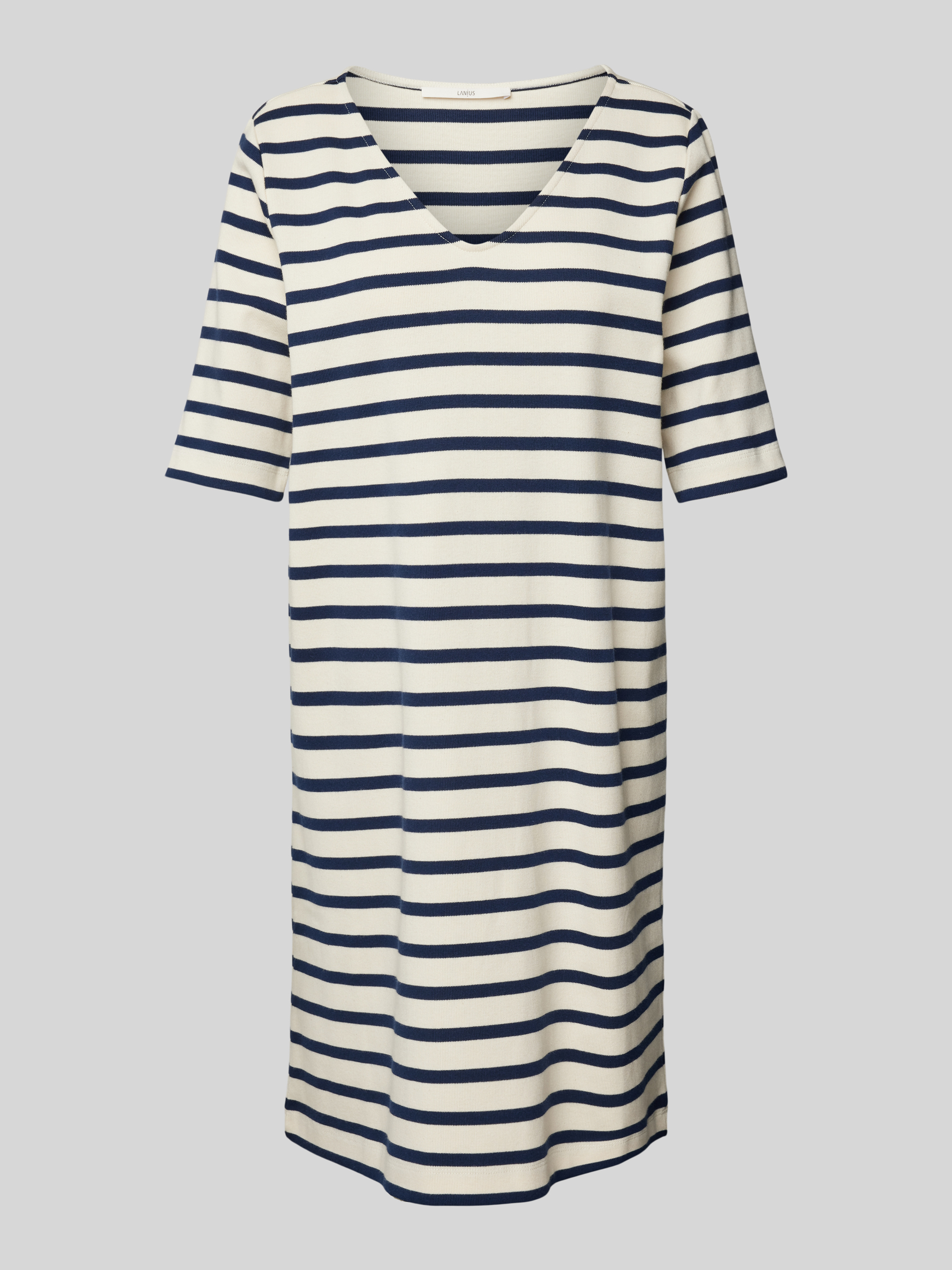 Das knielange T-Shirt-Kleid von Lanius aus reiner Mako Baumwolle kombiniert schlichte Eleganz mit hohem Tragekomfort. Der gerade Schnitt und der V-Ausschnitt verleihen dem Kleid eine luftige Leichtigkeit, die sich ideal für entspannte Sommertage eignet. Das Kleid bietet Flexibilität und Bewegungsfreiheit.
