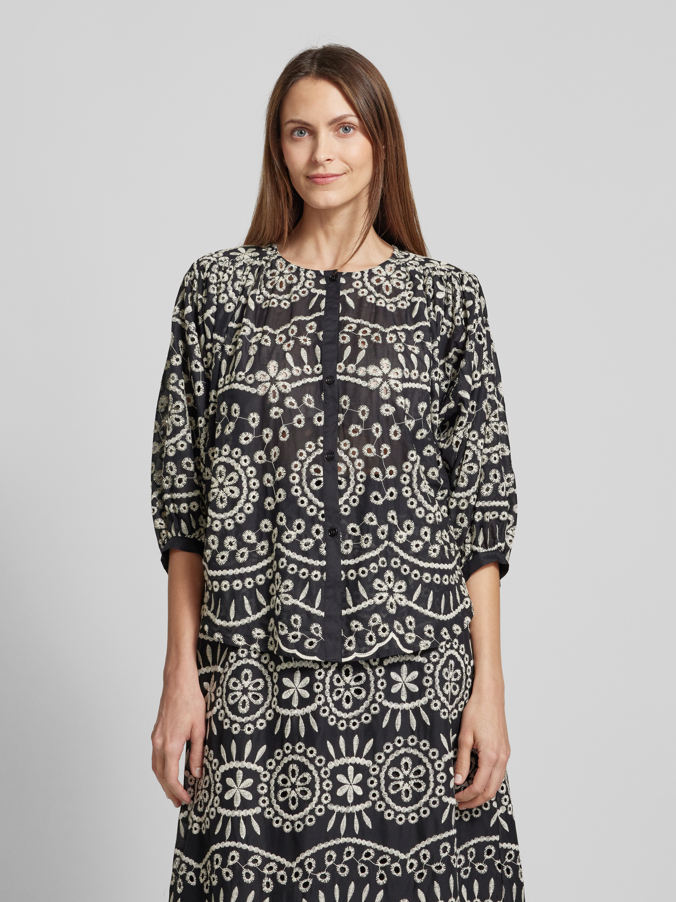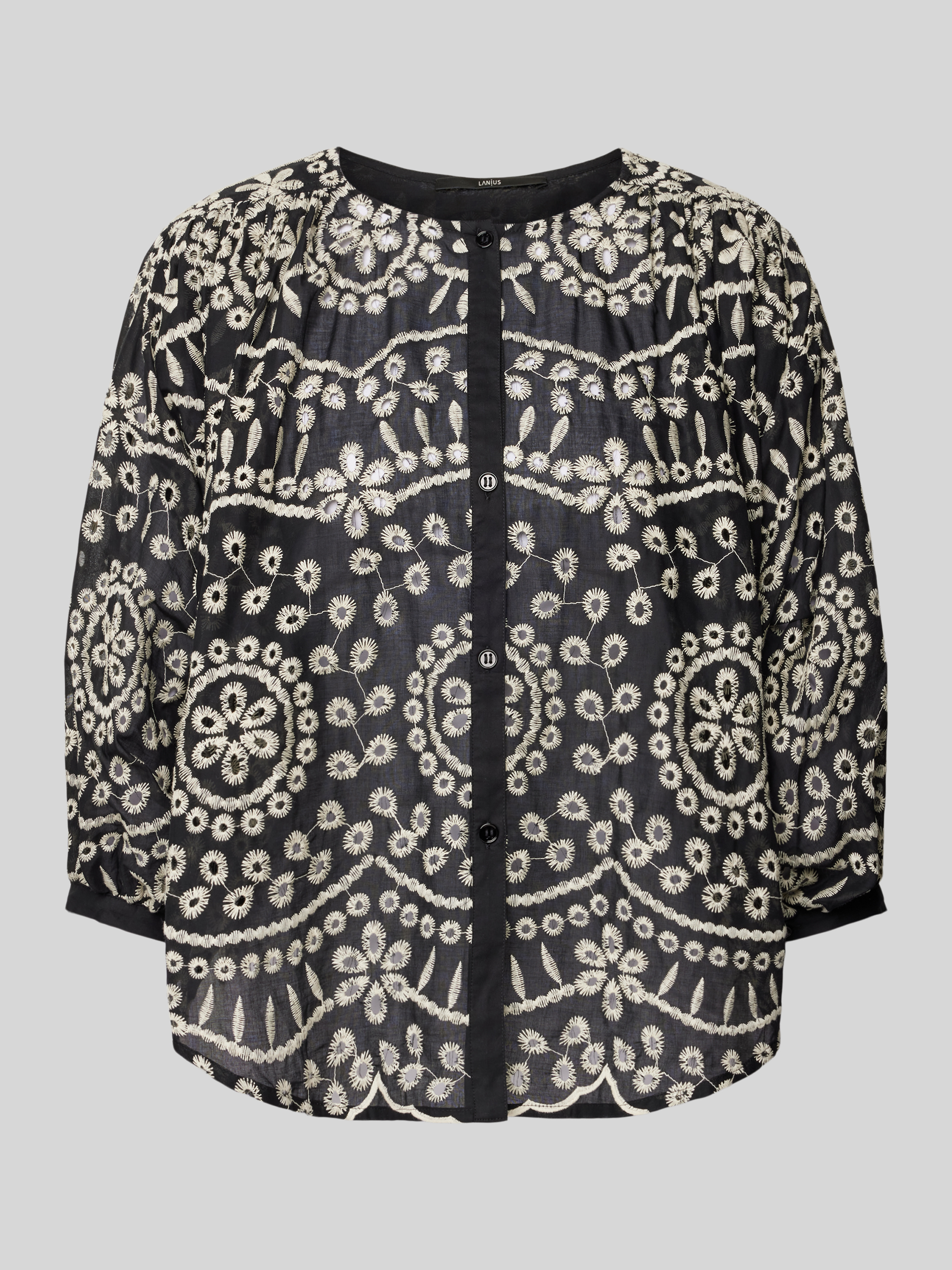 Die Damen Bluse von Lanius aus reiner Baumwolle kombiniert einen entspannten Schnitt mit einem dezenten Rundhalsausschnitt und 3/4-Ärmeln. Die durchgehende Knopfleiste und die feine Lochstickerei verleihen dem Kleidungsstück eine elegante Note, die vielseitig einsetzbar ist.