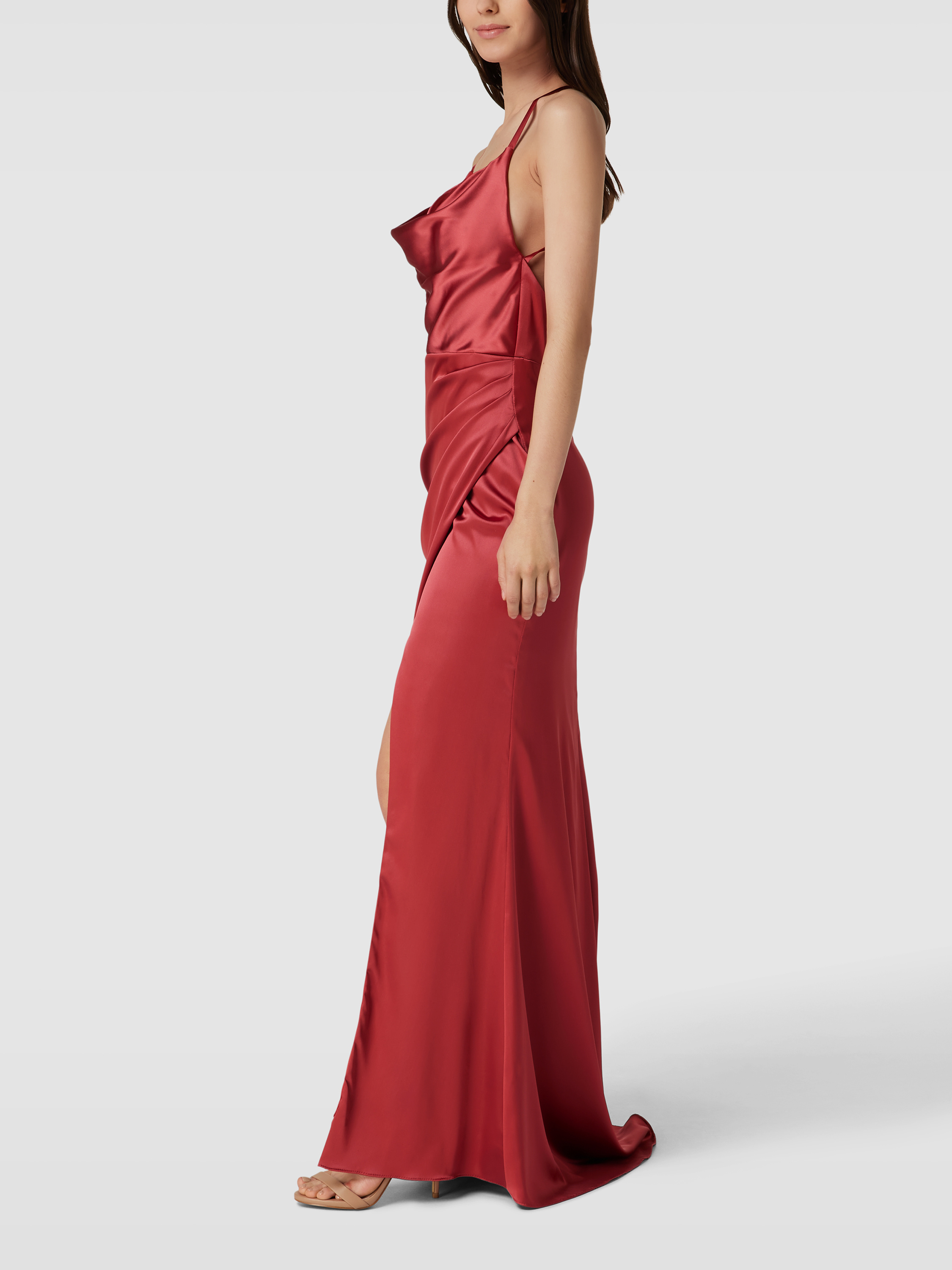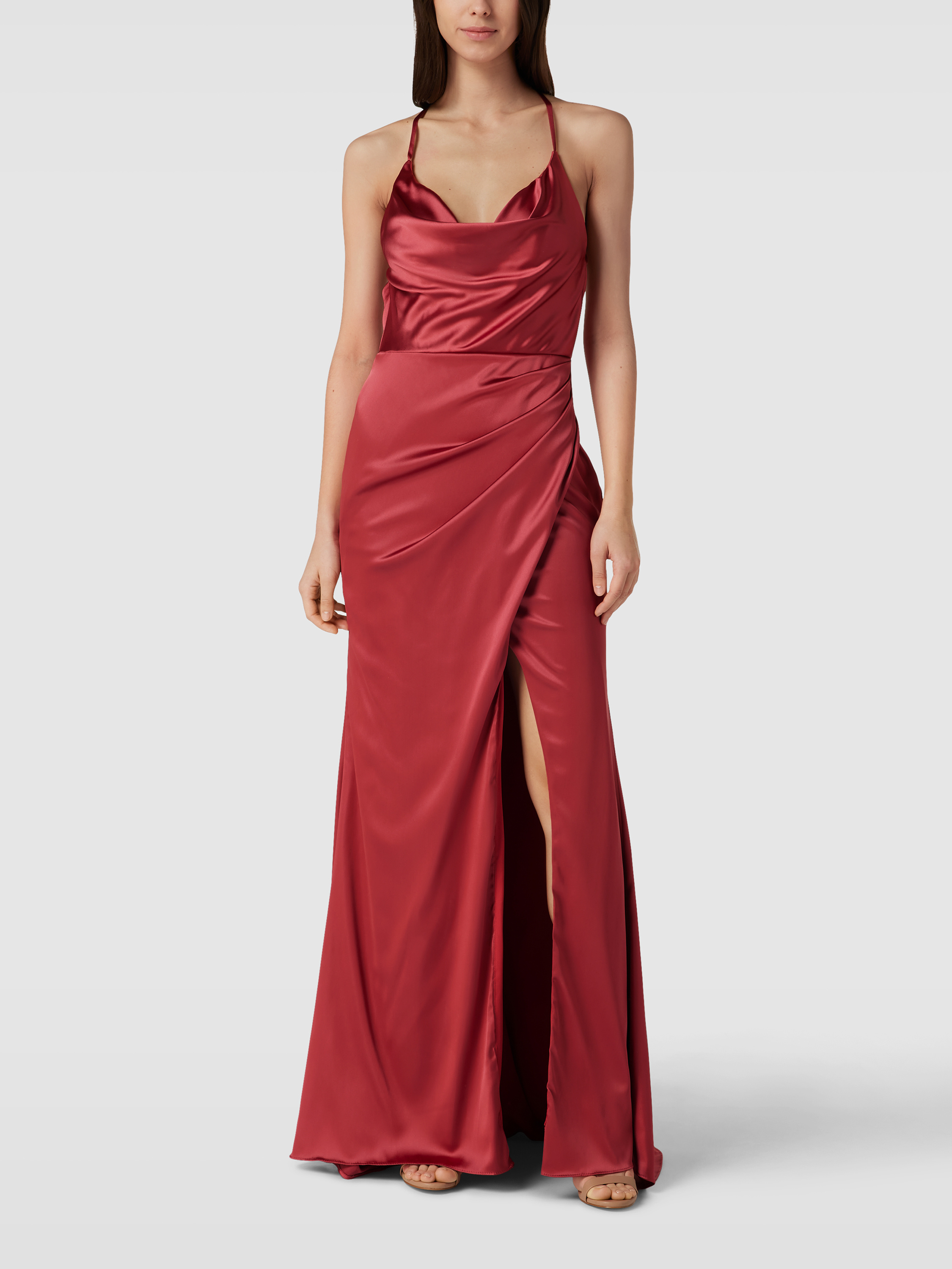 Das Abendkleid von LAONA umhüllt mit seiner Wickel-Optik und dem fließenden Satin sanft die Silhouette und sorgt für einen eleganten Auftritt. Der Wasserfall-Ausschnitt und die Raffungen setzen subtile Akzente, während der Gehschlitz Bewegungsfreiheit bietet. Ein Unterkleid sorgt für zusätzlichen Komfort.