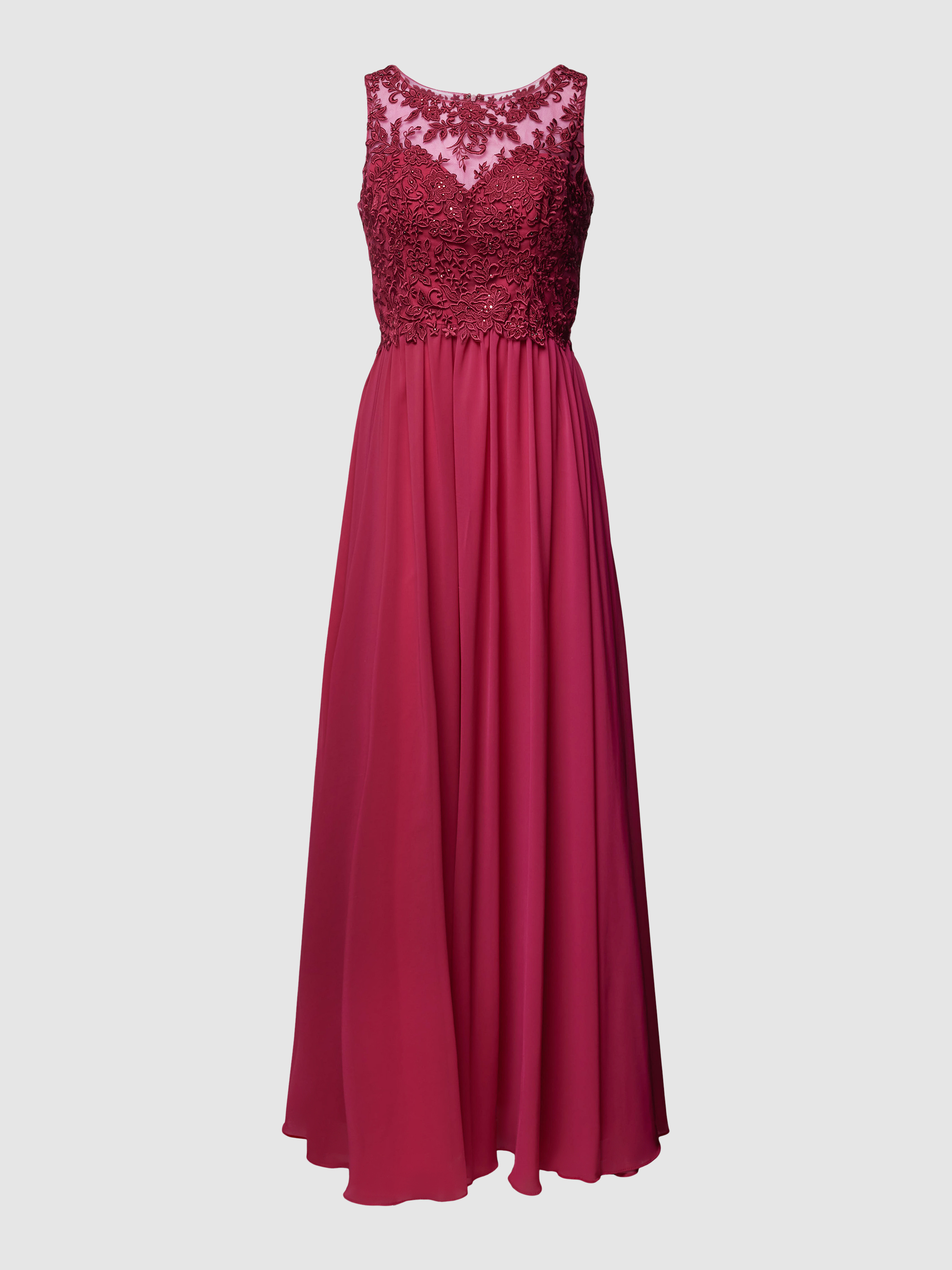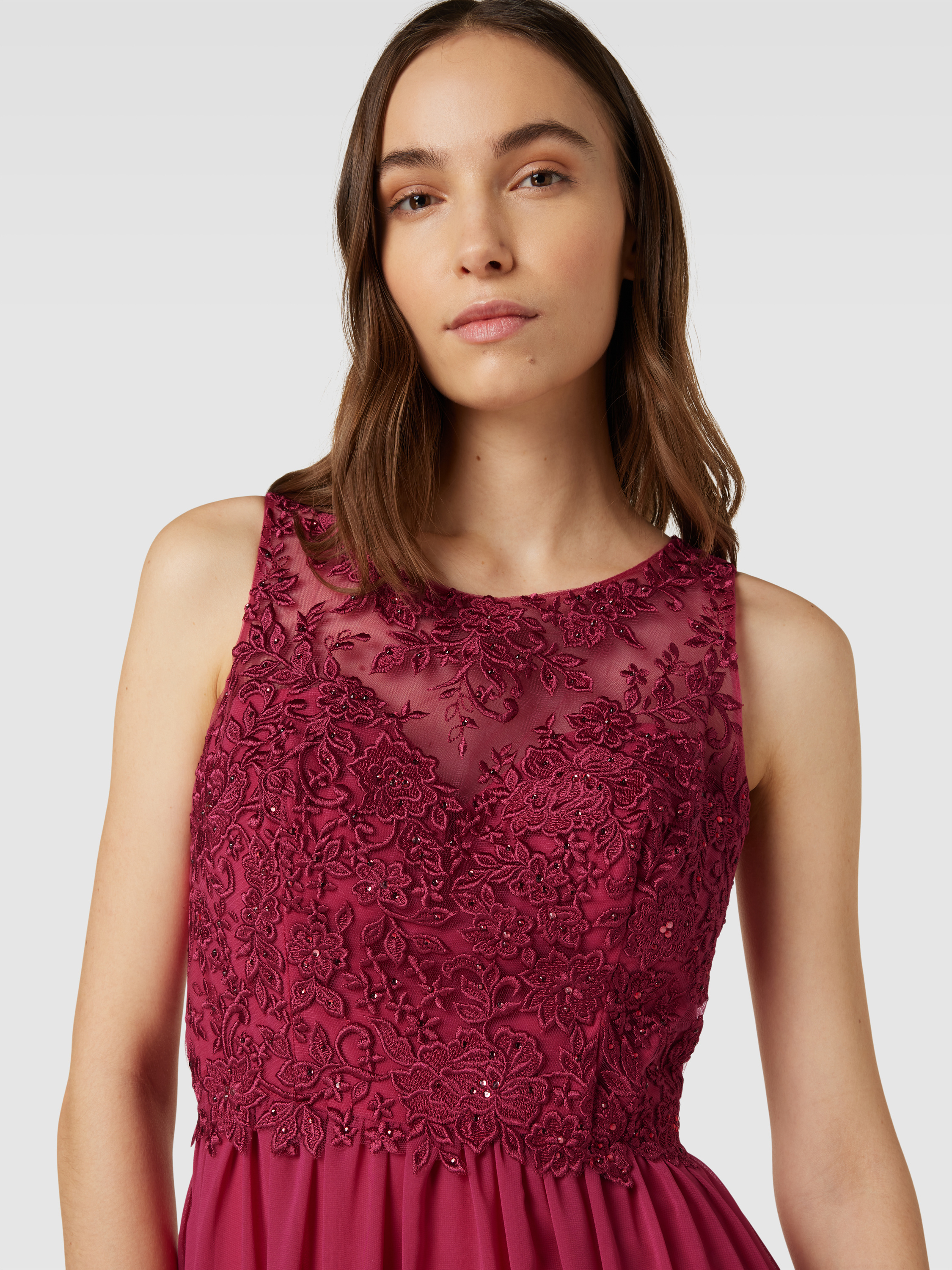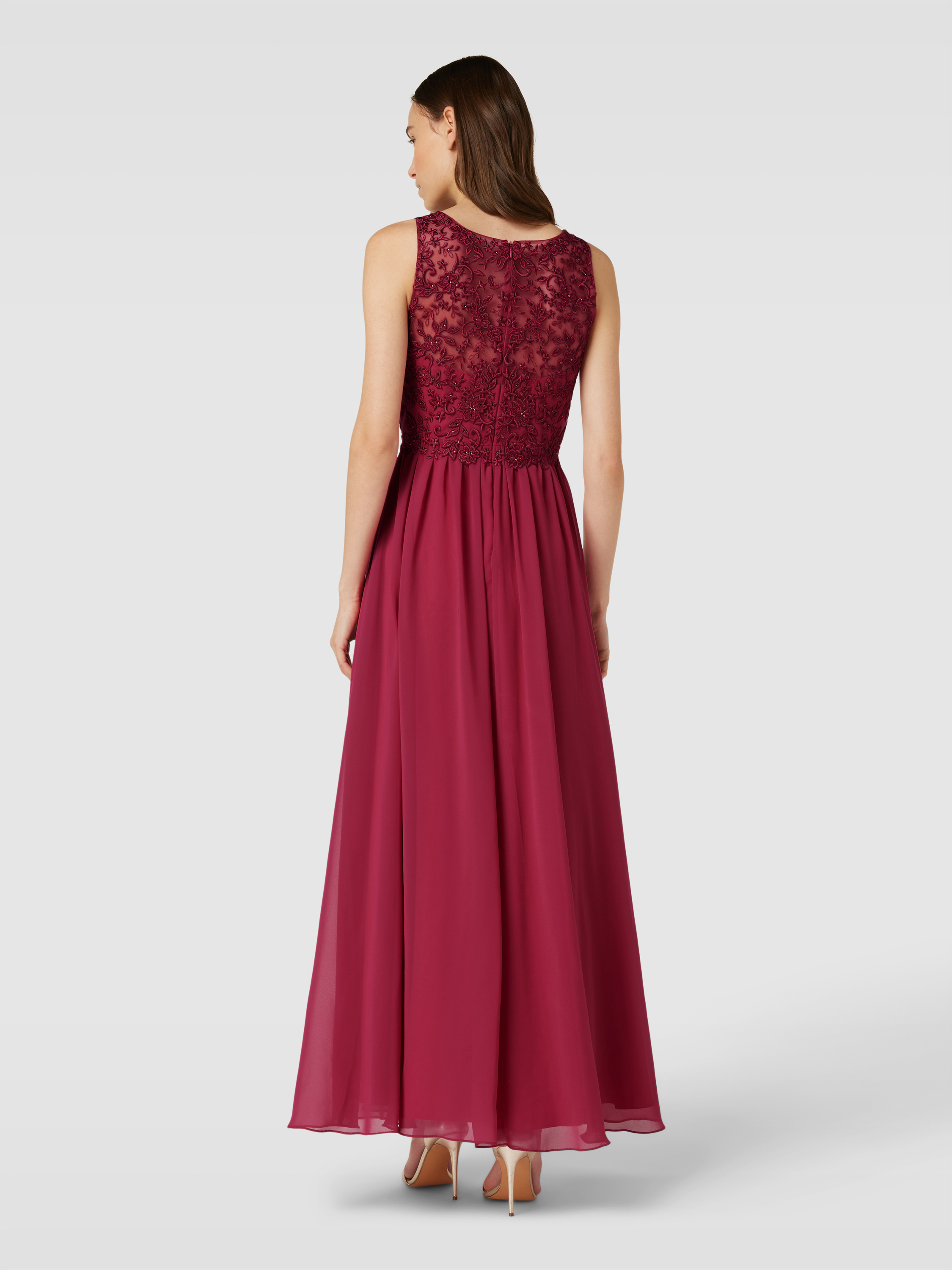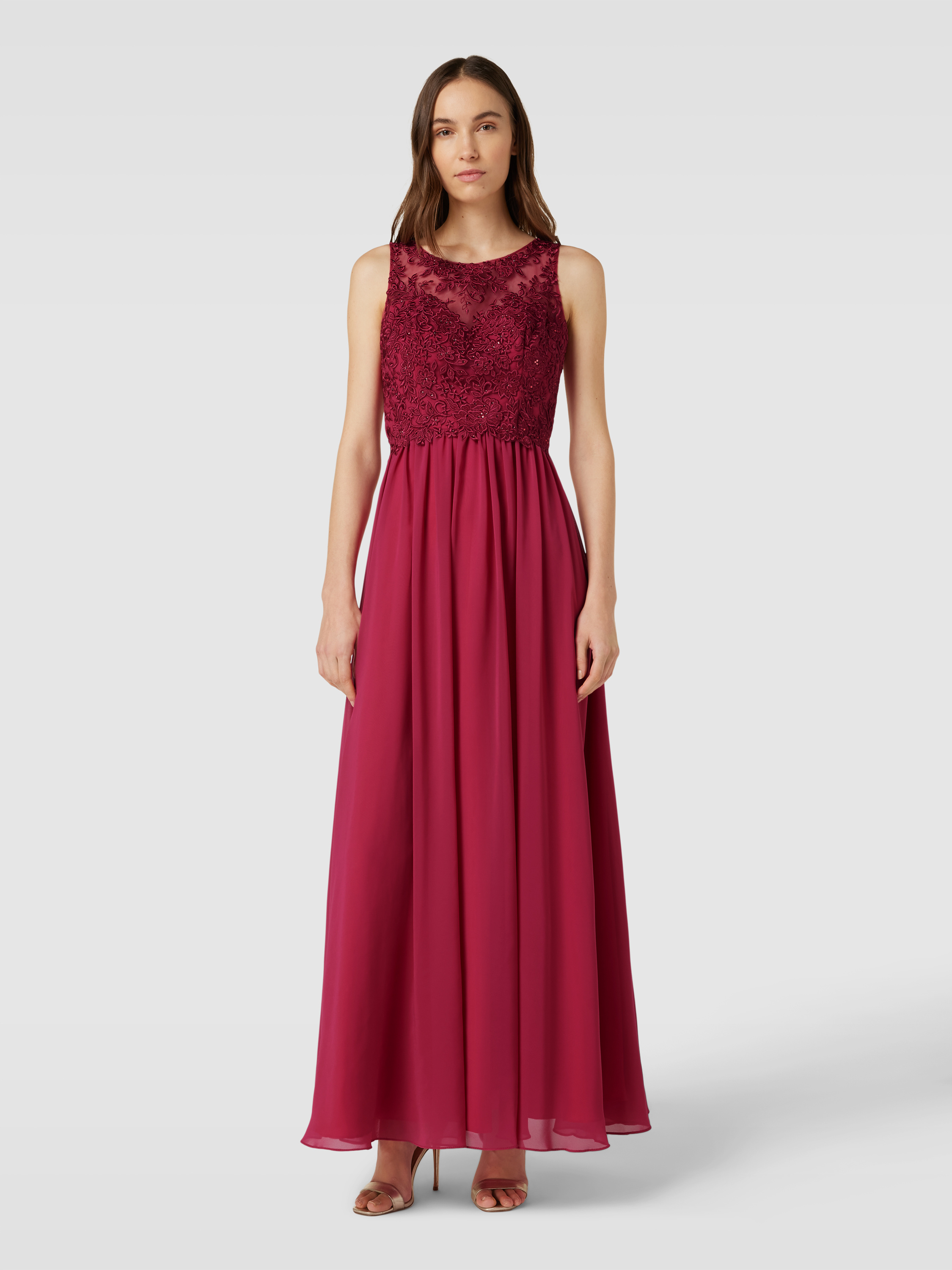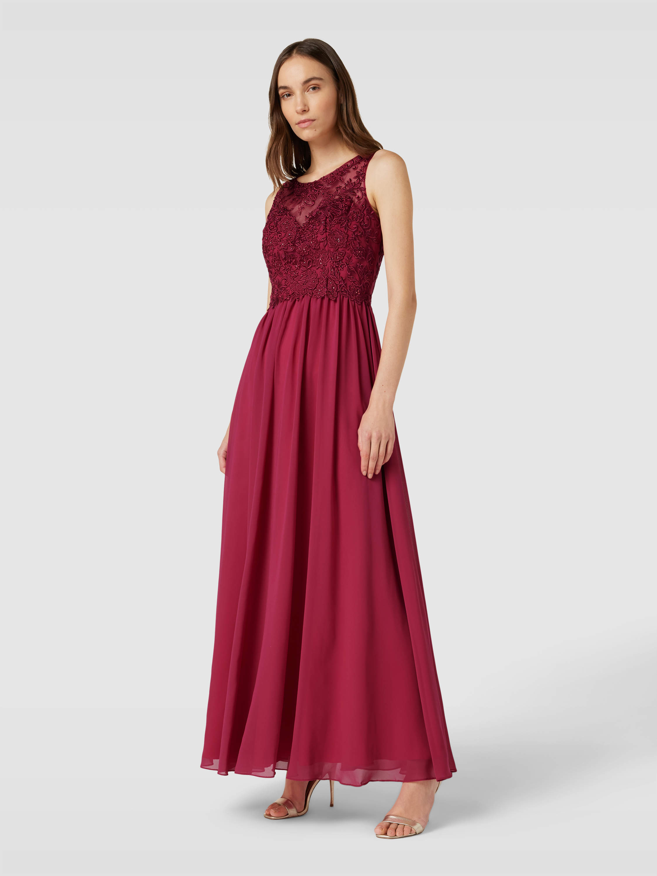 Das Abendkleid von LAONA besticht durch seine elegante A-Linie und das unifarbene Design, welches durch florale Spitze und funkelnde Ziersteine dezent veredelt wird. Der Rundhalsausschnitt verleiht dem Maxikleid eine klassische Note, während das blickdichte Unterkleid für angenehmen Tragekomfort sorgt. Ideal für besondere Anlässe.