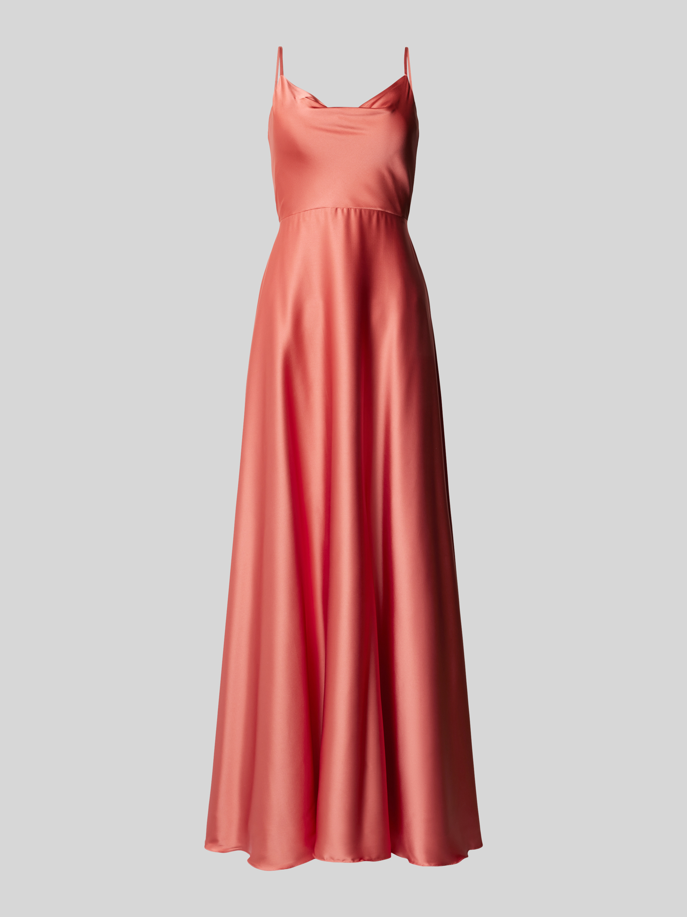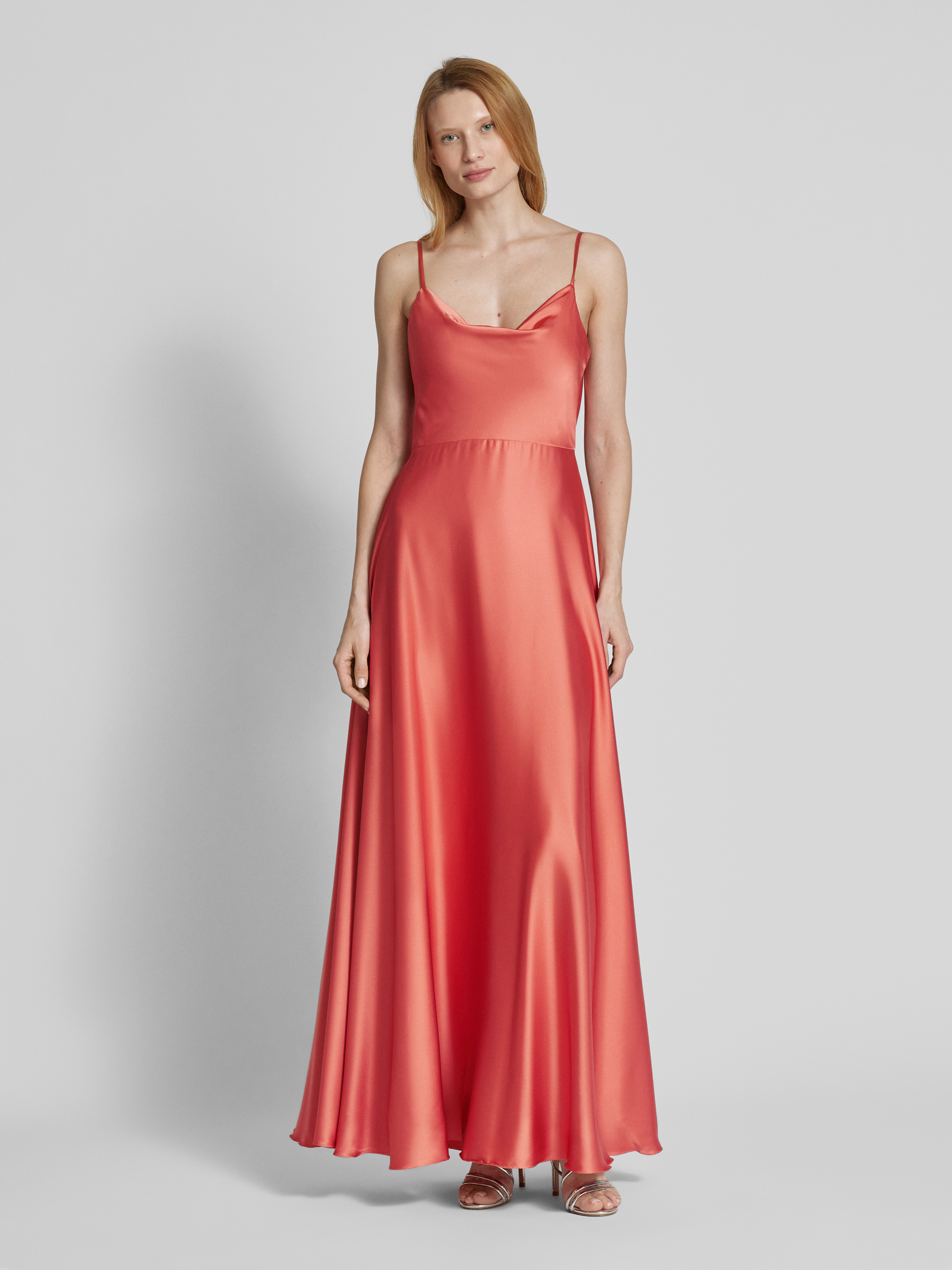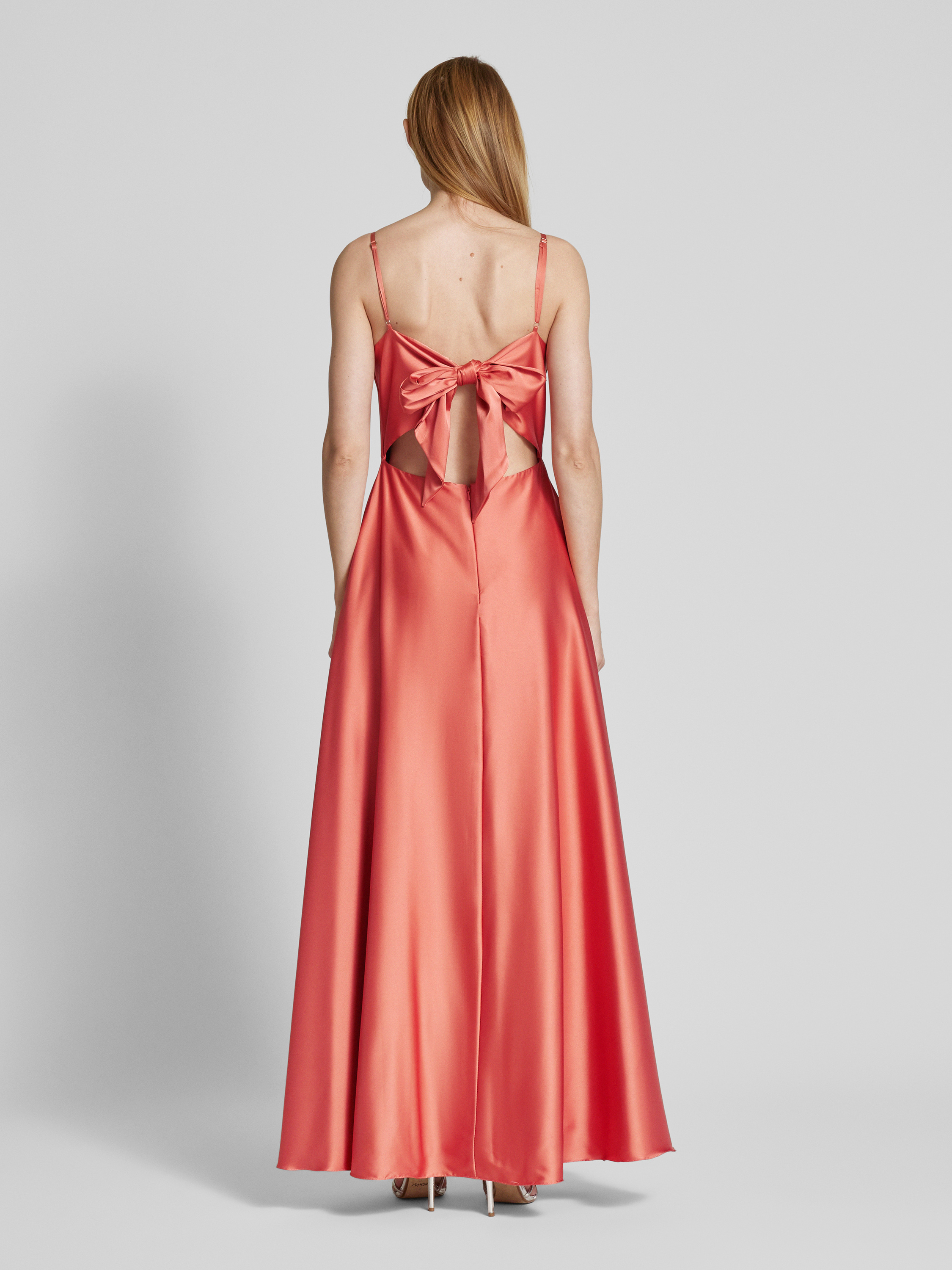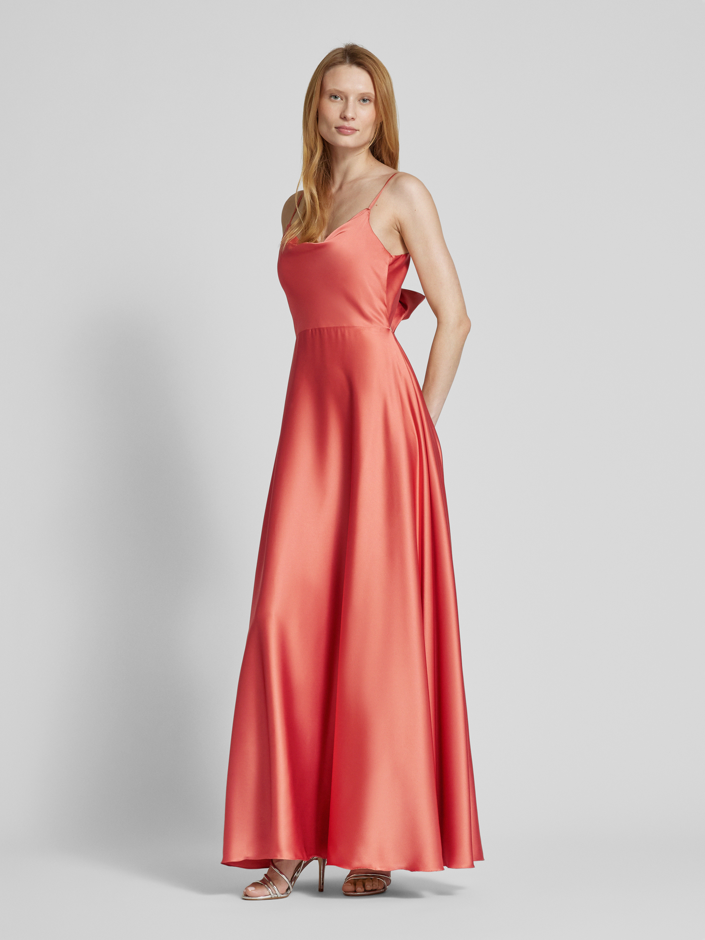Das LAONA Abendkleid mit Spaghettiträgern aus glänzendem Satin legt sich sanft an die Silhouette und betont durch die taillierte Form die Figur. Der Wasserfall-Ausschnitt sorgt für einen raffinierten Akzent, während der Rückenausschnitt mit Zierschleife dem Kleid eine besondere Note verleiht.