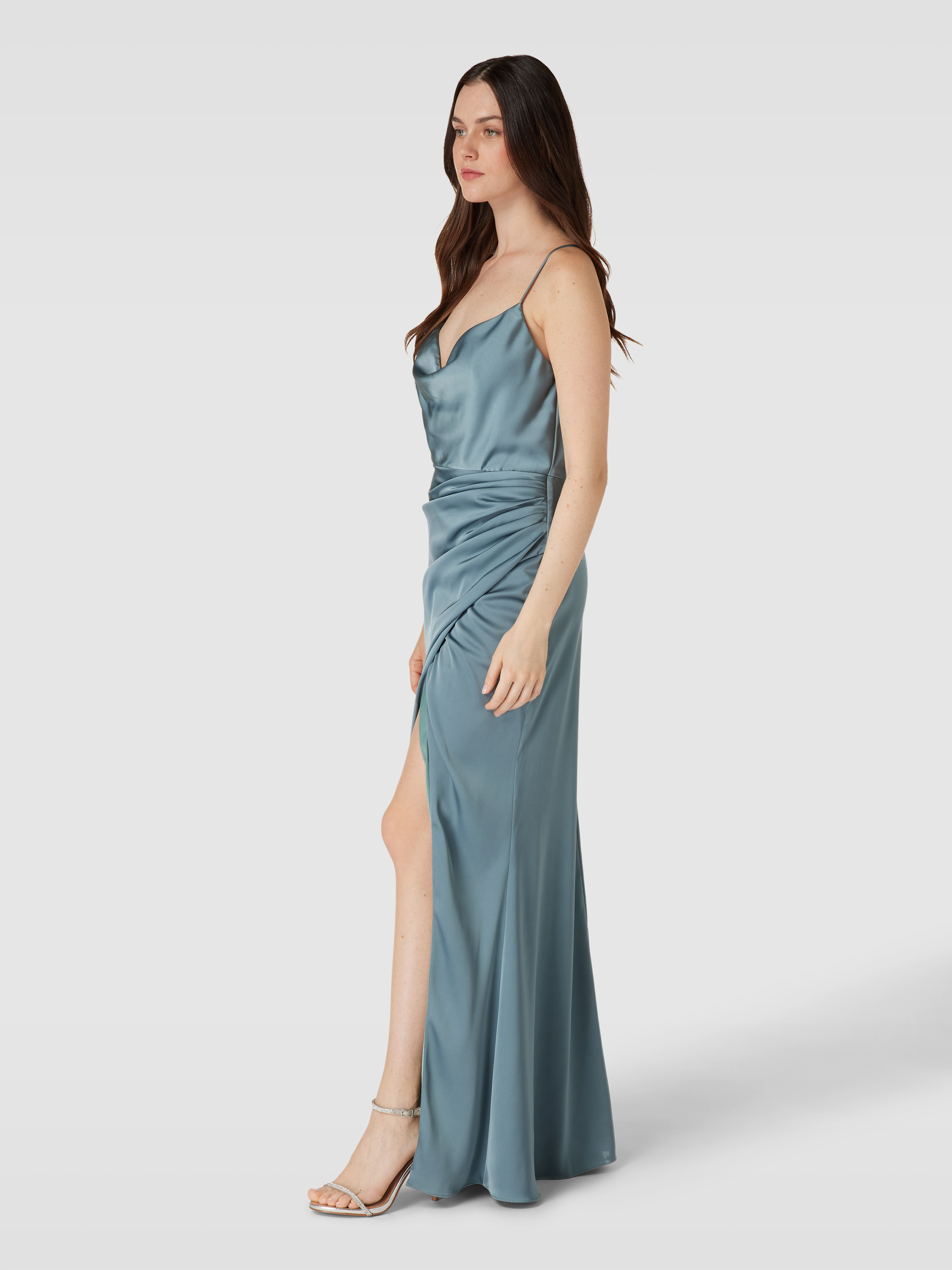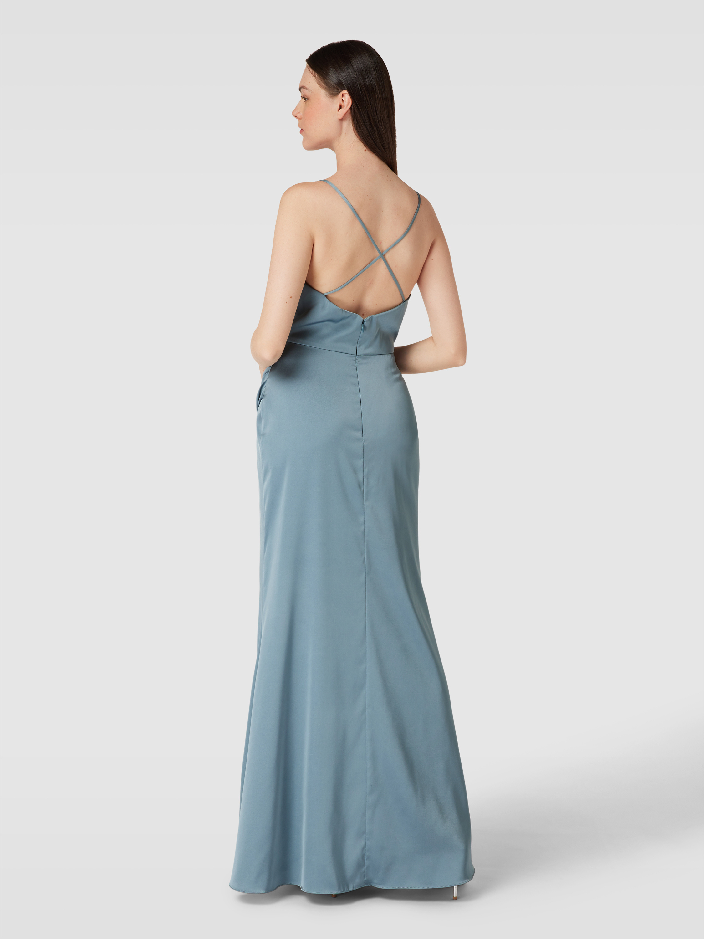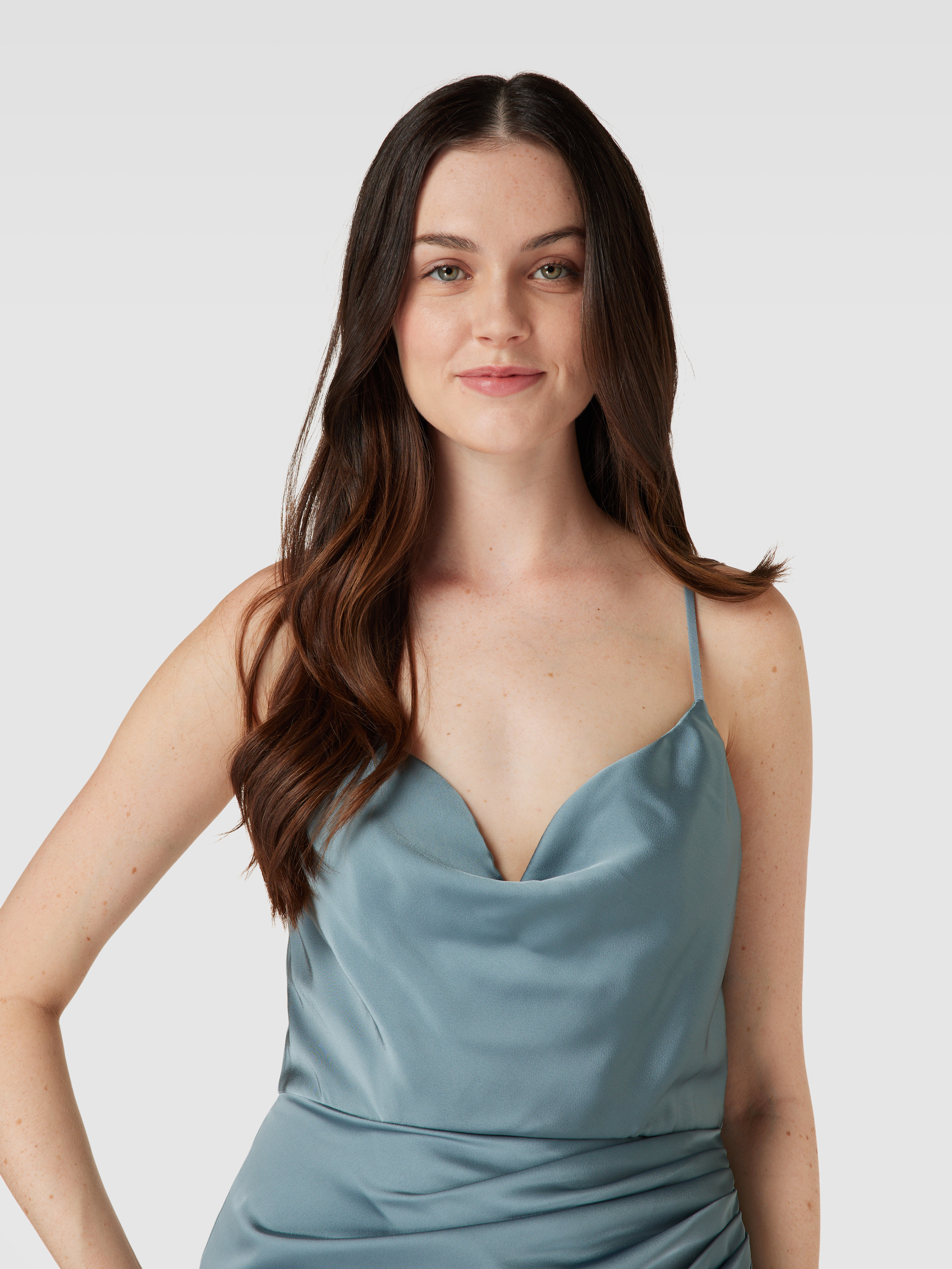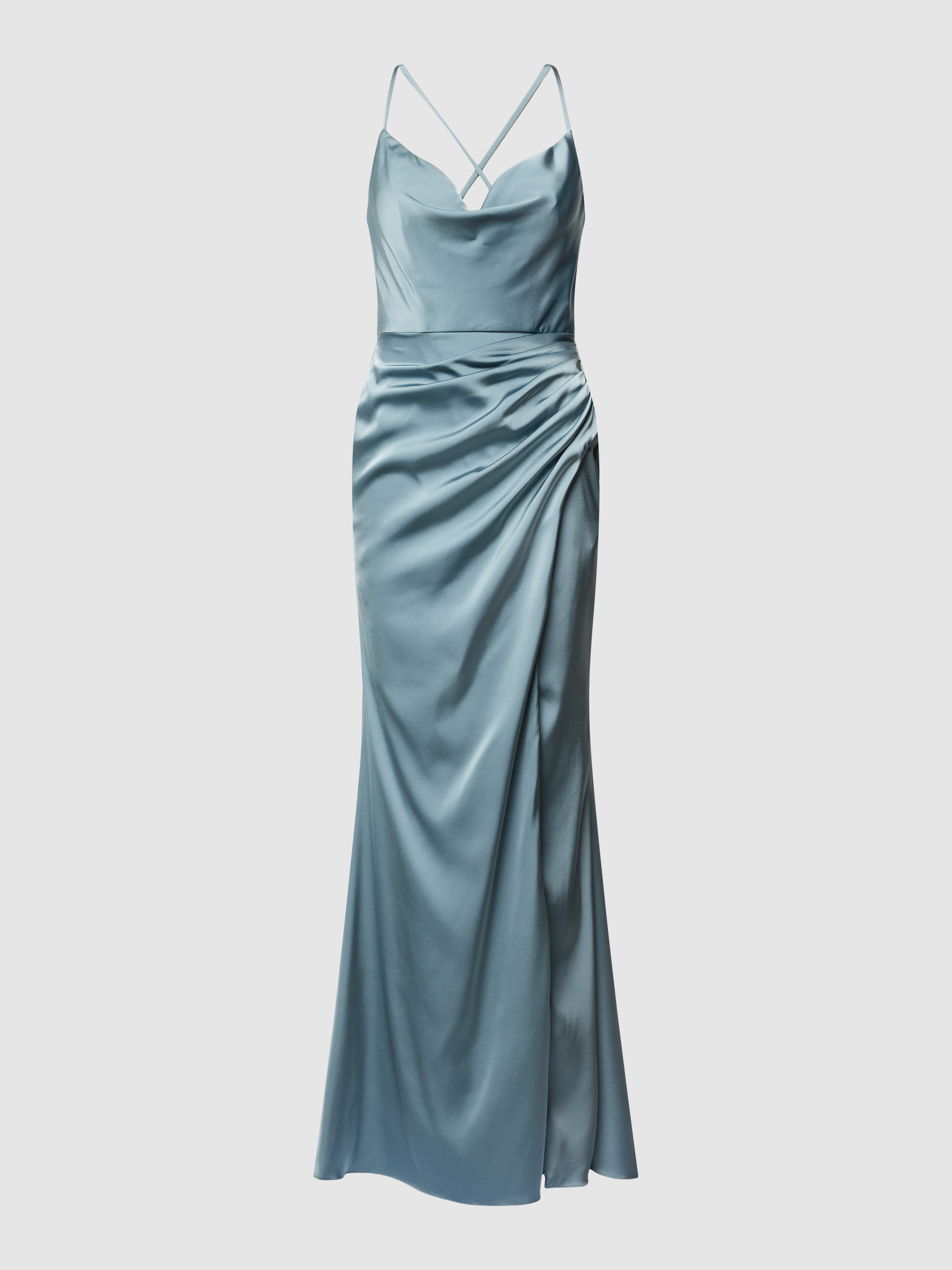 Das Abendkleid mit Wasserfall-Ausschnitt von LAONA schmiegt sich durch den taillierten Schnitt angenehm an die Silhouette. Weicher Satin sorgt für einen dezenten Glanz, während Spaghettiträger und ein gekreuzter Rücken das lange, unifarbene Design auflockern. Raffungen unterstreichen die fließende Form elegant.