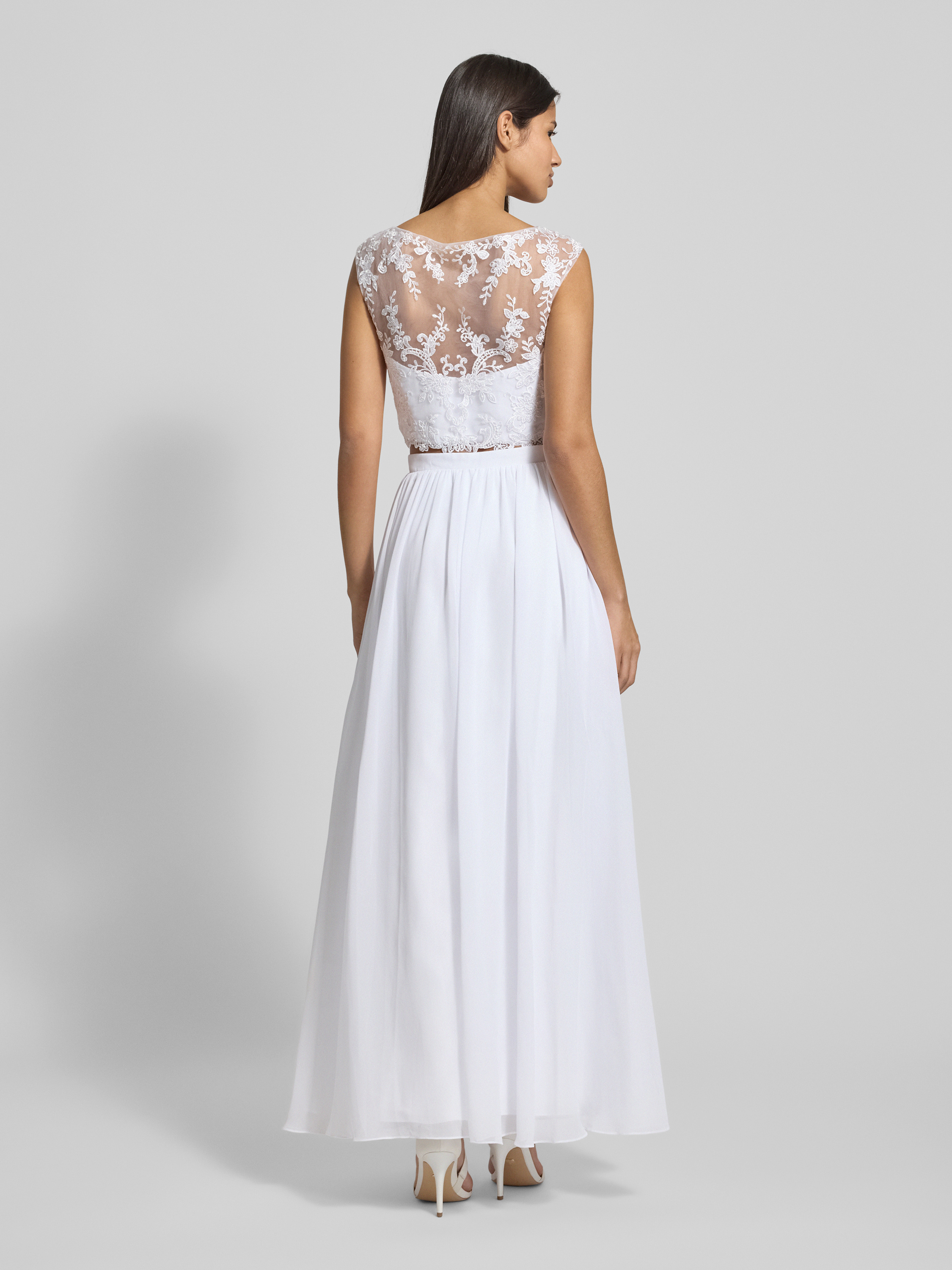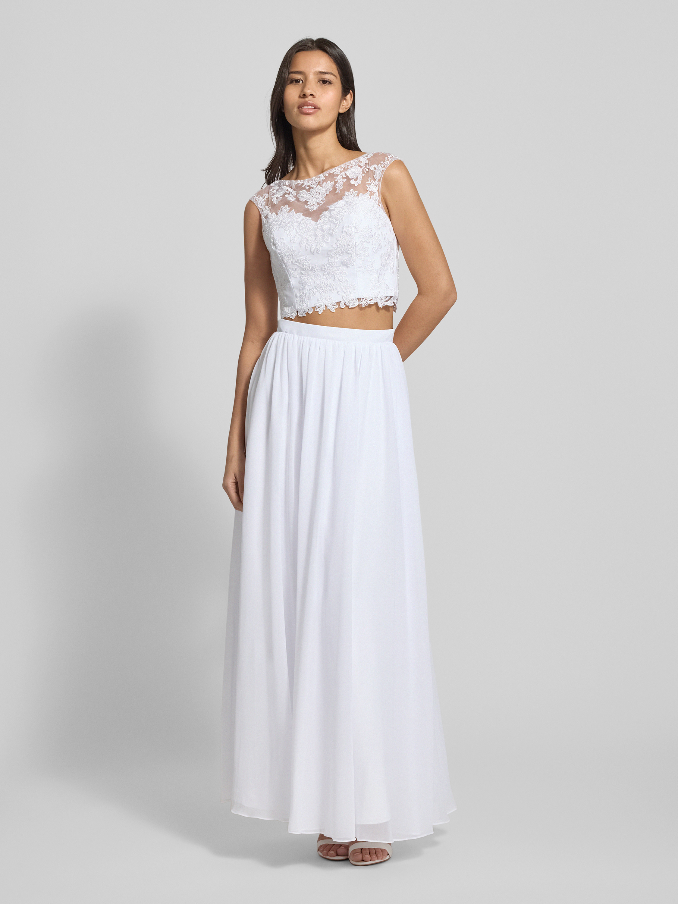 Das Damen Abendkleid von Laona zeigt sich mit Regular Fit und floralem Spitzenbesatz, wodurch ein stimmiger Mix aus klassischer Linie und verspieltem Detail entsteht. Das getrennte Oberteil und das semitransparente Design lassen sich angenehm tragen, während der blickdichte Unterrock für ein sicheres Gefühl sorgt. In Kombination mit der Falten-Optik ergibt sich ein harmonischer Gesamteindruck, den man vielseitig einsetzen kann.