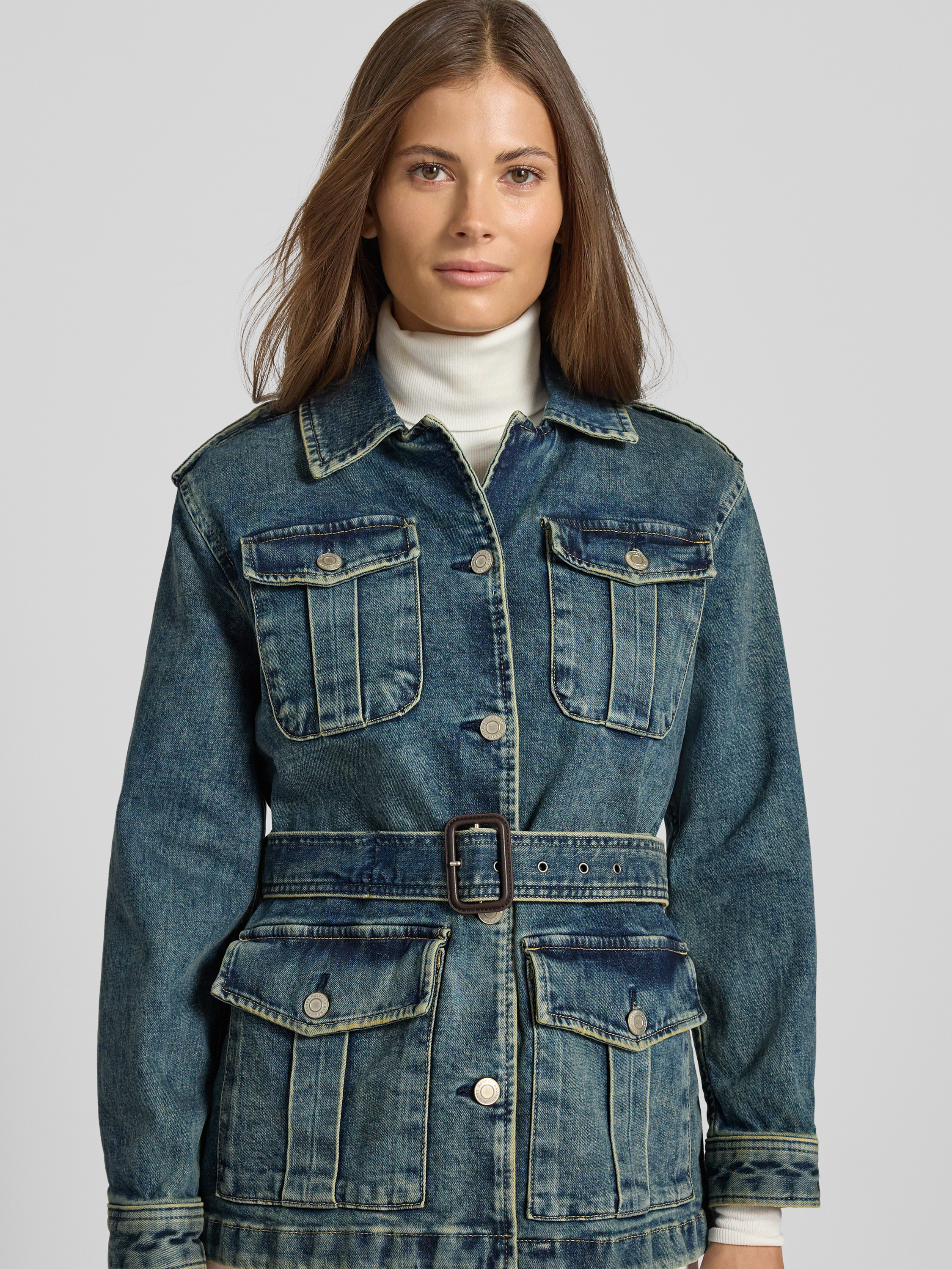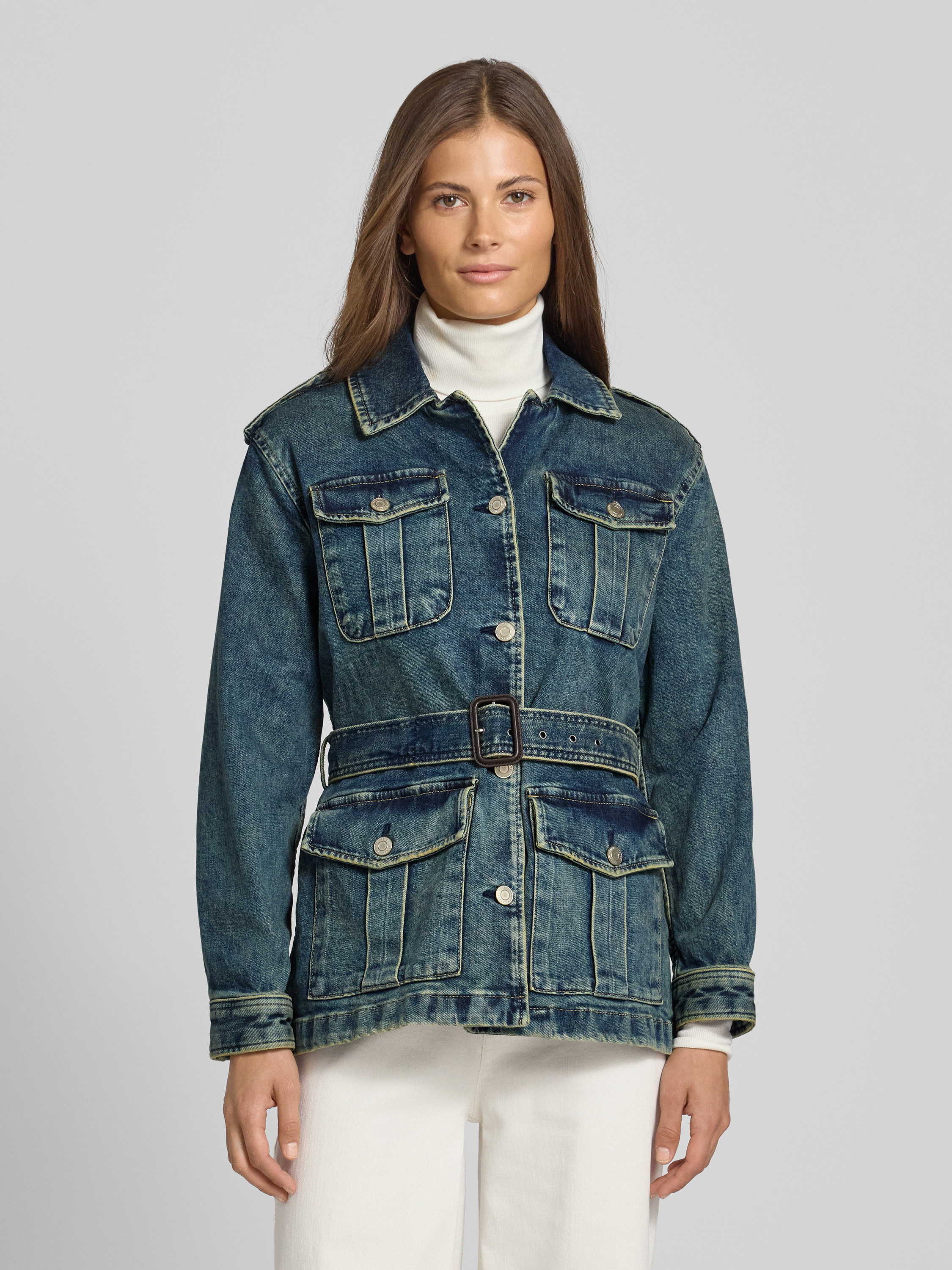 Die Jeansjacke 'Kufrell' von Lauren Ralph Lauren vereint einen Baumwoll-Mix mit einem angenehmen Stretch-Anteil, was eine bequeme, taillierte Passform ermöglicht. Der abnehmbare Taillengürtel und der Umlegekragen ergänzen das langärmelige Design mit Sportmanschetten stilvoll. Aufgesetzte Taschen und Schulterklappen bieten praktische Details.