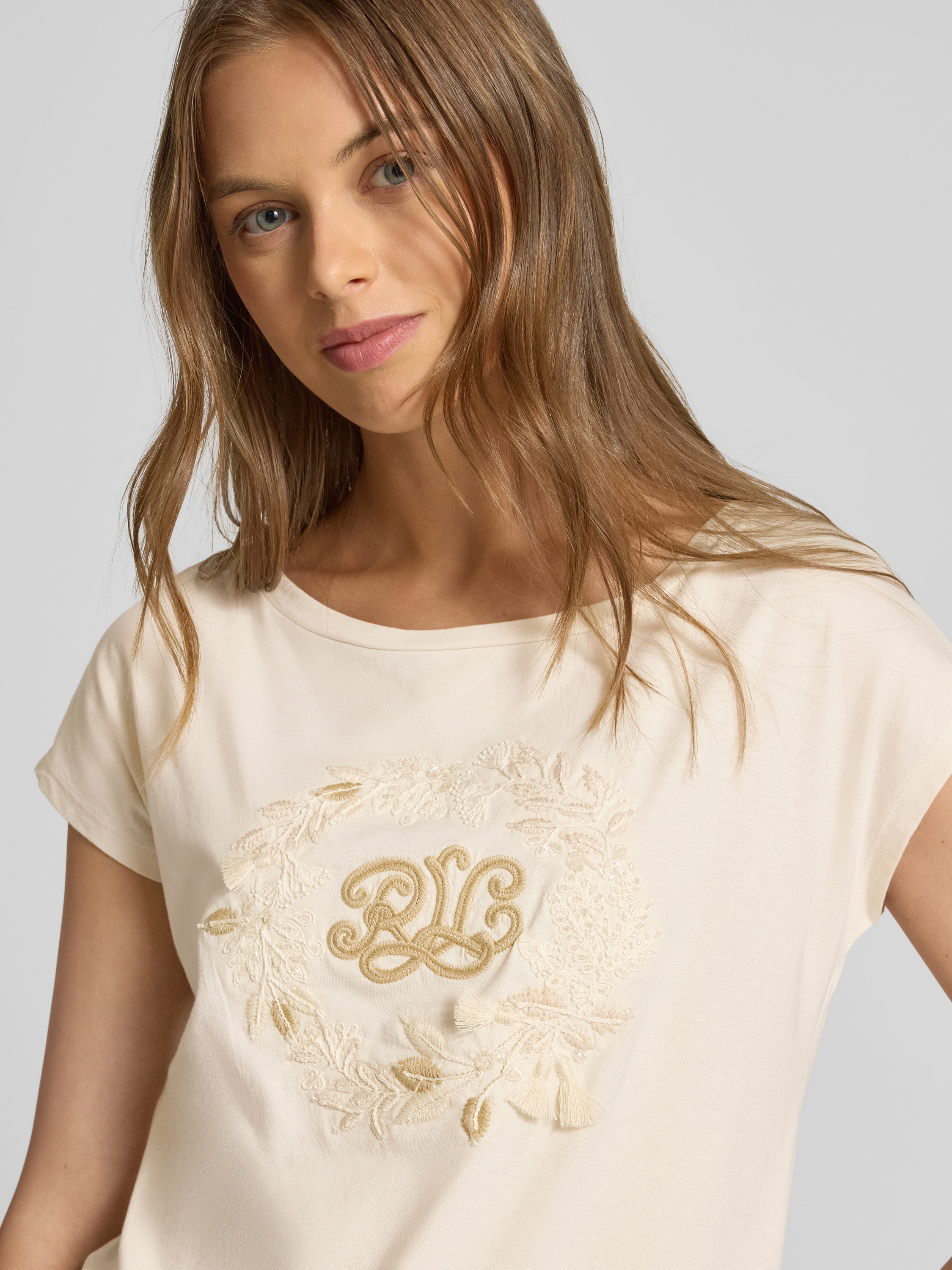 Das T-Shirt 'GRIETA' von Lauren Ralph Lauren, gefertigt aus reiner Baumwolle, zeichnet sich durch seinen lockeren Schnitt aus. Der gerippte U-Boot-Ausschnitt verleiht dem Design eine dezente Eleganz. Ein kleines Label-Detail rundet das Gesamtbild stilvoll ab.