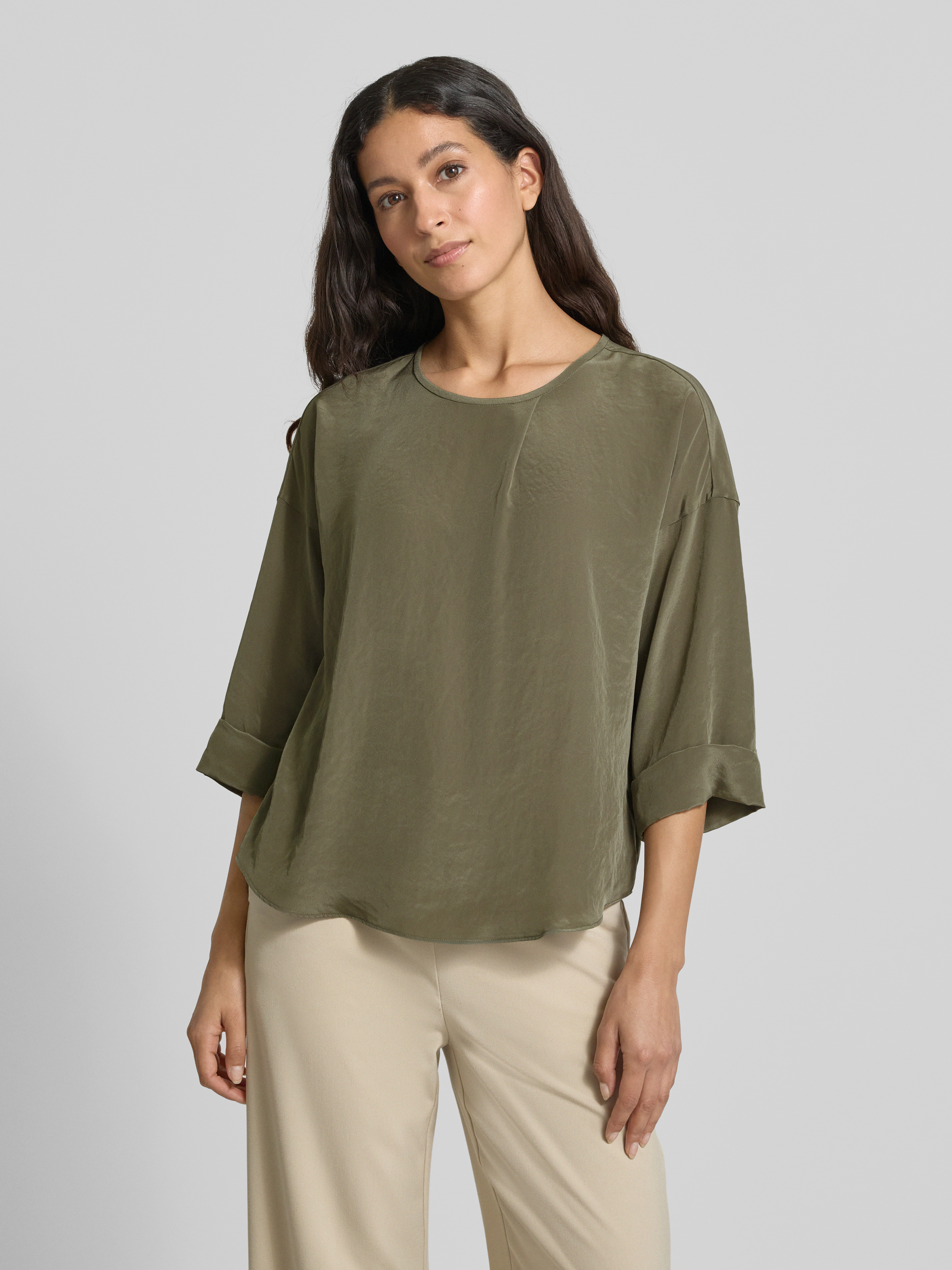 Das Blusenshirt von Luisa Cerano kombiniert einen lockeren Schnitt mit einem eleganten Rundhalsausschnitt und Dreiviertel-Ärmeln, was es vielseitig und angenehm tragbar macht. Durch seine fließende Form eignet es sich ideal für entspannte Tage oder den Büroalltag. Die sanfte Silhouette sorgt für einen stilvollen und zugleich lässigen Look.