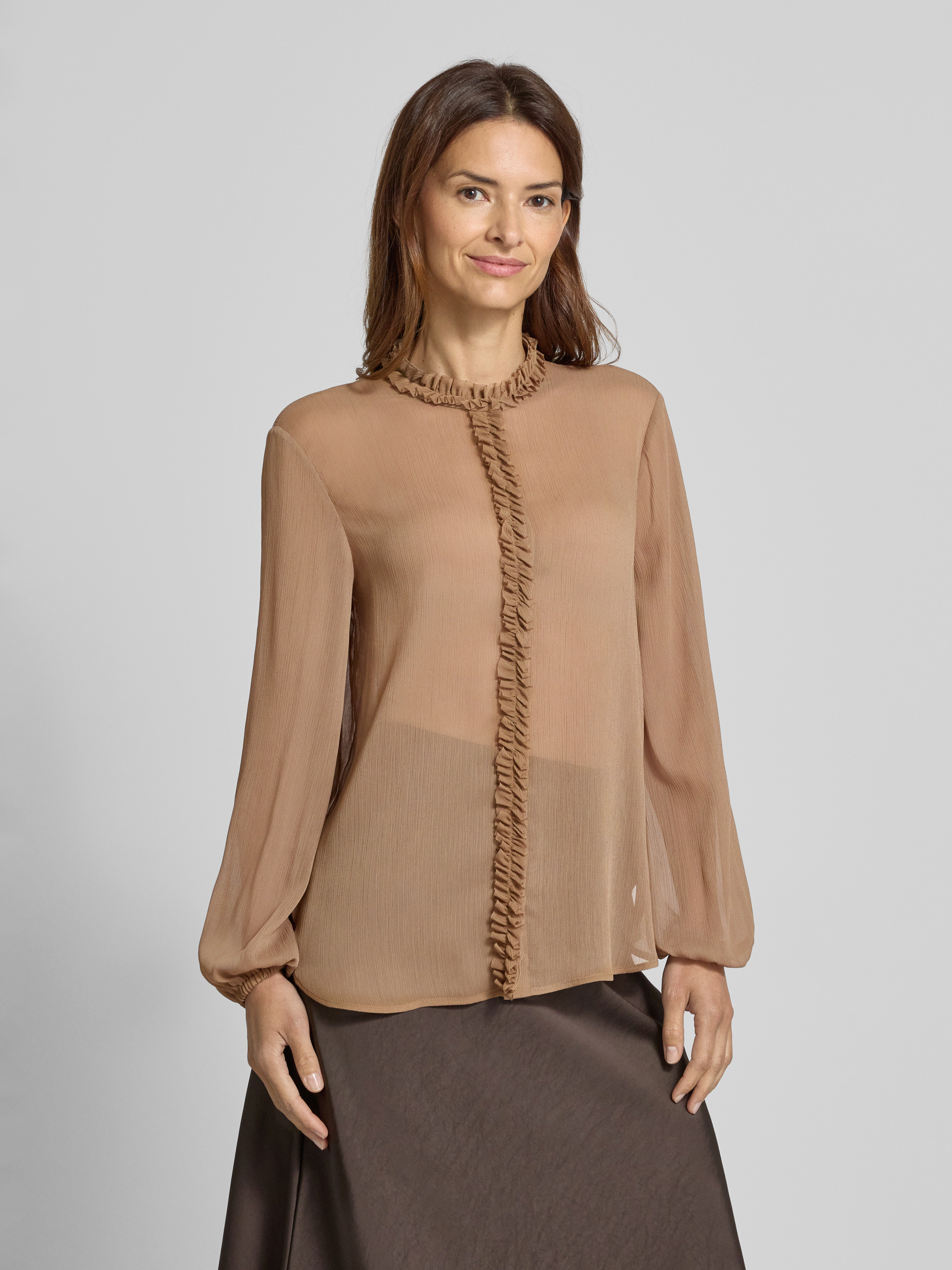 Die semitransparente Bluse von Luisa Cerano vereint durch ihren Regular Fit und den eleganten Stehkragen einen zeitlosen Look mit hohem Tragekomfort. Zarte Rüschen verleihen dem Design eine verspielte Note, während die leichte Transparenz subtile Akzente setzt und vielseitige Kombinationsmöglichkeiten eröffnet.
