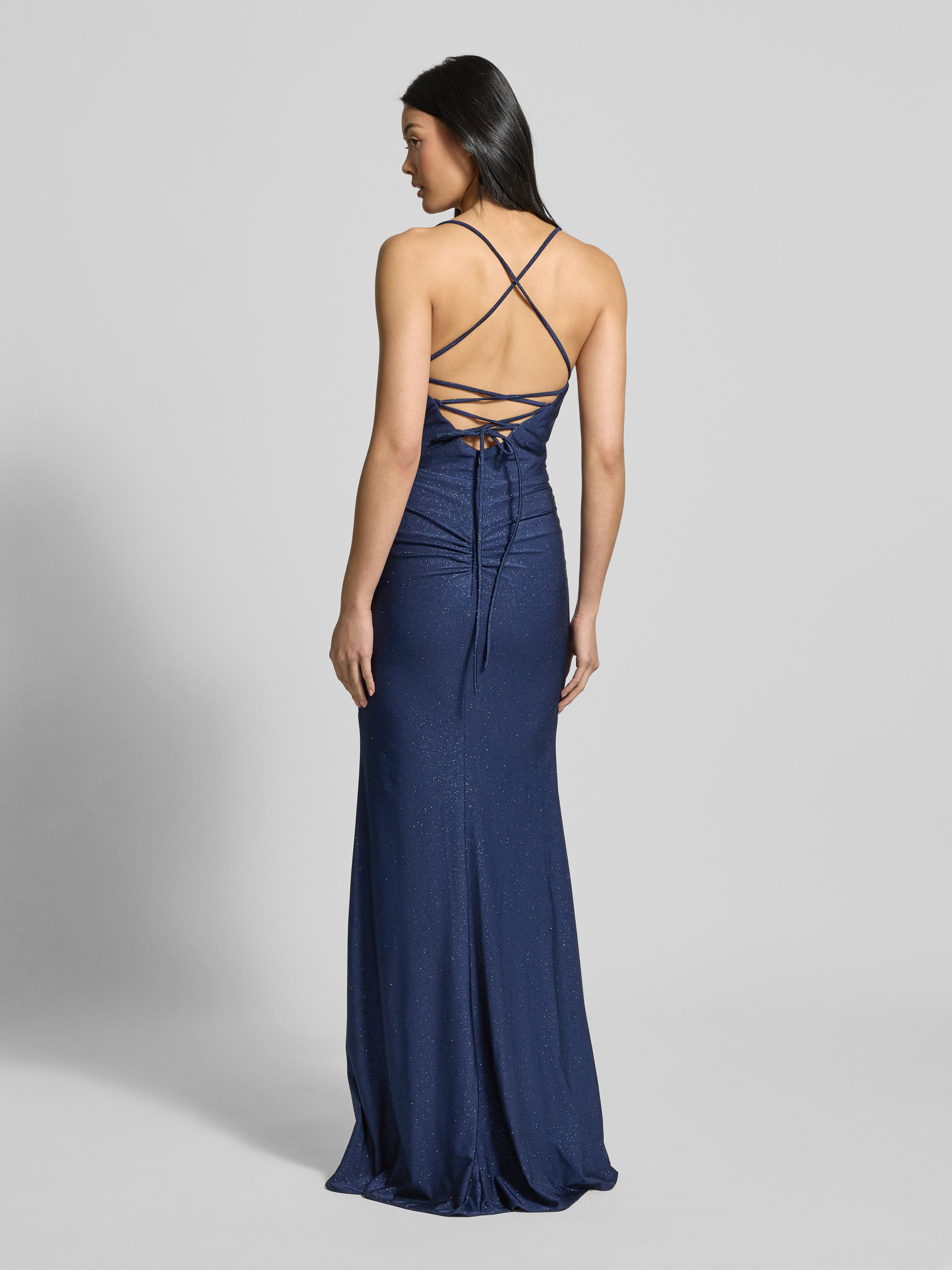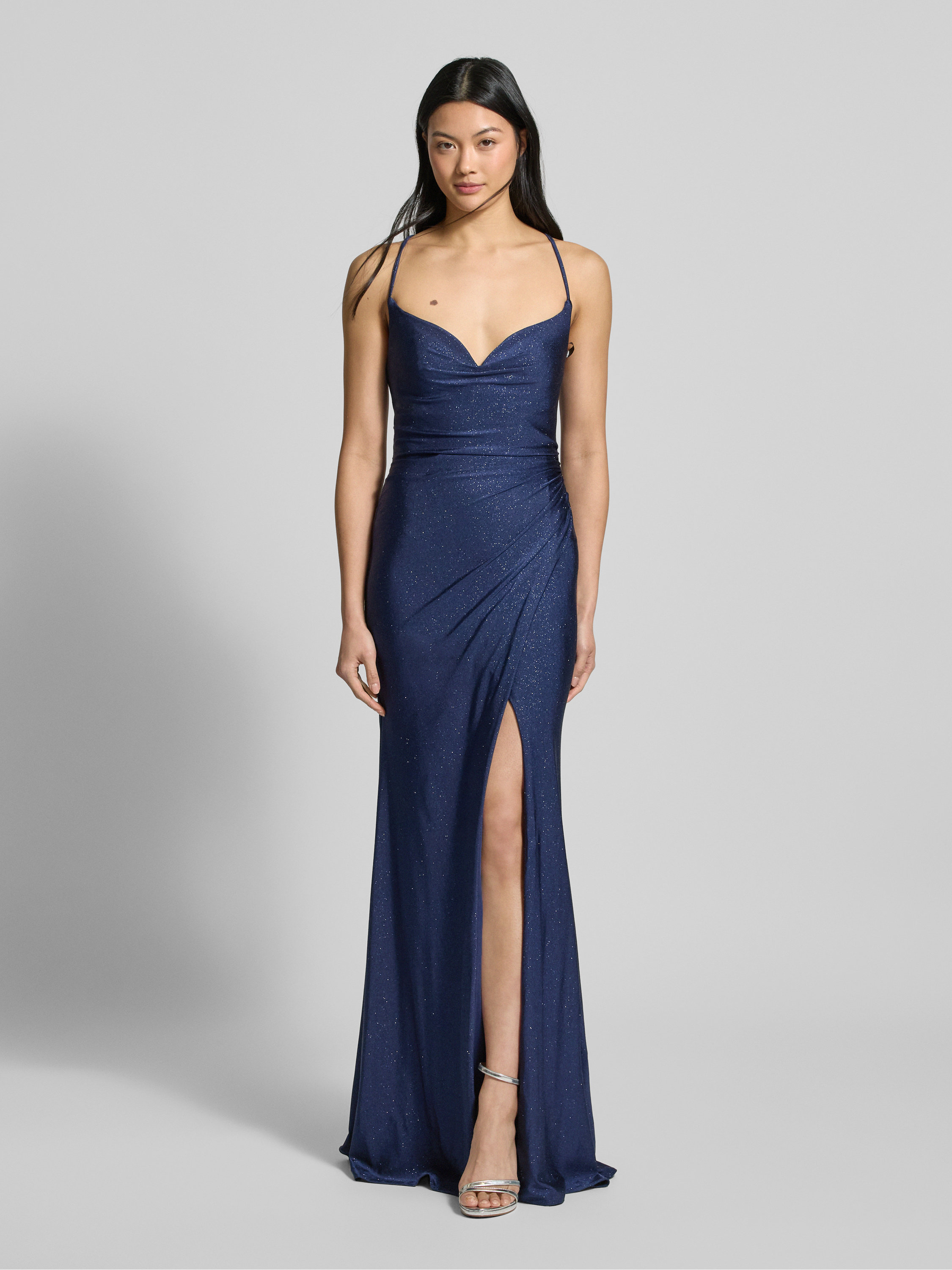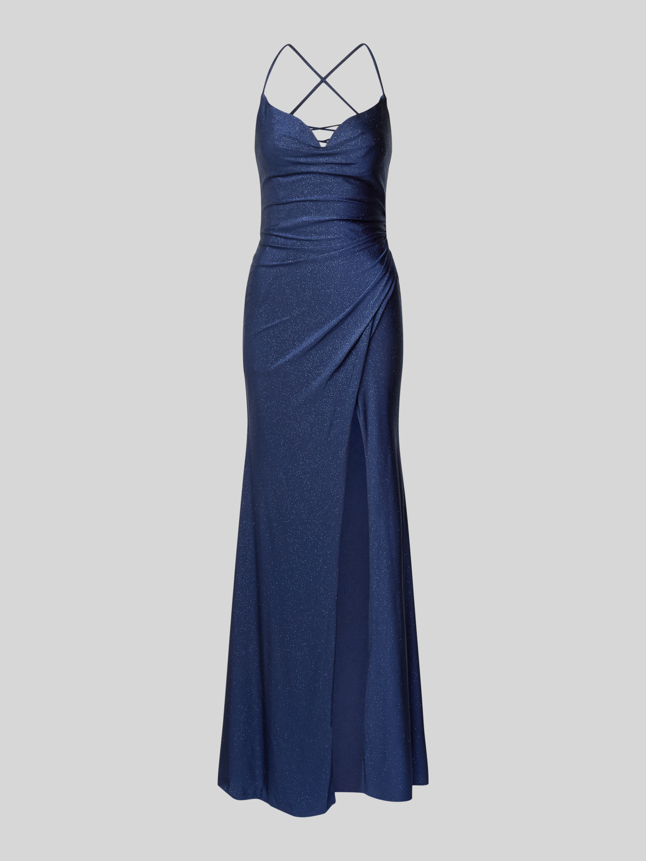 Das elegante Abendkleid von LUXUAR FASHION zieht mit seiner glitzernden Optik und dem tiefen Herz-Ausschnitt Blicke auf sich. Die eng anliegende Passform und die raffinierte Wickel-Optik schmeicheln der Silhouette. Spaghettiträger und ein gekreuzter Rücken verleihen dem Design eine besondere Note.