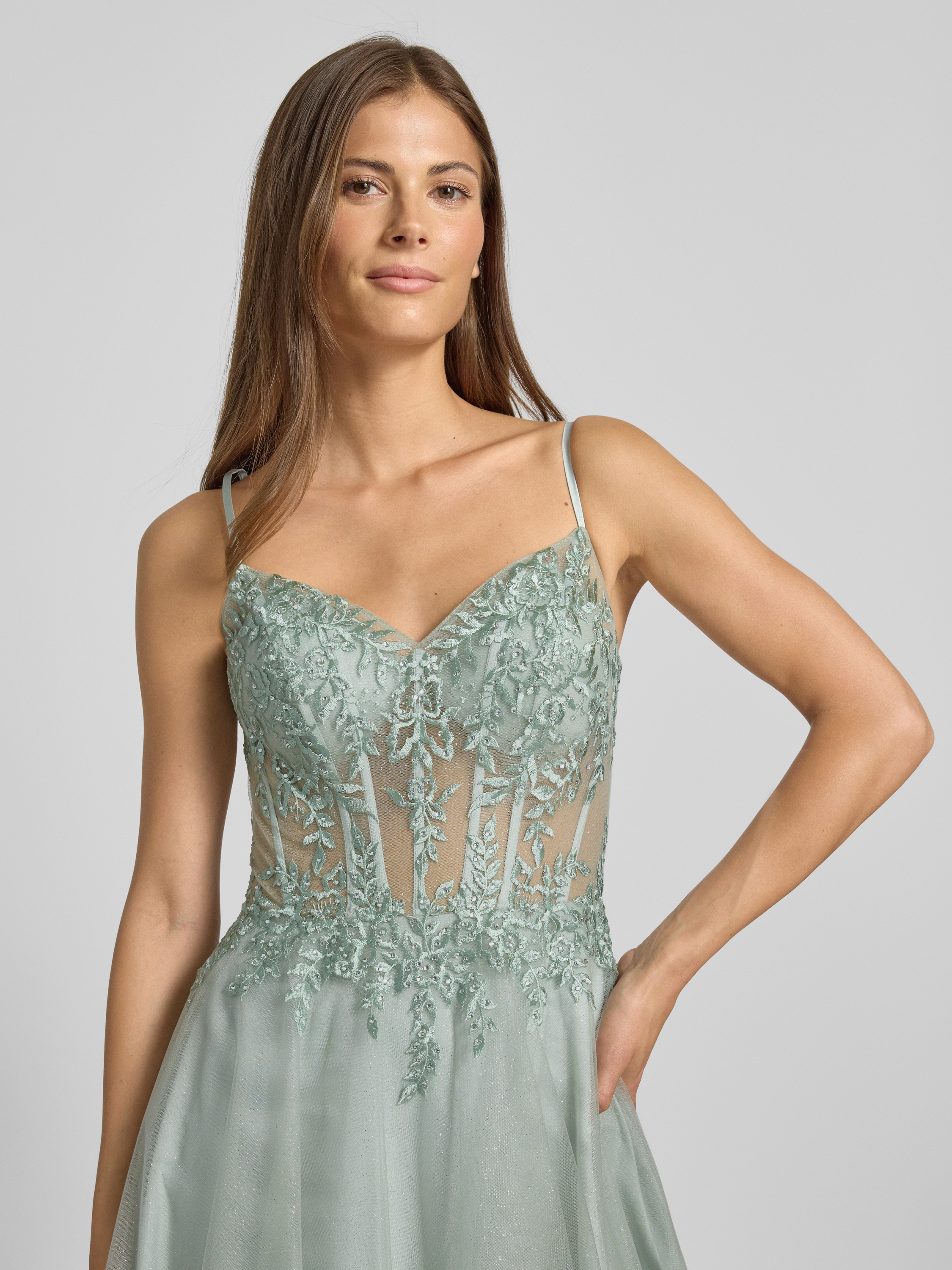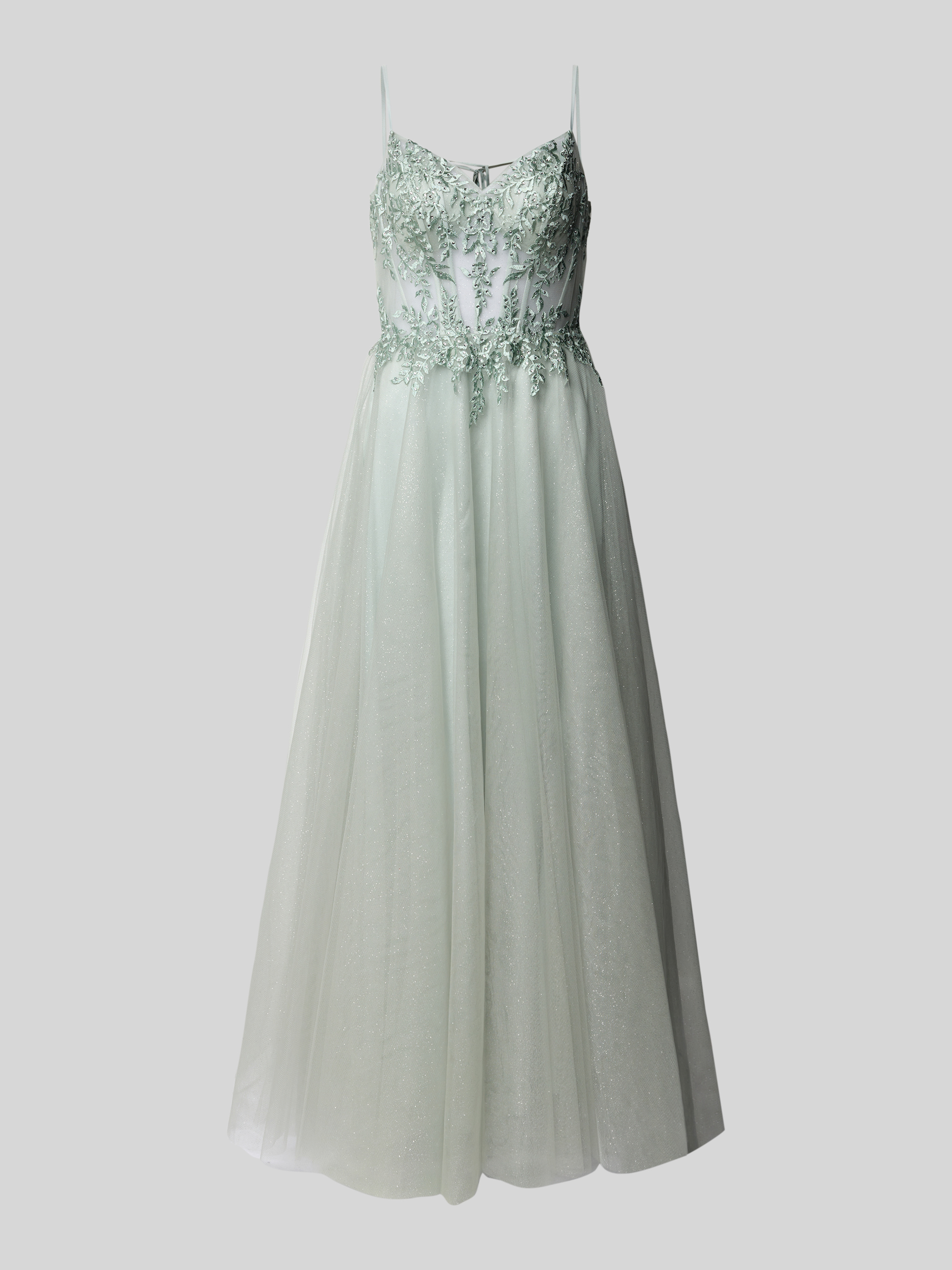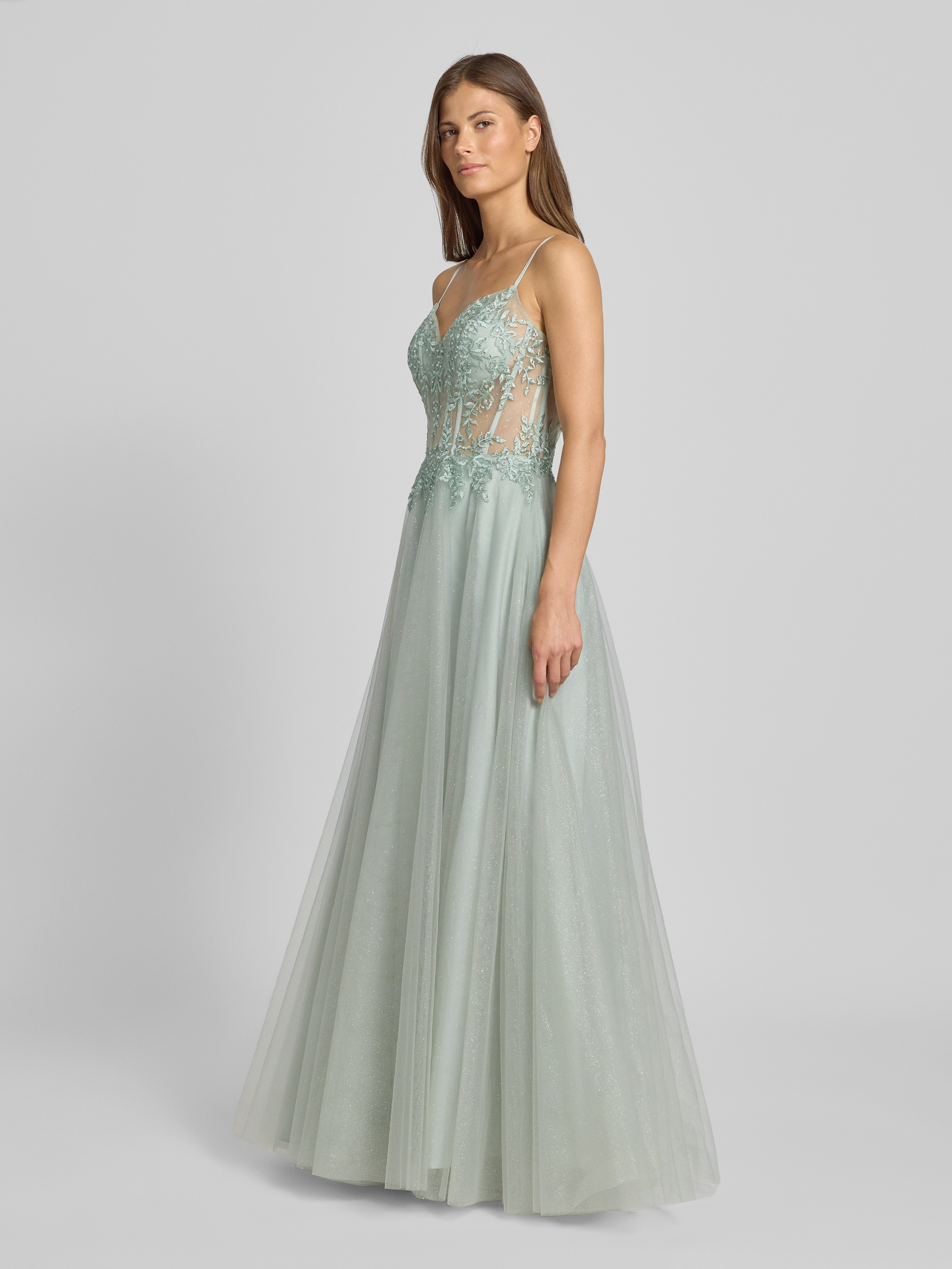 Das Abendkleid von Luxuar kombiniert edlen Tüll mit einer eleganten A-Linie und schafft so einen fließenden Look. Die Spaghettiträger und der V-Ausschnitt verleihen dem Maxikleid eine subtile Raffinesse, während der Ziersteinbesatz das Design stilvoll abrundet. Ideal für besondere Anlässe.