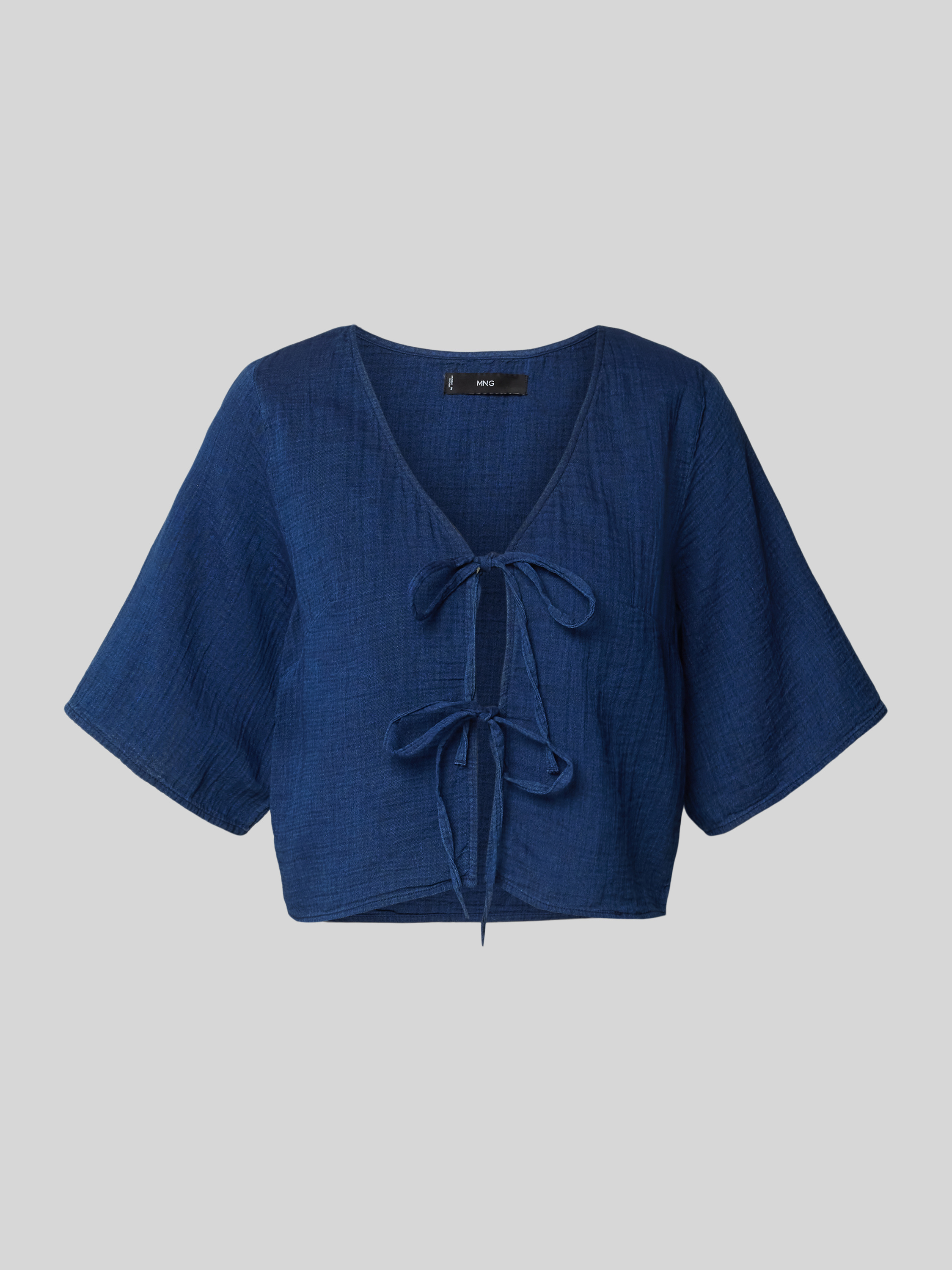 Die Cropped Hemdbluse von Mango aus reiner Baumwolle überzeugt durch ihren lockeren Schnitt und das kurzärmelige Design. Der V-Ausschnitt und der Schnürverschluss verleihen der Bluse einen legeren, modernen Look. Ideal geeignet für entspannte Tage, an denen Komfort im Vordergrund steht.