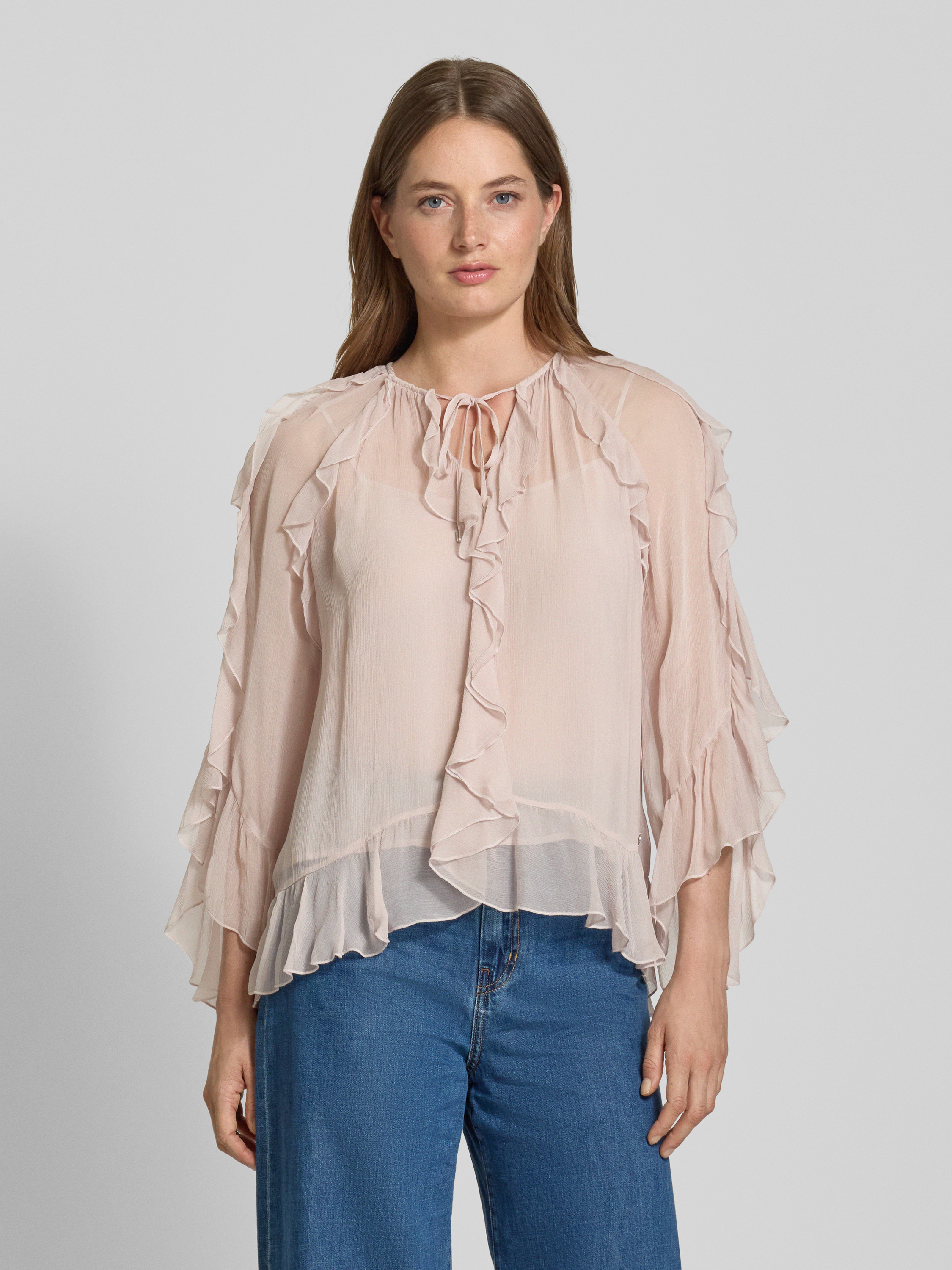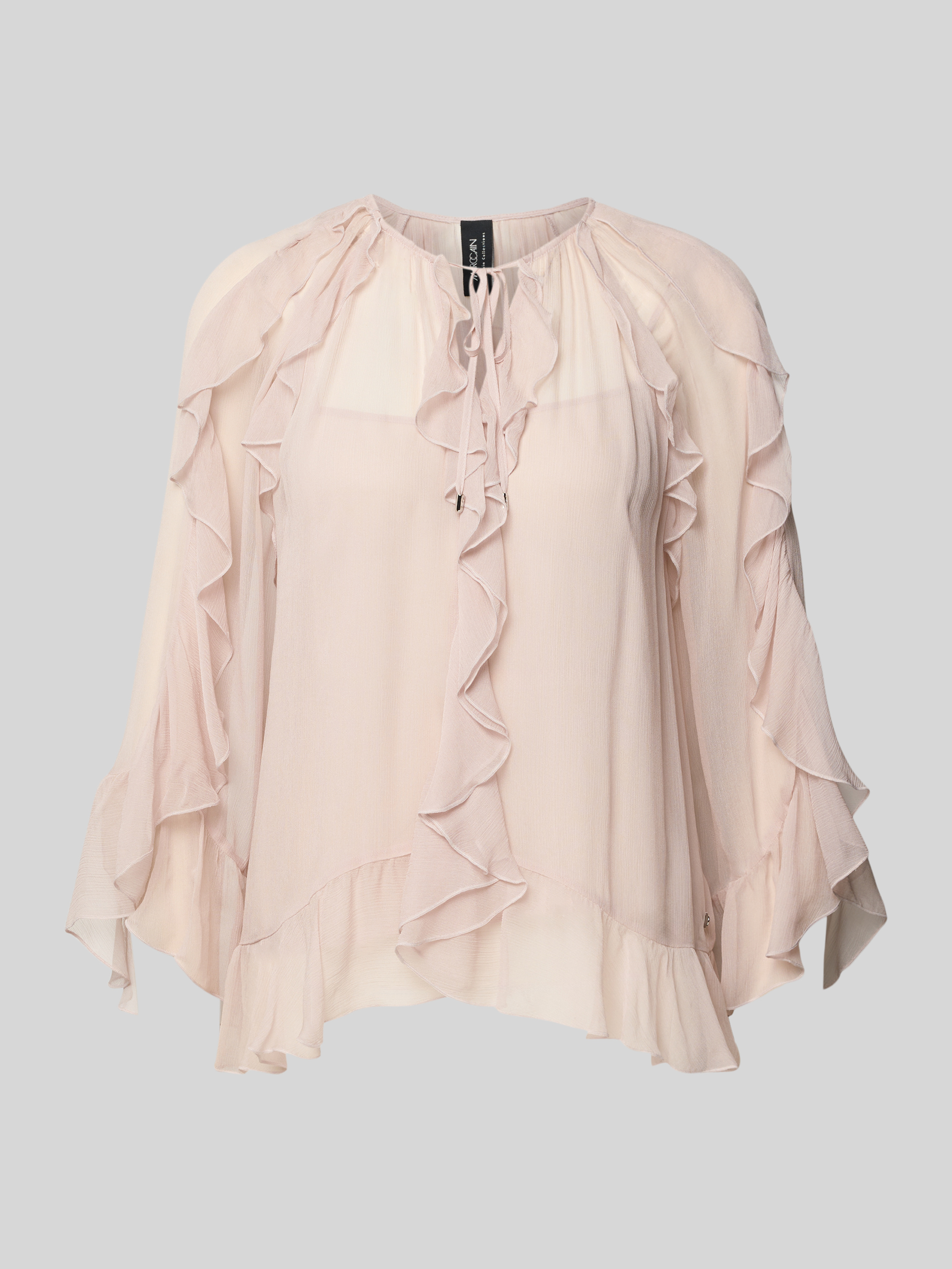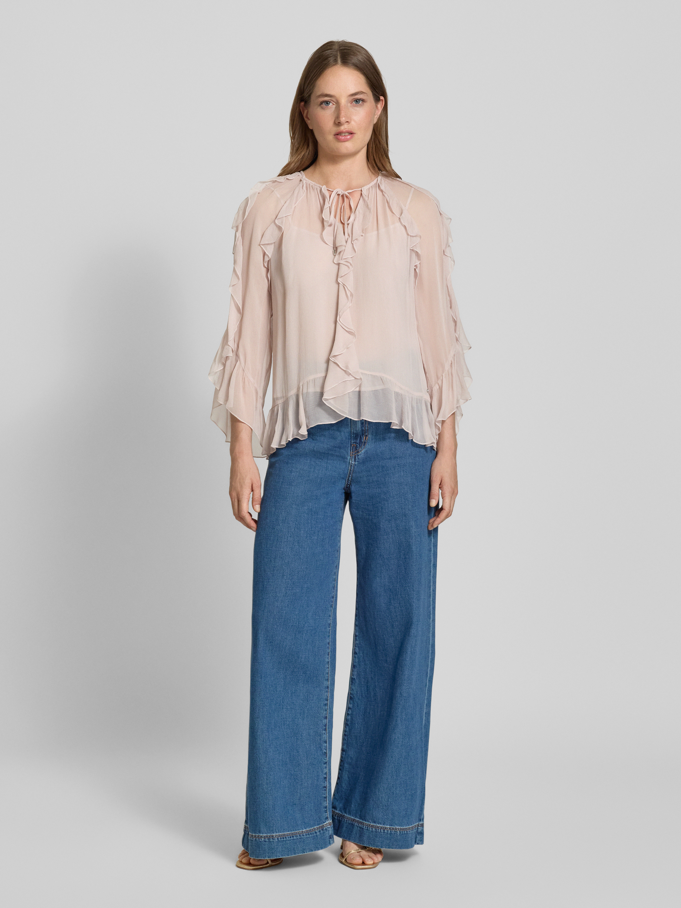 Die Bluse von Marc Cain aus reiner Viskose zeichnet sich durch ihren lockeren Schnitt und die verspielten Volants aus. Mit einem klassischen Rundhalsausschnitt bietet sie eine angenehme Passform, die sich ideal für unterschiedliche Anlässe eignet. Ein stilvolles Kleidungsstück für vielseitige Outfits.