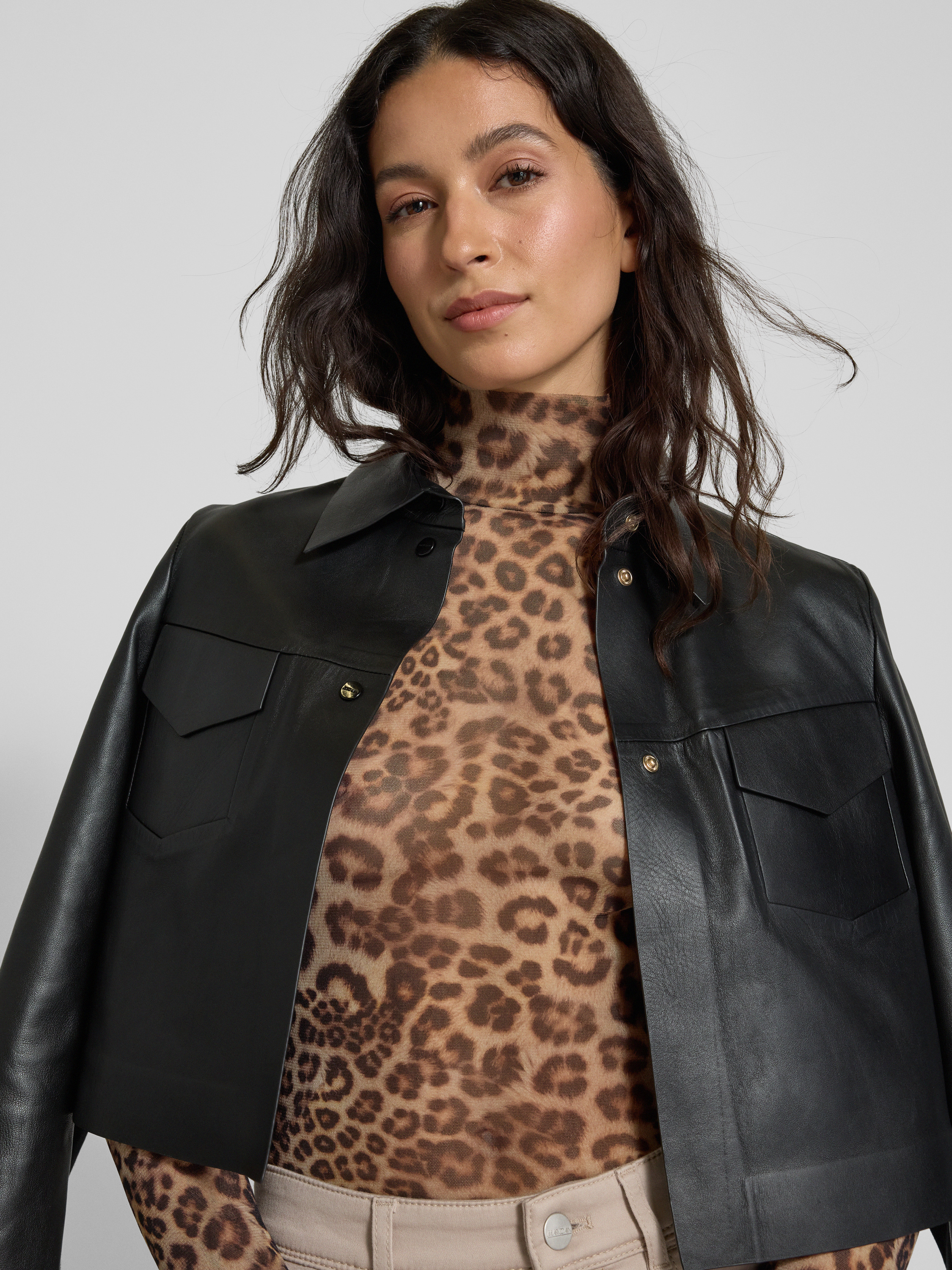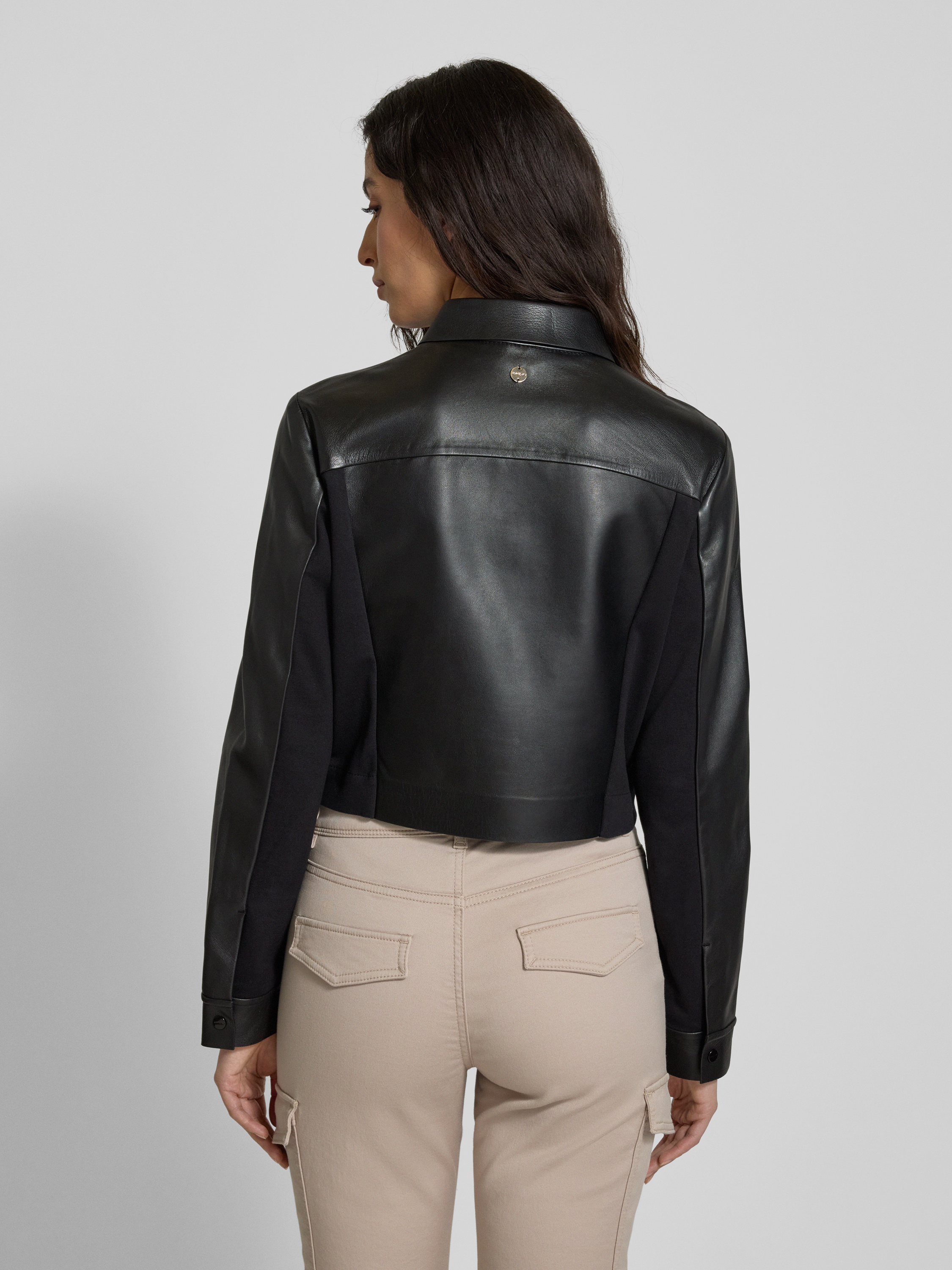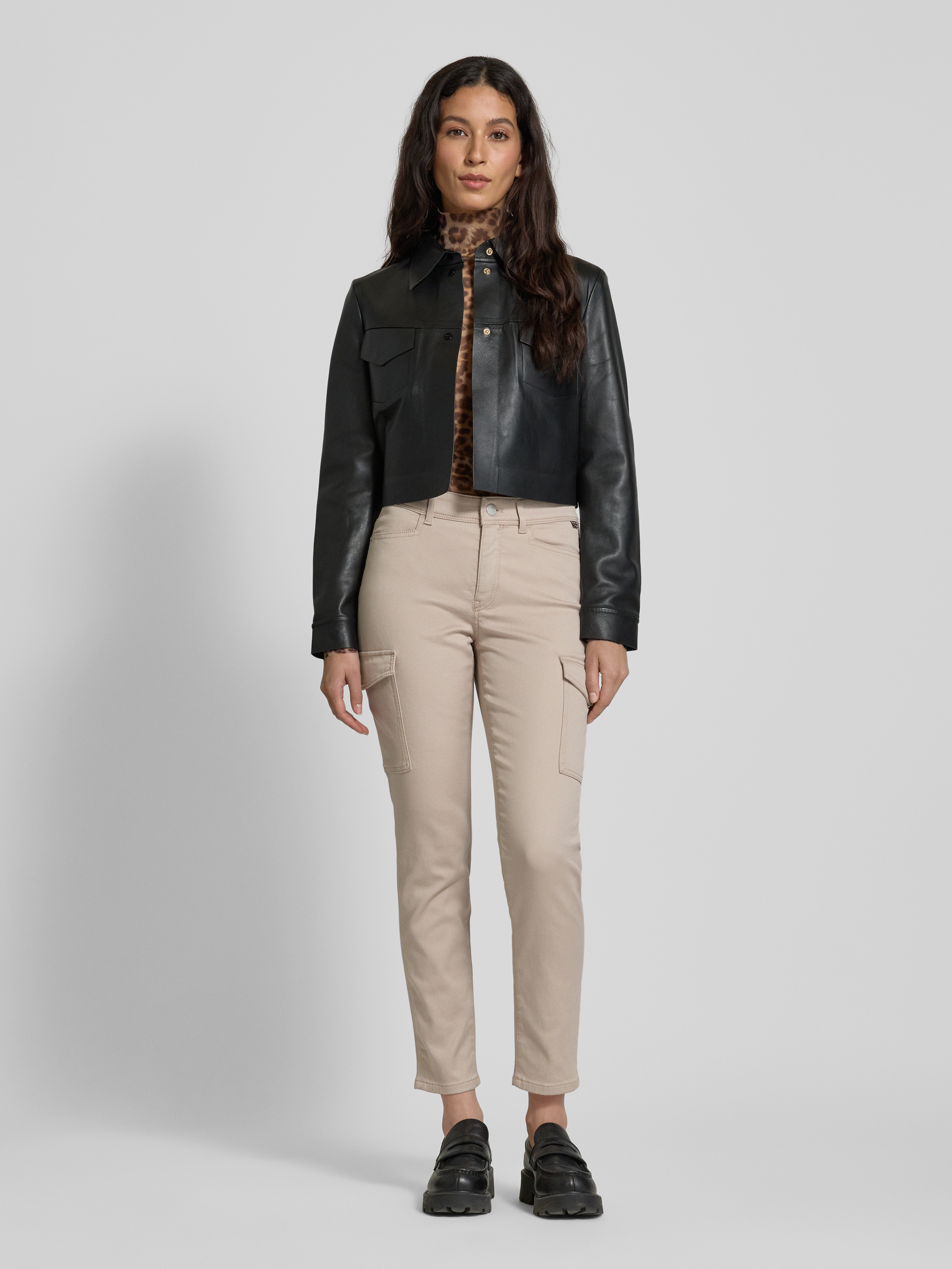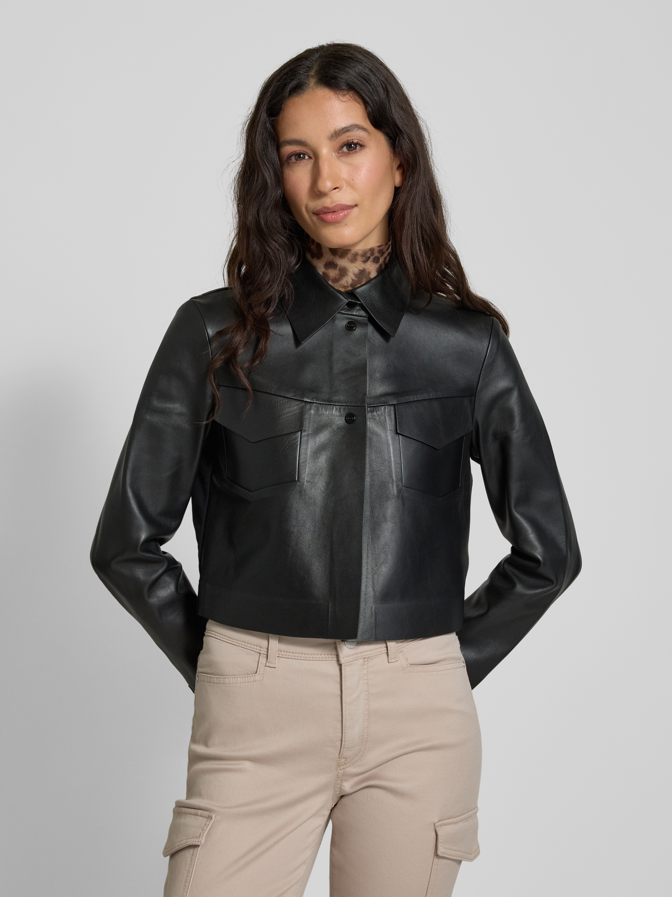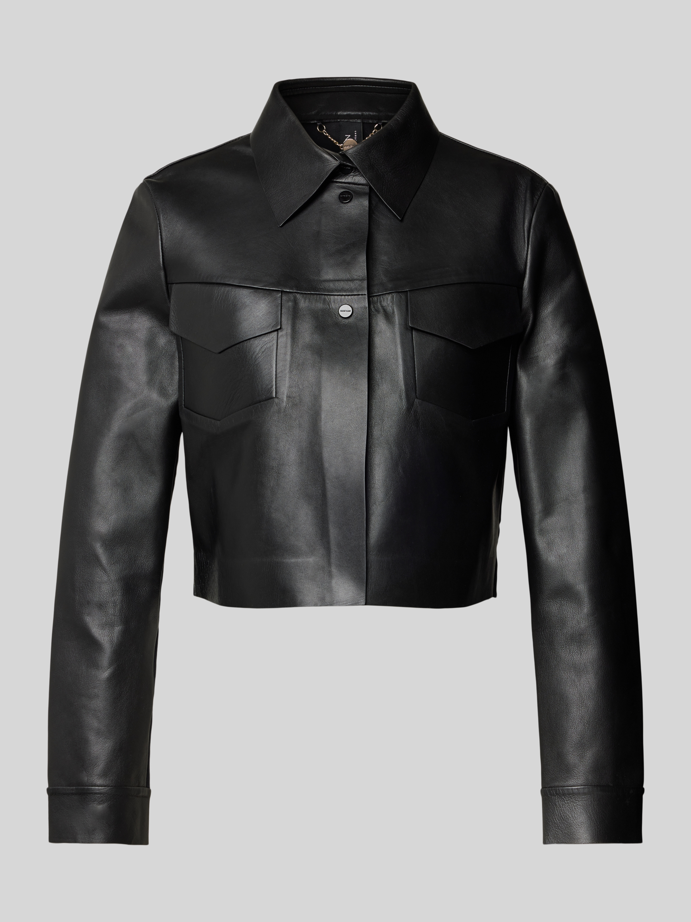 Die Damenjacke von Marc Cain kombiniert einen geraden Schnitt mit einem eleganten Umlegekragen und vereint so lässige Eleganz mit zeitlosem Stil. Der Baumwoll-Elasthan-Mix sorgt für angenehmen Tragekomfort, während die Leder-Optik einen modischen Akzent setzt. Ideal für vielseitige Looks.
