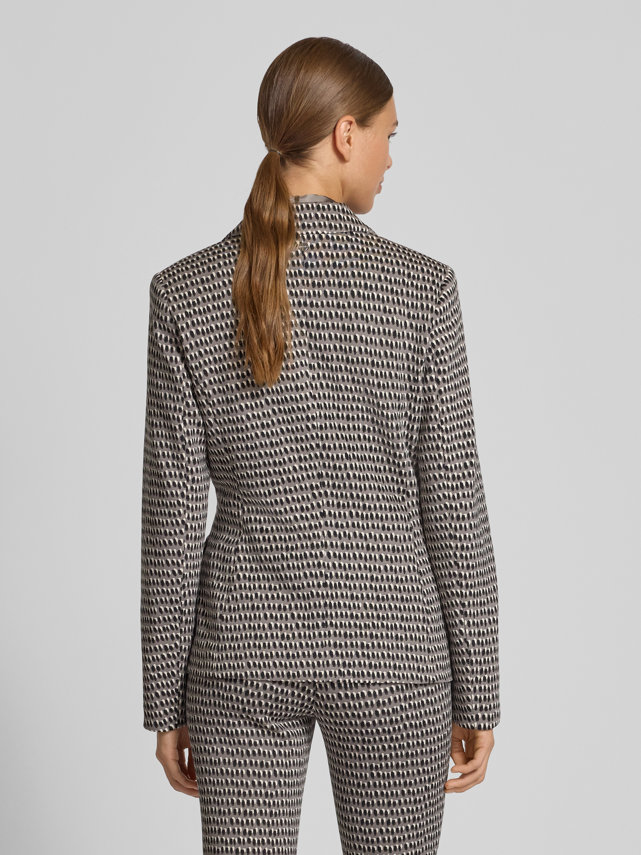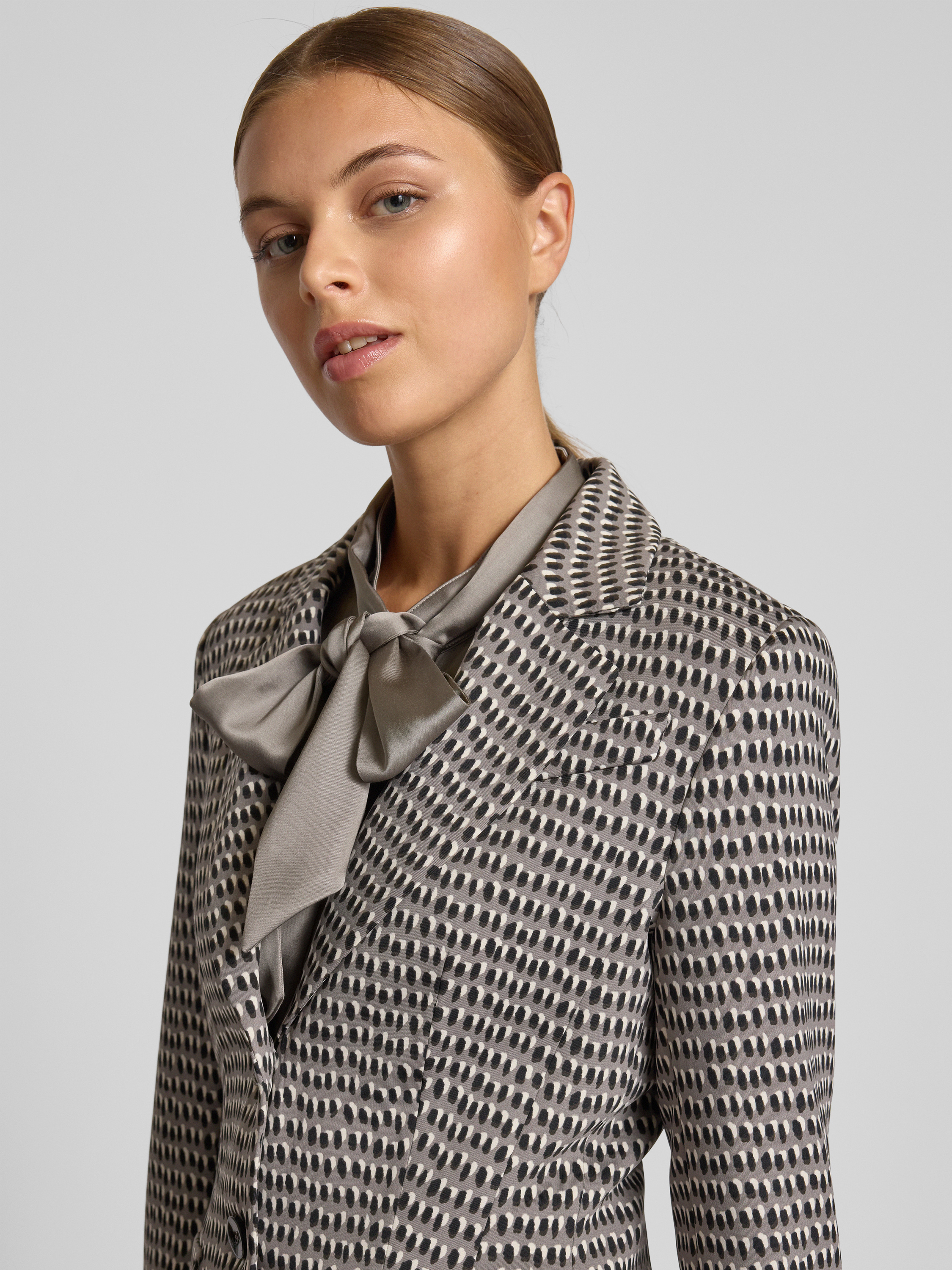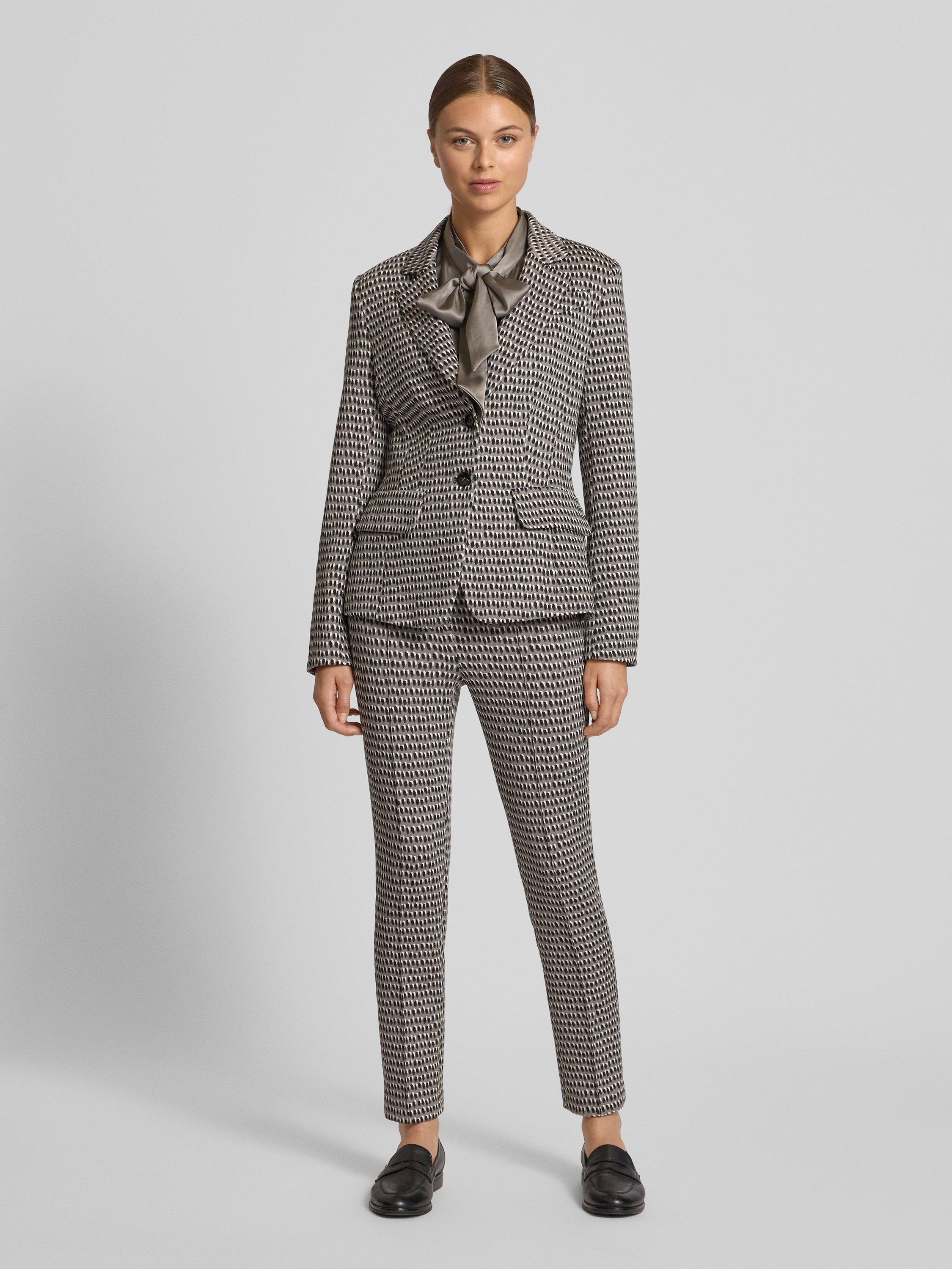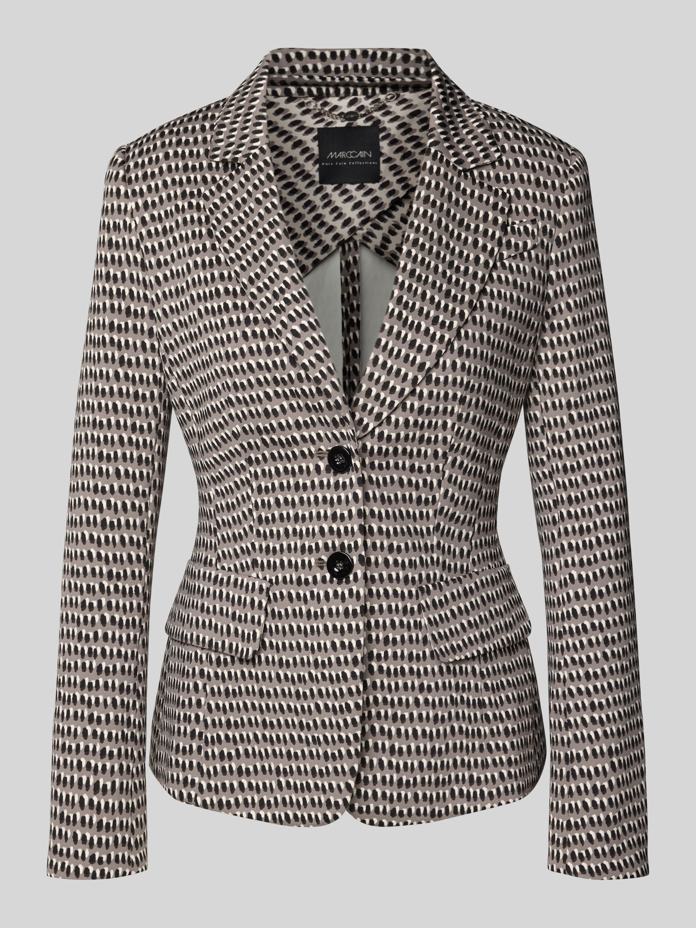 Der Damen-Blazer von Marc Cain präsentiert sich im schlanken Schnitt und liegt angenehm am Körper an. Durch den elastischen Material-Mix passt er sich den Bewegungen mühelos an, während der Reverskragen und die Doppelknopfleiste dem Modell einen klassischen Akzent verleihen. Paspeltaschen runden das Gesamtbild harmonisch ab.