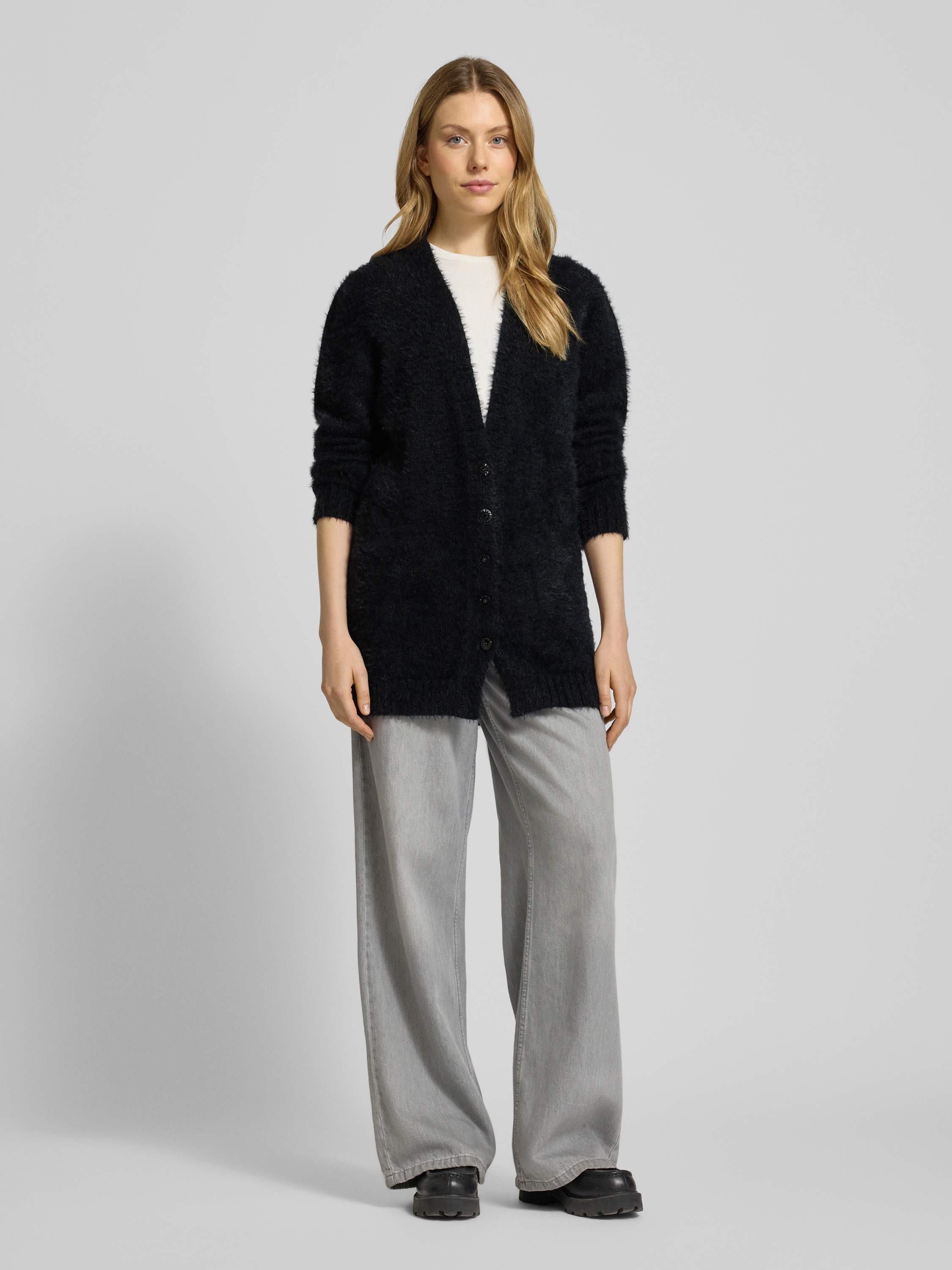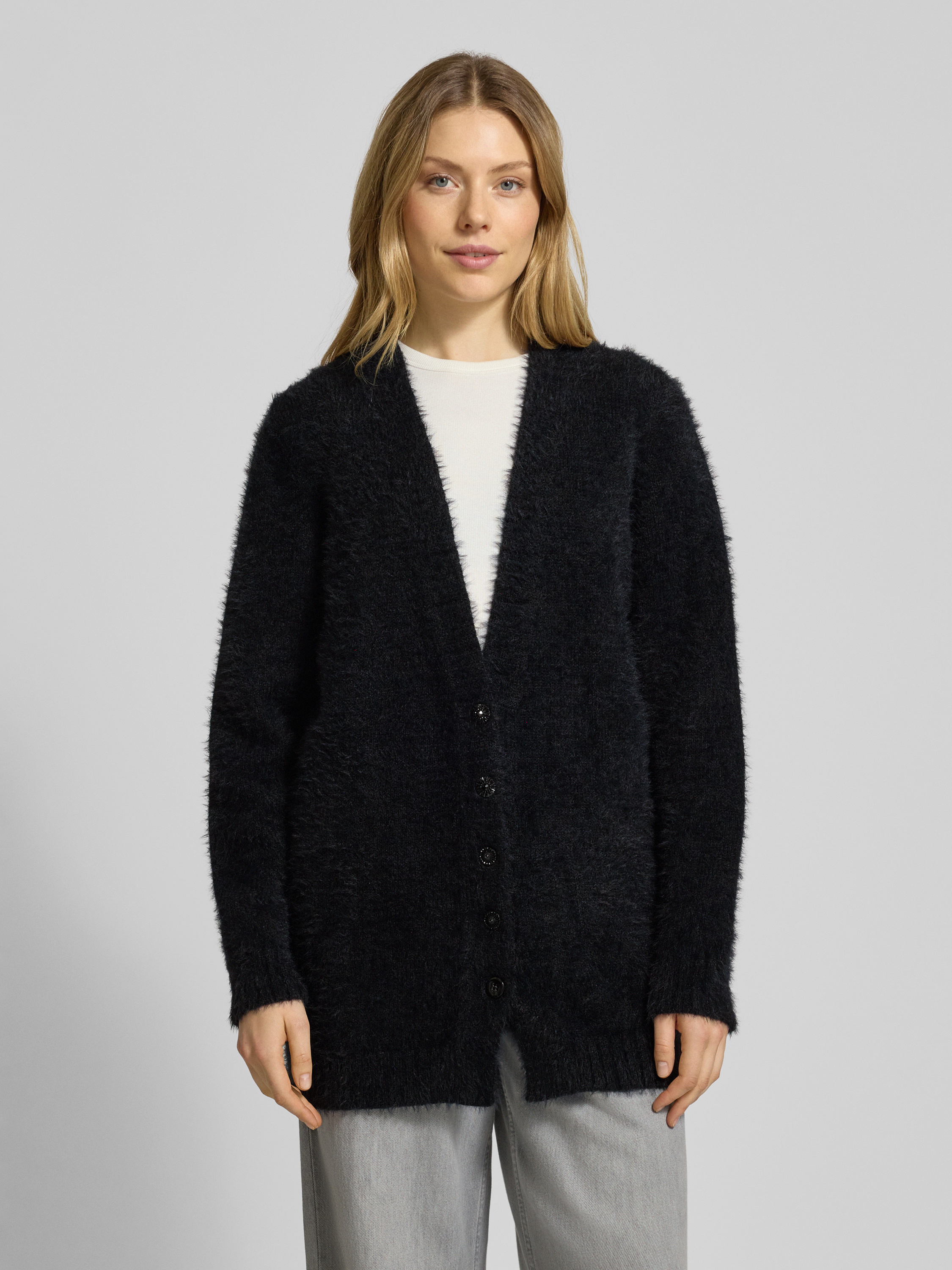 Die Damen Strickjacke von Marc Cain aus reiner Baumwolle zeigt sich im entspannten Relaxed-Fit und sorgt durch das Effektgarn für interessante Akzente. Dank des V-Ausschnitts wirkt der Schnitt angenehm lässig, während die Knopfleiste vielseitiges Kombinieren ermöglicht. So entsteht im Alltag eine leichte Jacke, die Bewegungsfreiheit und Komfort schafft.