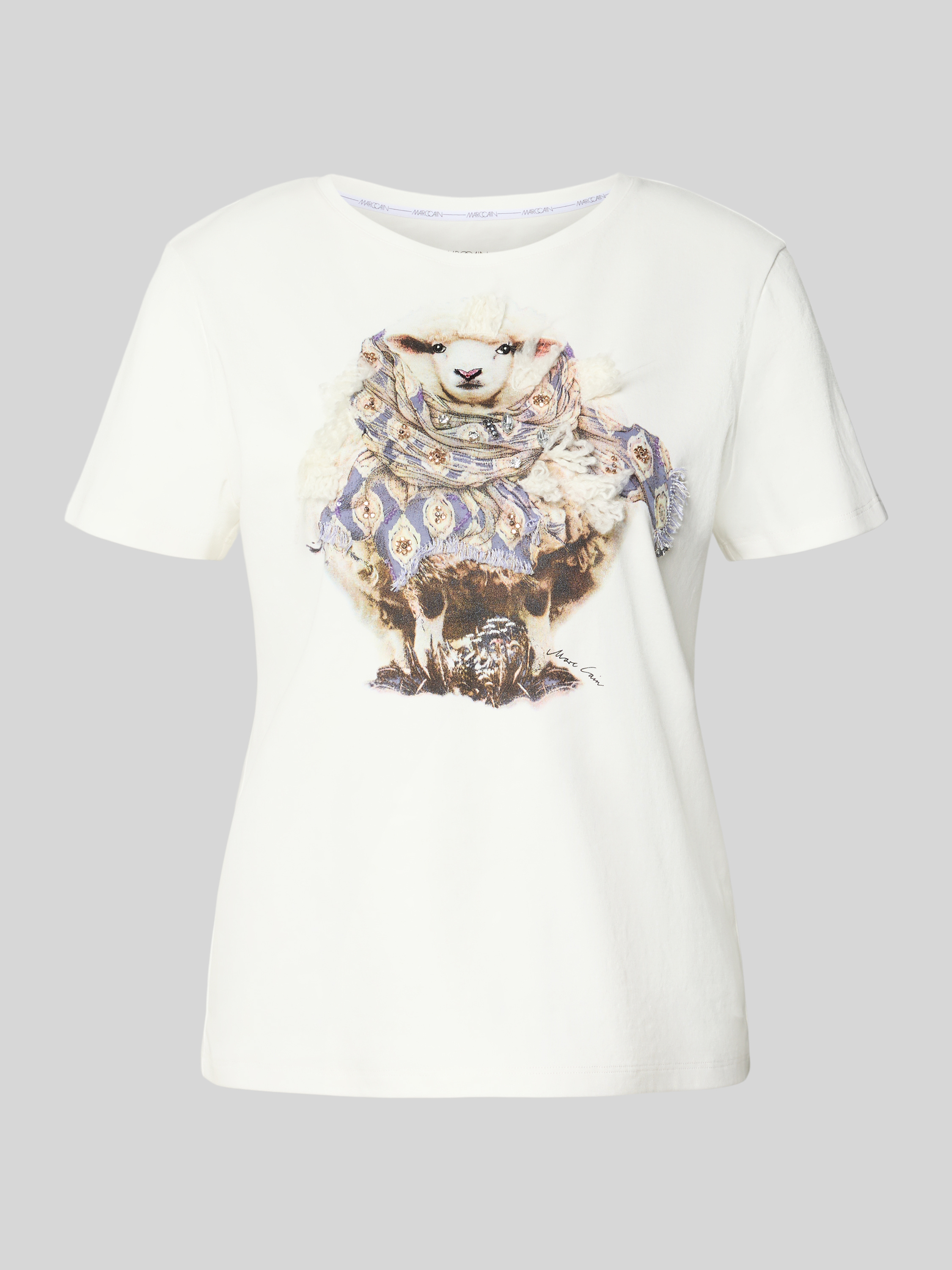Das Damen T-Shirt von Marc Cain, aus reiner Baumwolle gefertigt, bietet durch seinen geraden Schnitt und den Rundhalsausschnitt eine angenehme Passform. Das dezente Label-Detail verleiht dem Shirt einen stilvollen Akzent. Es eignet sich ideal für entspannte Alltagsoutfits.