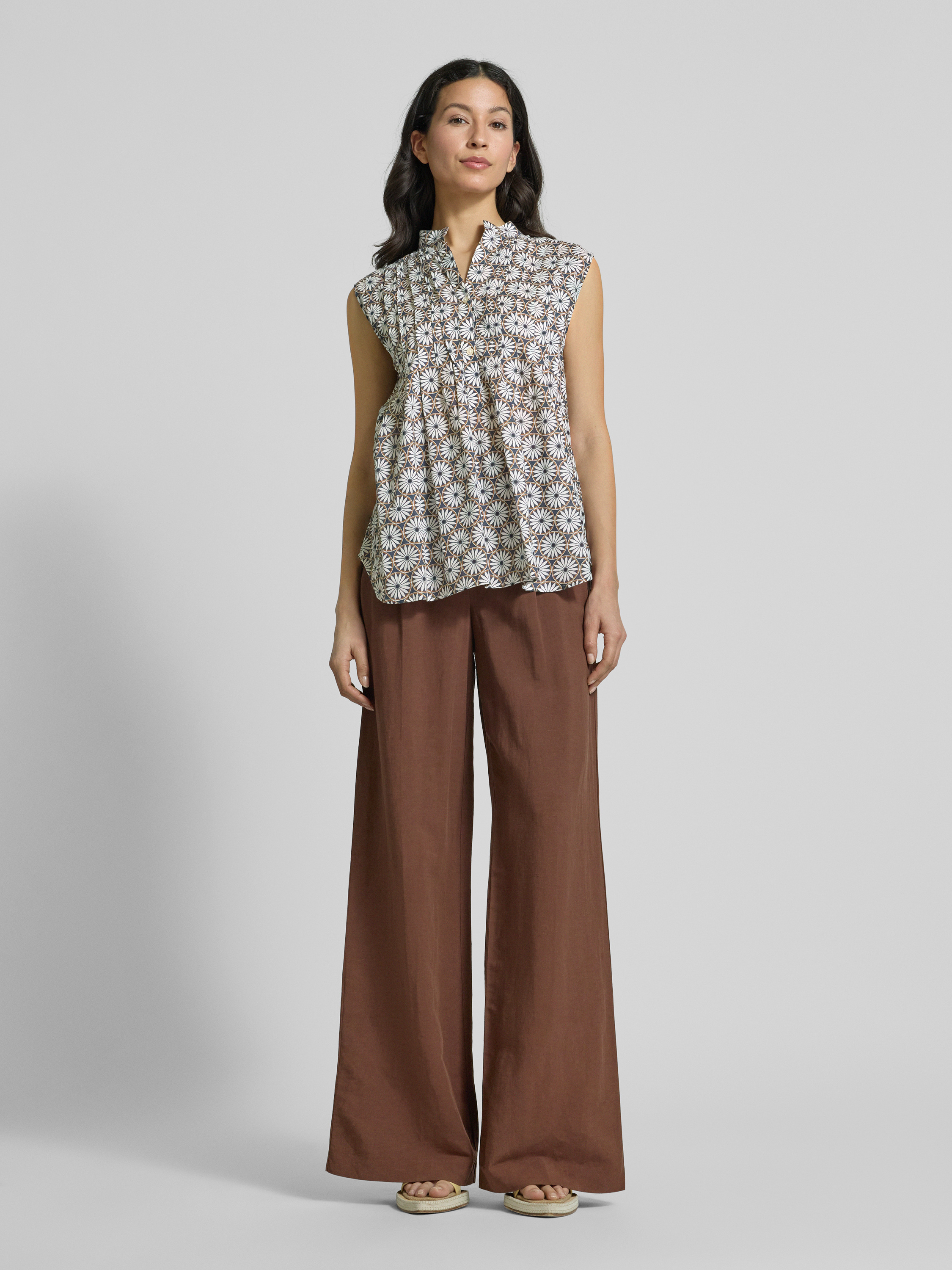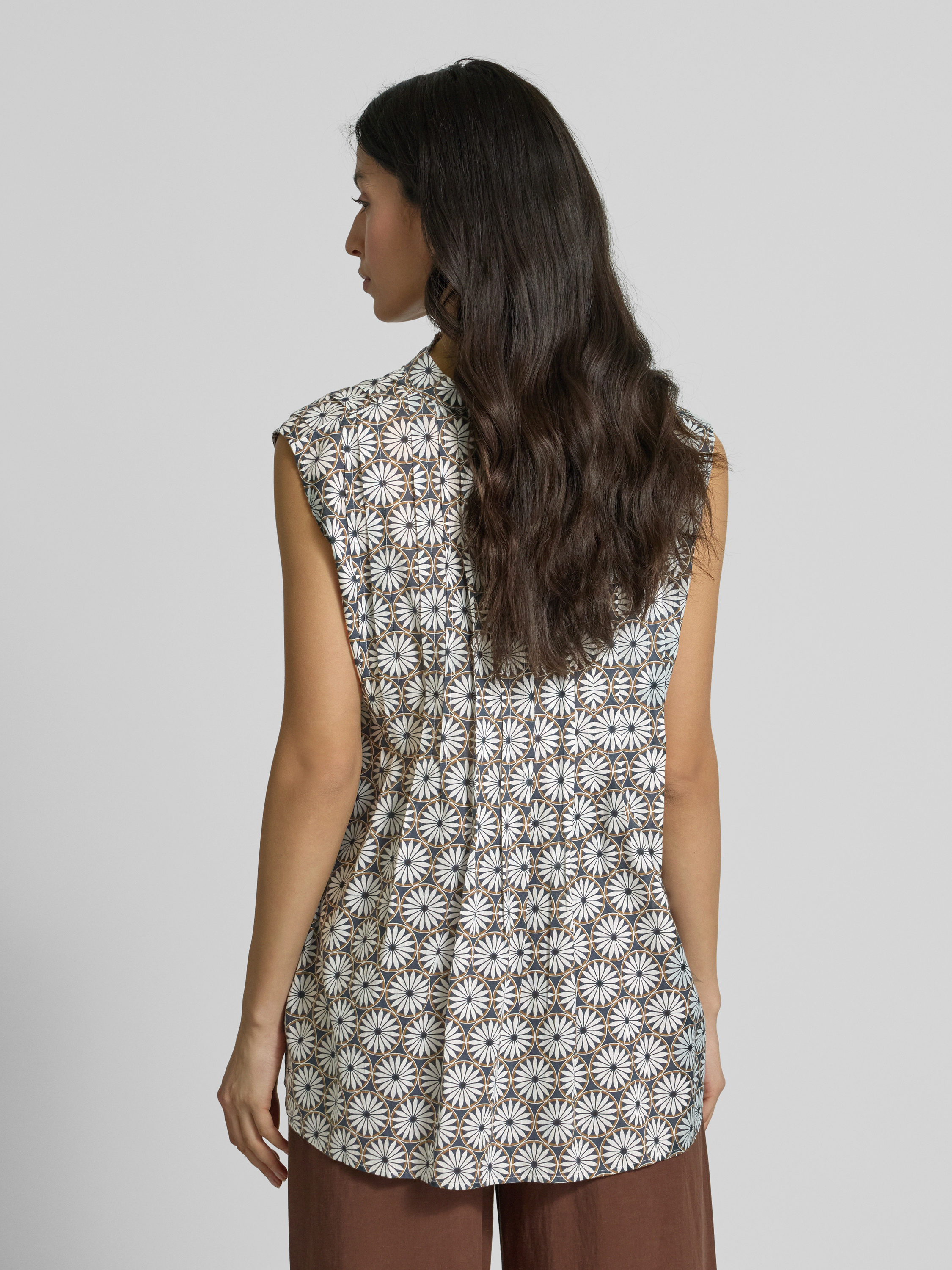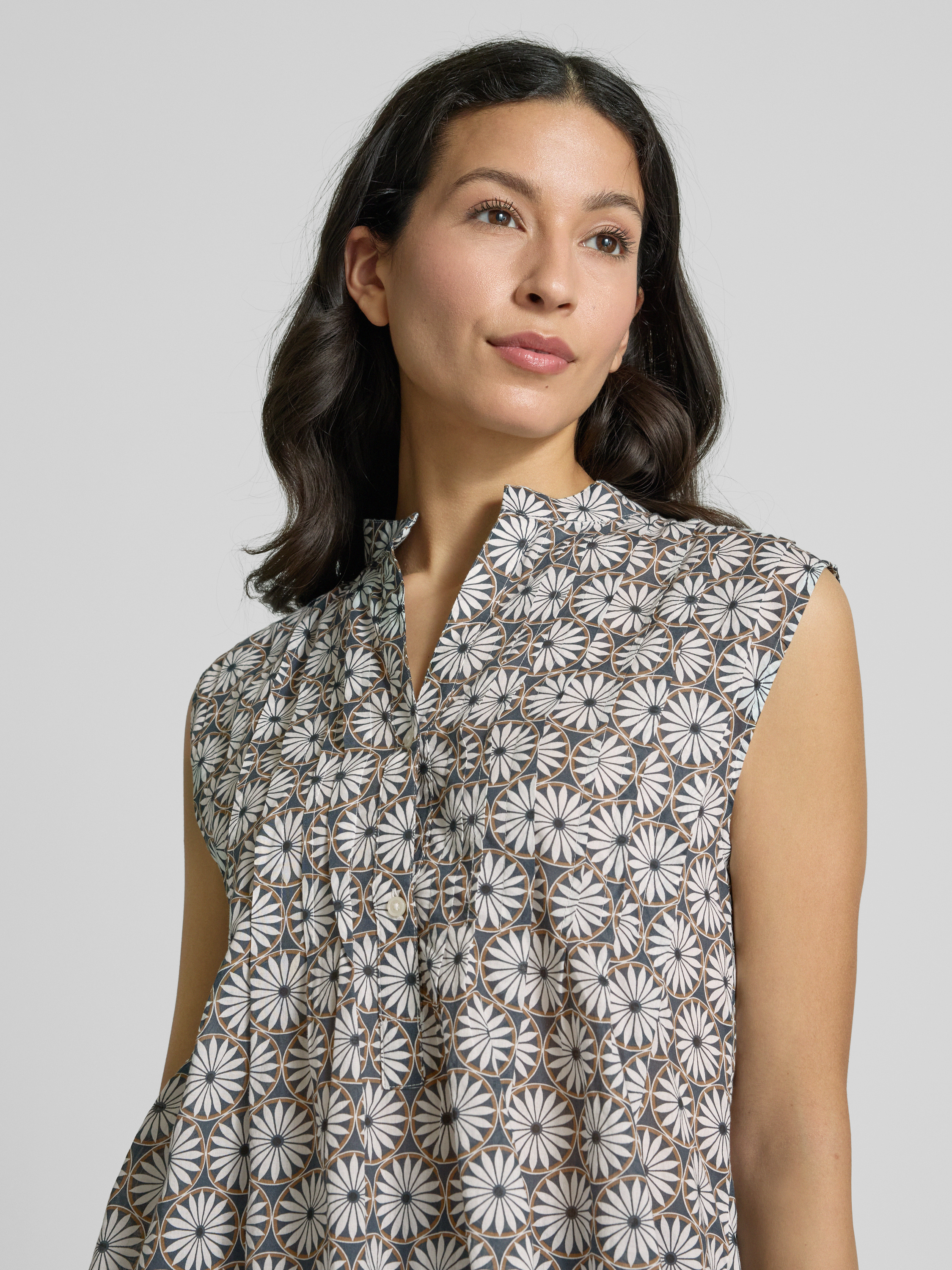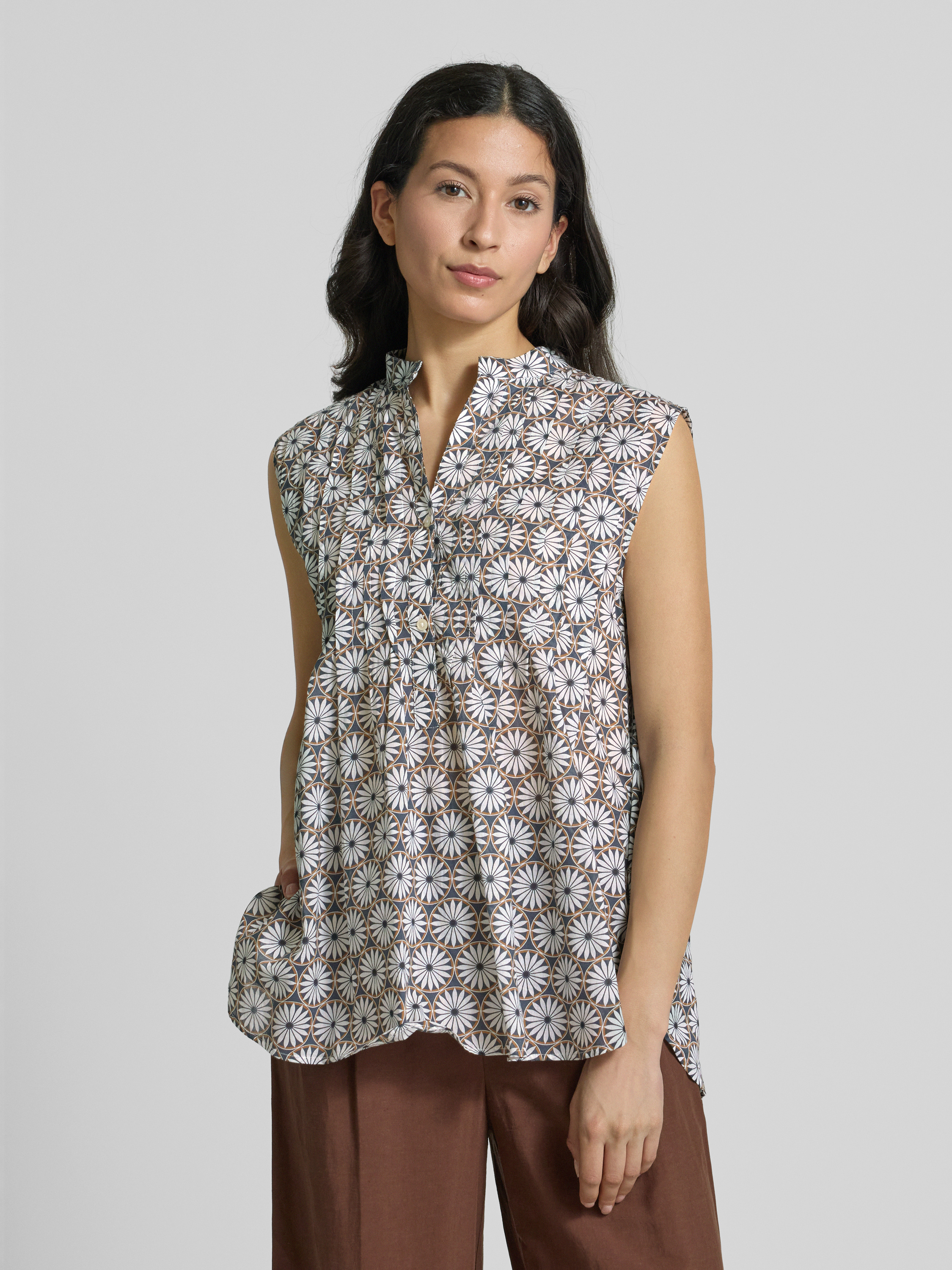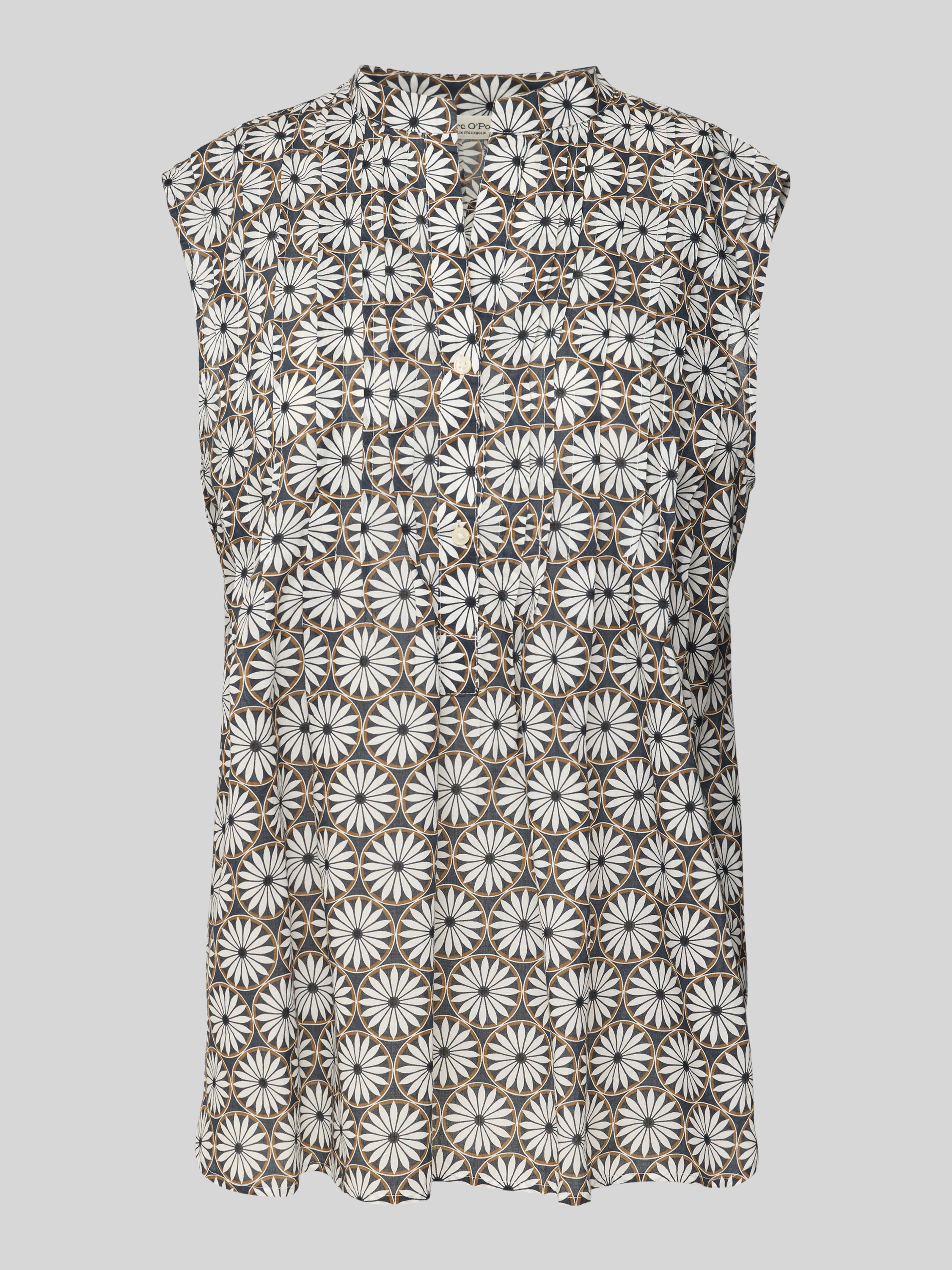Das Marc O’Polo Regular Fit Blusentop mit kurzer Knopfleiste kombiniert ein florales Allover-Muster mit ärmelloser Form und Tunika-Kragen. Durch die feine Webstruktur aus reiner Baumwolle fühlt sich das Material angenehm auf der Haut an. Die lockere Passform ermöglicht vielseitige Kombinationen im Alltag.